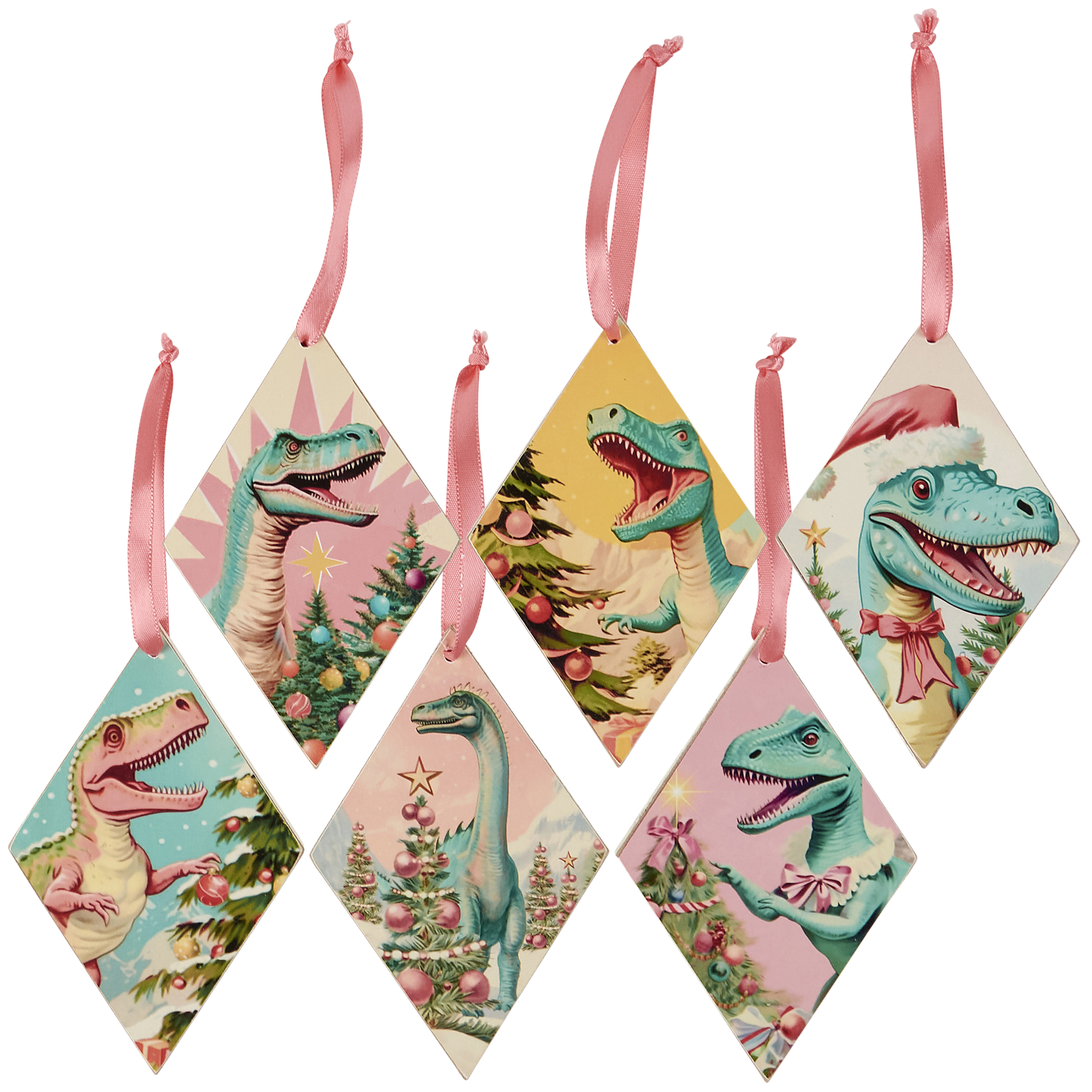 A set of wooden ornaments from our Christmas Collection featuring 6 fun dinosaur inspired holiday designs and sentiments in a retro pastel style. Retro holiday ornaments display individual designs of various dinosaurs celebrating Christmas with coordinating dinosaur-themed sentiments in the back in matching pastel color. Our Dino Christmas ornament set is easy to hang for display via attached pink ribbon hangers. Dinosaur ornament set comes packaged together in a polybag and tied with ribbon. A set of retro dinosaur-themed home accents perfect for a Christmas tree or for seasonal decorating.