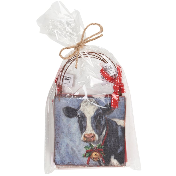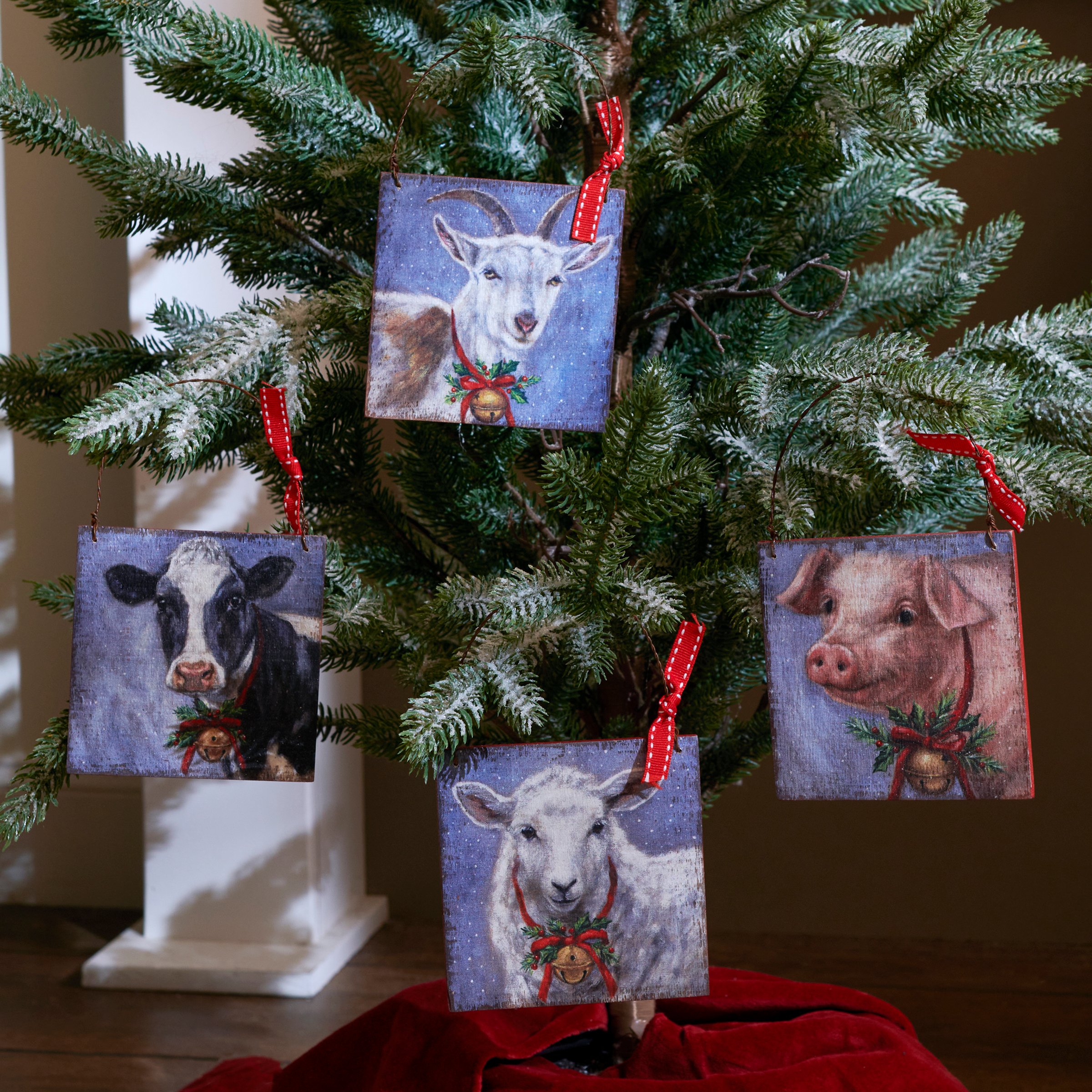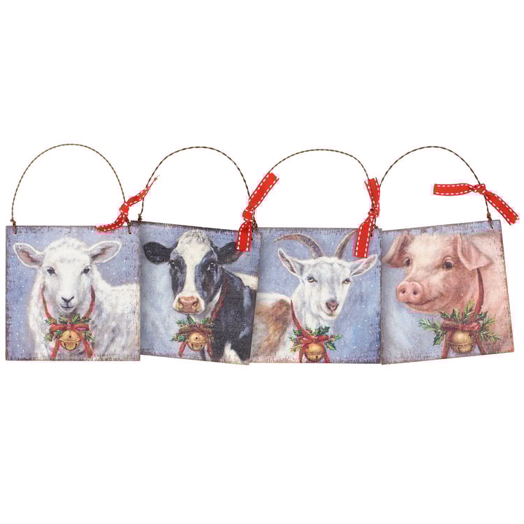 A set of wooden ornaments from our Christmas Collection displaying four charming winter scenes of various farm animals wearing festive Christmas bells. Designs are replicated from original artwork painted onto burlap canvas, giving the art a unique depth and texture. Seasonal ornaments feature distressed details with coordinating red color on the back and red cotton tape accent on hanger. Our Festive Farm ornament set is easy to hang for display via attached twisted wire hangers. Set comes packaged together in a polybag and tied with jute. A rustic set of winter-themed ornaments perfect for seasonal display.