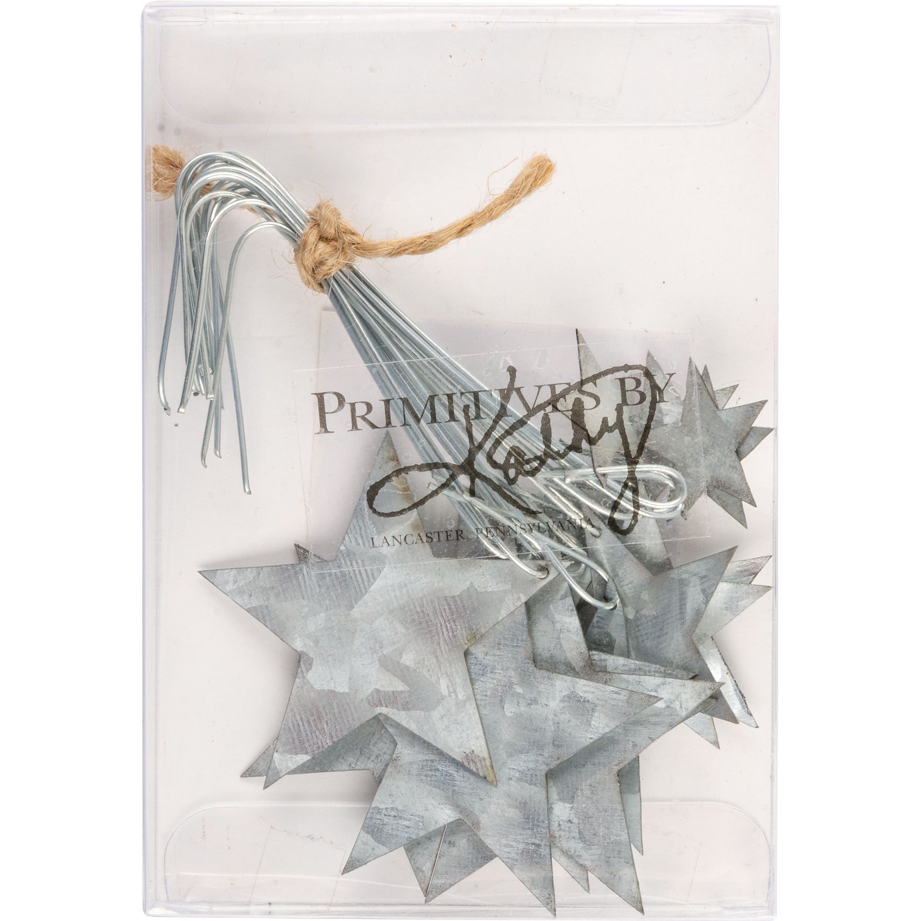 A set of 15 metal star-shaped ornaments with top wire hooks for easy hanging. Complements well with coordinating design pieces or existing decor.