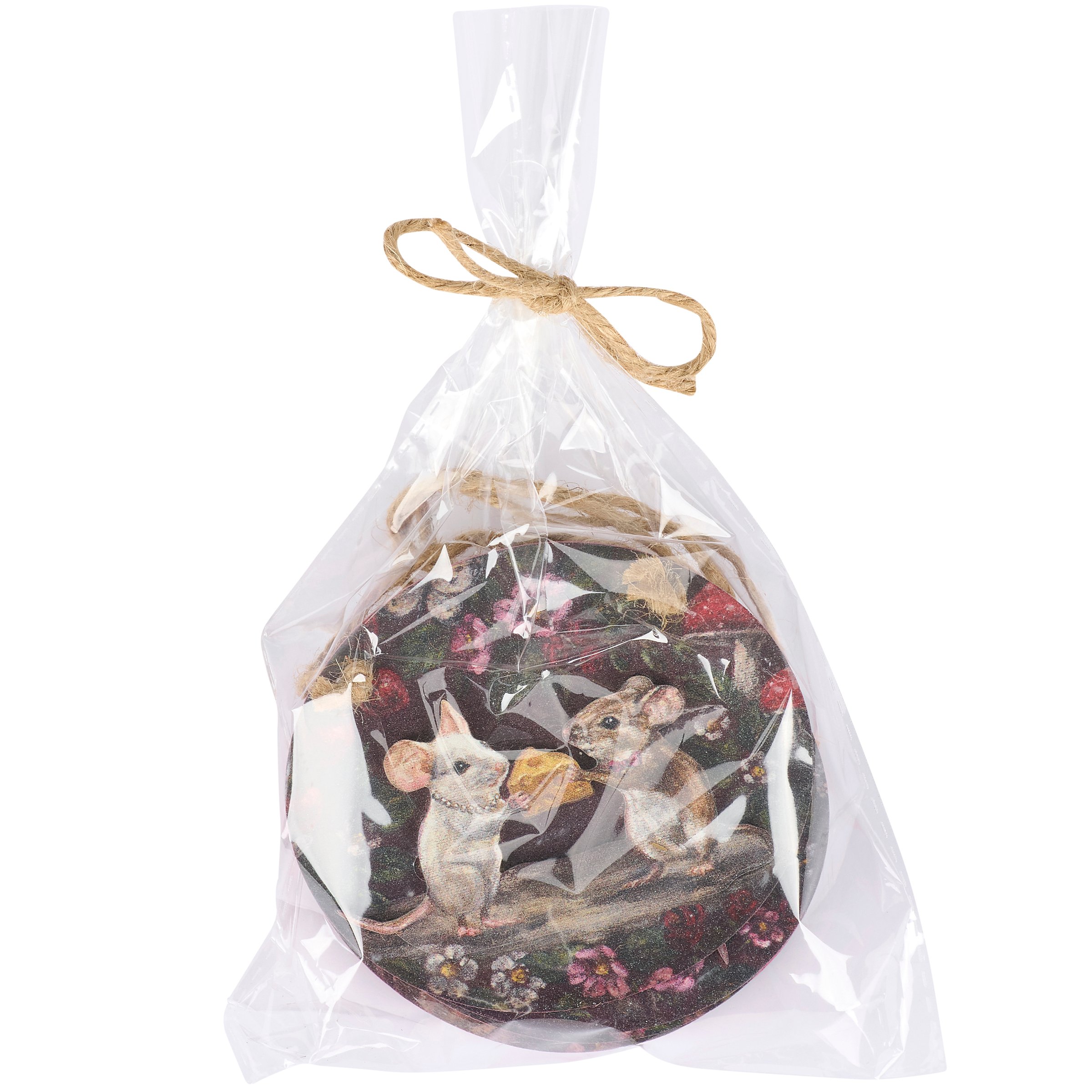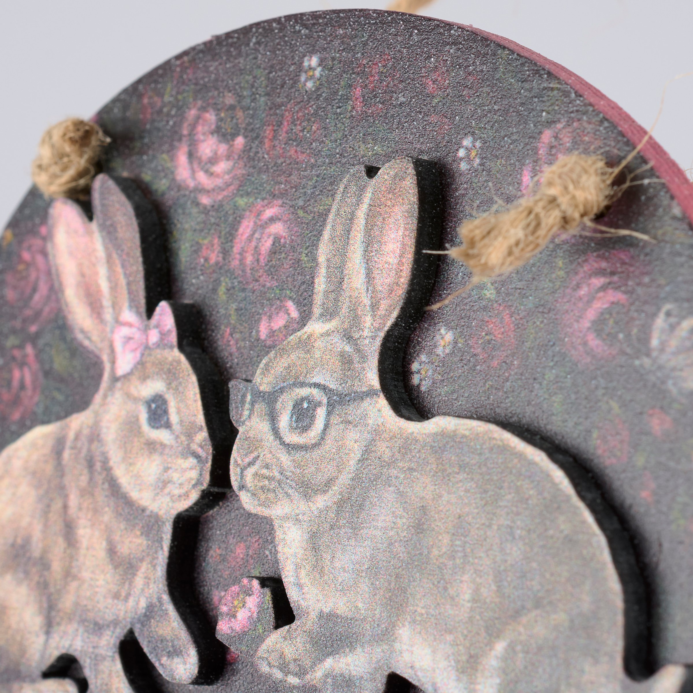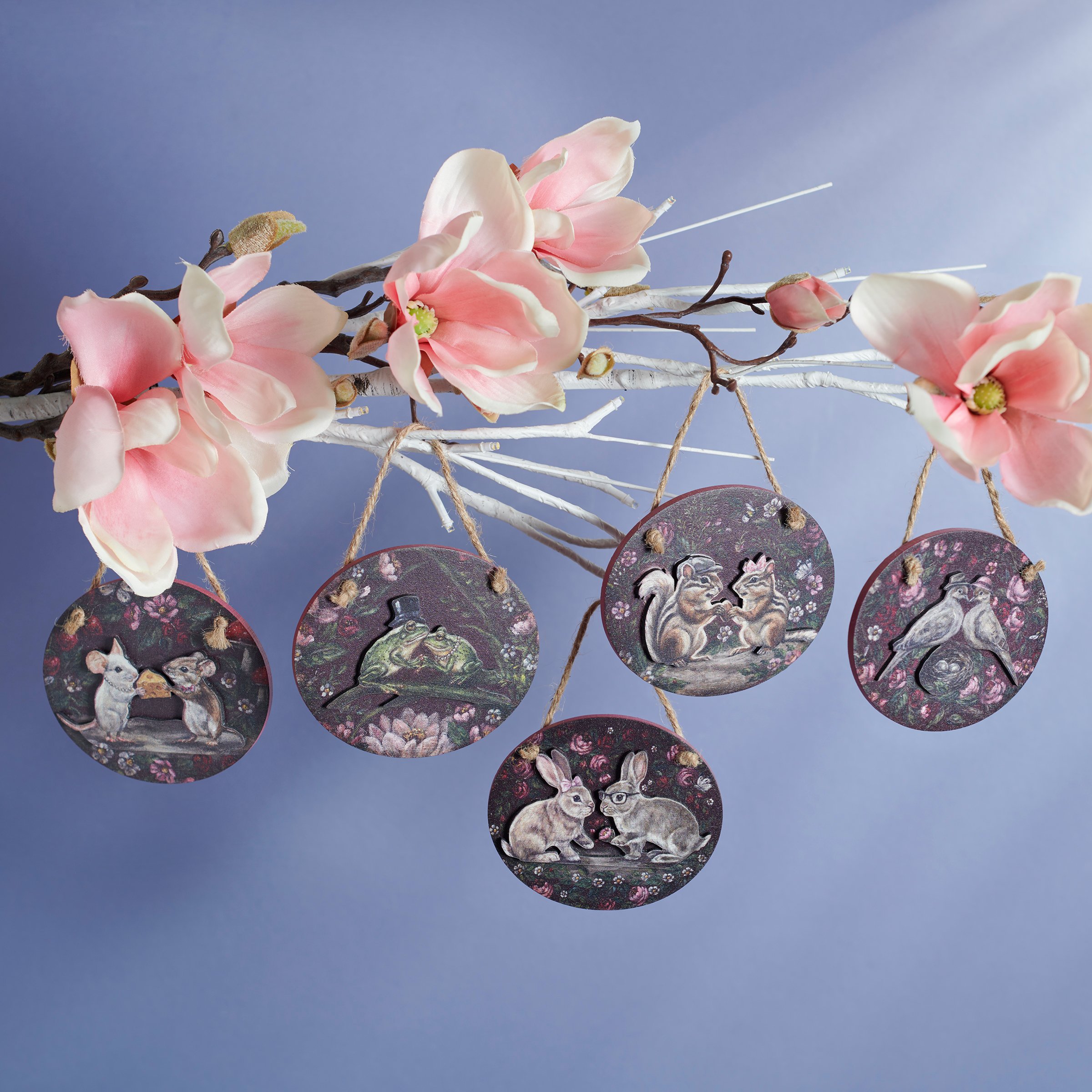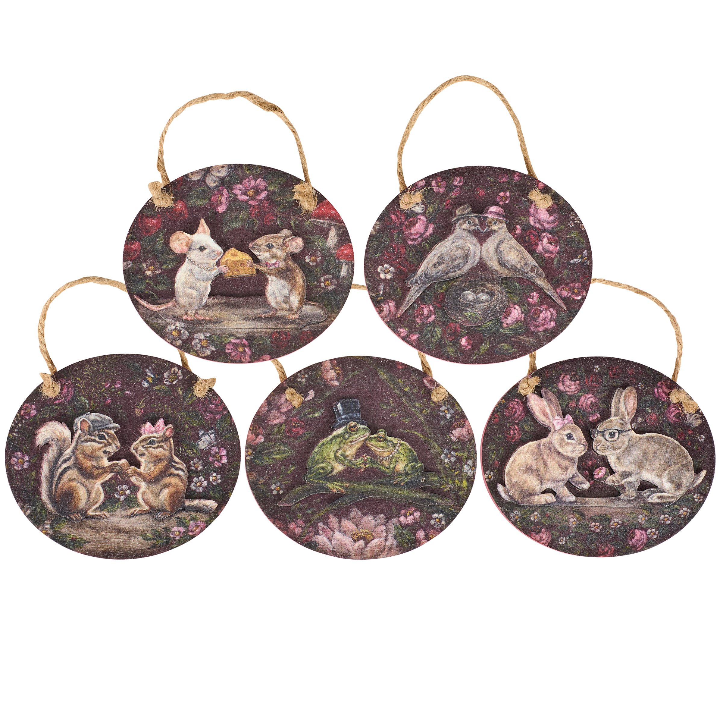 A set of 5 wooden ornaments from our Valentine's Day Collection featuring heartwarming scenes of moody spring florals surrounding woodland animal couples dressed up and offering gifts of affection with the animals displayed on a separate wooden piece for added dimension. Valentine animal couple designs include mice, birds, chipmunks, frogs, and bunnies replicated from original artwork painted onto burlap canvas, giving the art a unique depth and texture. Seasonal ornaments feature distressed details with a coordinating pink color on the sides and backs. Our Garden Love ornament set is easy to hang for display via attached jute hangers. Valentine's Day ornament set comes packaged together in a polybag and tied with jute string. A set of rustic Valentine's Day home accents perfect for adding seasonal style to any home or work space.