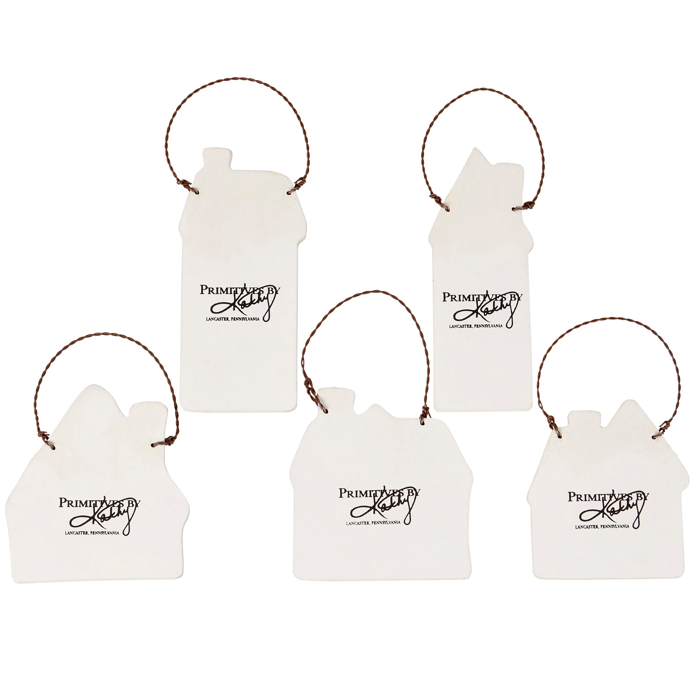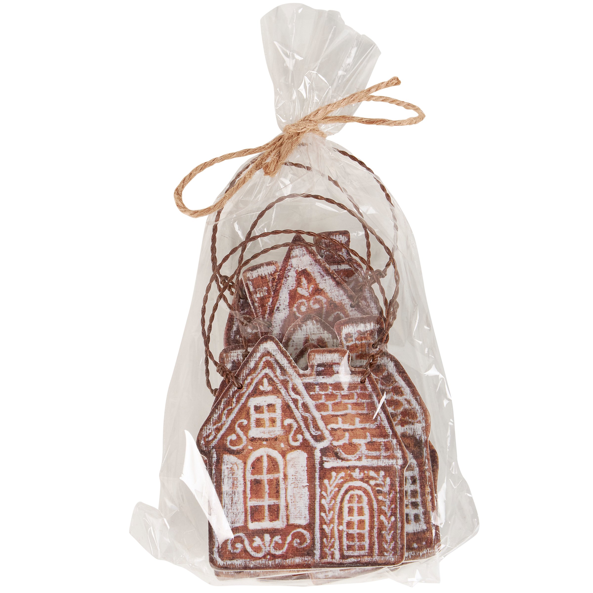 A set of wooden ornaments from our Christmas Collection displaying five individual gingerbread house designs making a charming village scene when displayed together. Designs are replicated from original artwork painted onto burlap canvas, giving the art a unique depth and texture. Seasonal ornaments feature distressed details with coordinating white color on the back. Our Gingerbread Village ornaments are easy to hang for display via attached twisted wire hangers. Set comes packaged together in a polybag and tied with jute. A rustic set of gingerbread-themed ornaments perfect for seasonal decorating.