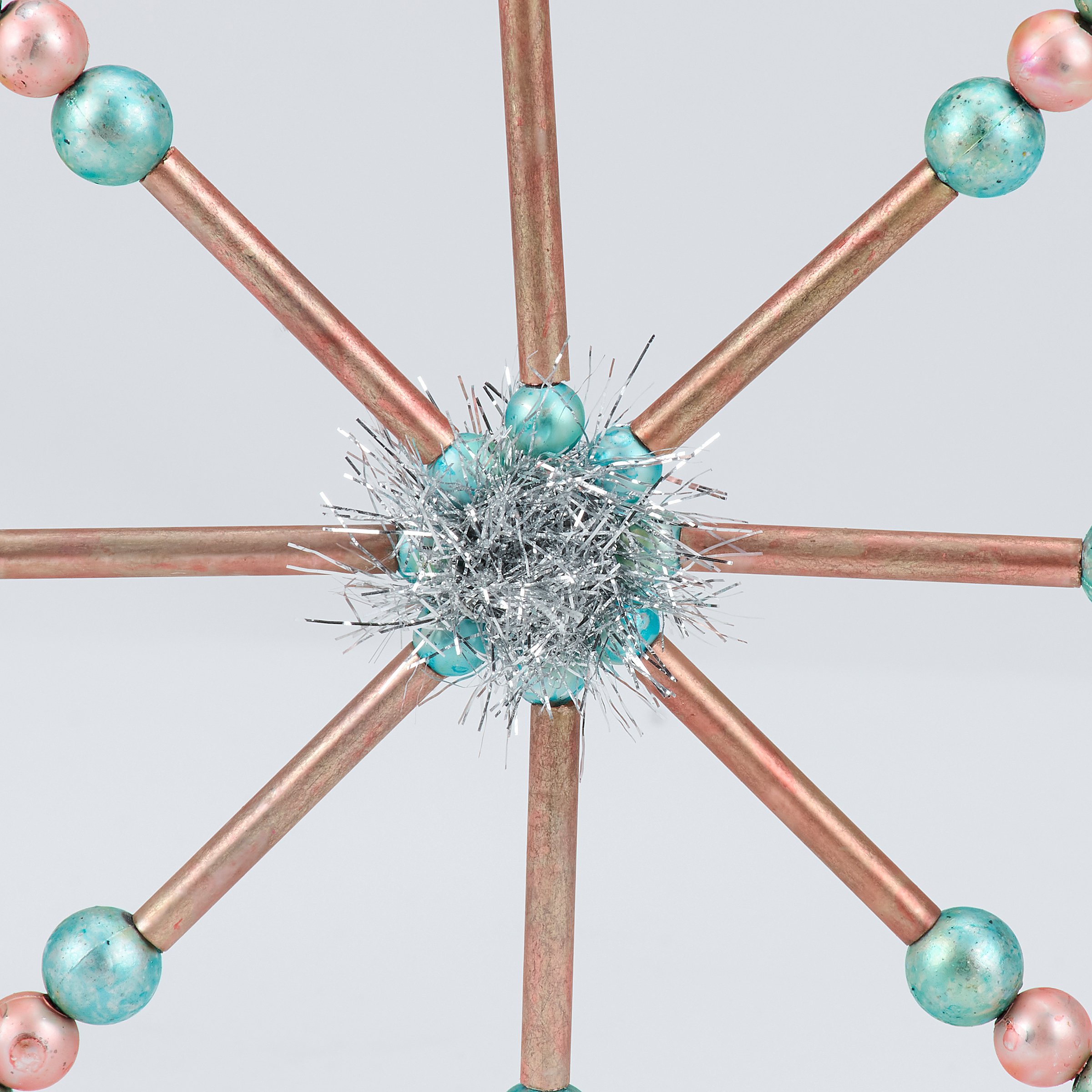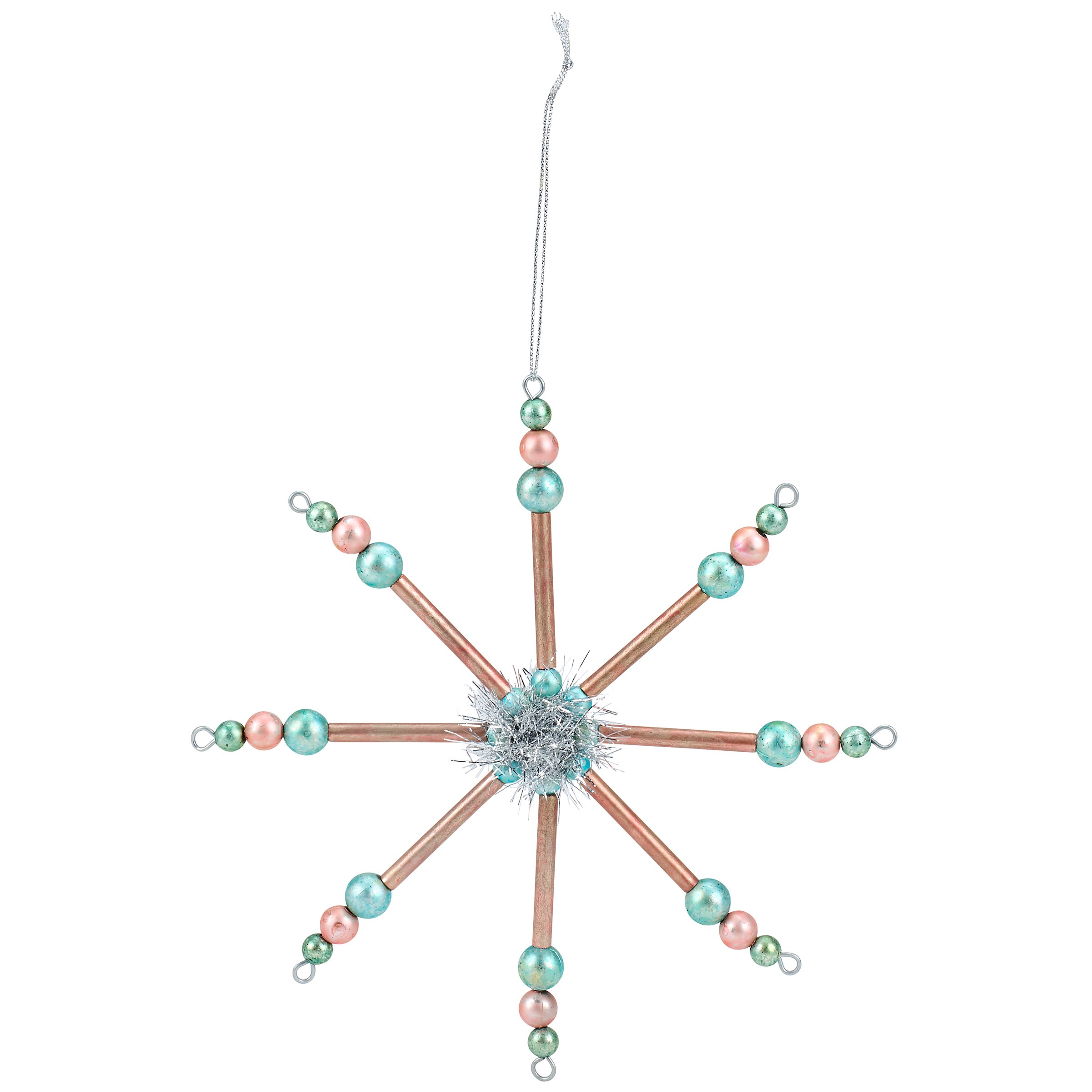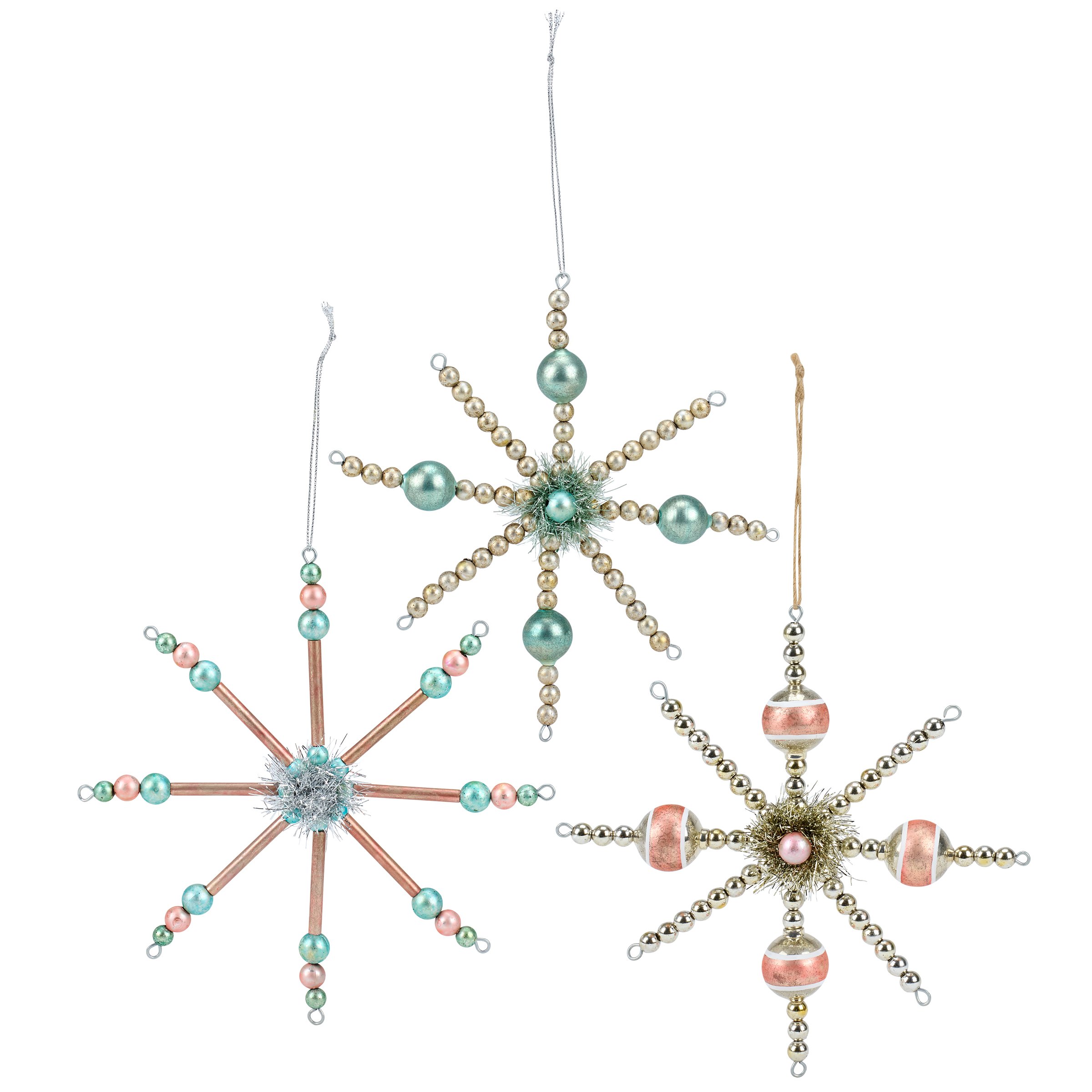 A set of 3 glass ornaments from our Christmas Collection displaying different retro pastel inspired star designs with various colored beads and tinsel. Our Retro Stars glass ornament set is ready to hang for display via the included top loops and string hangers. A set of retro home accents perfect for a Christmas tree or for gifting.