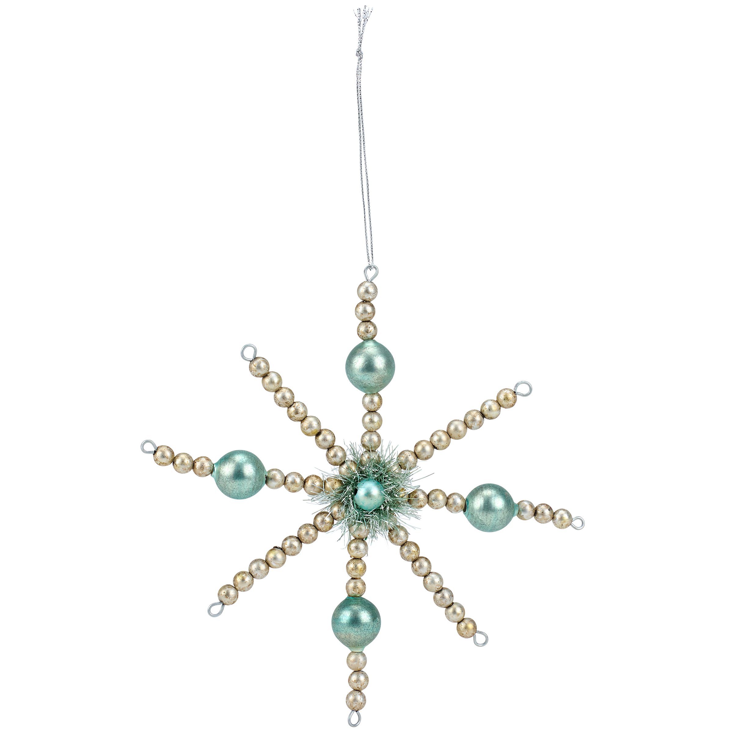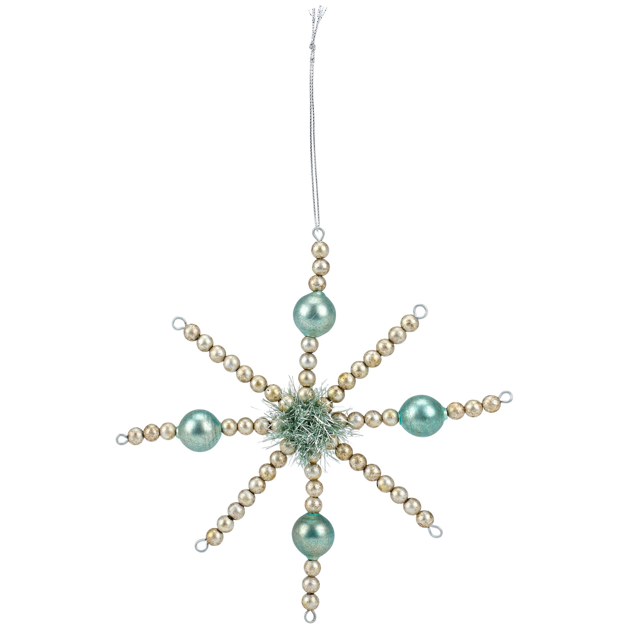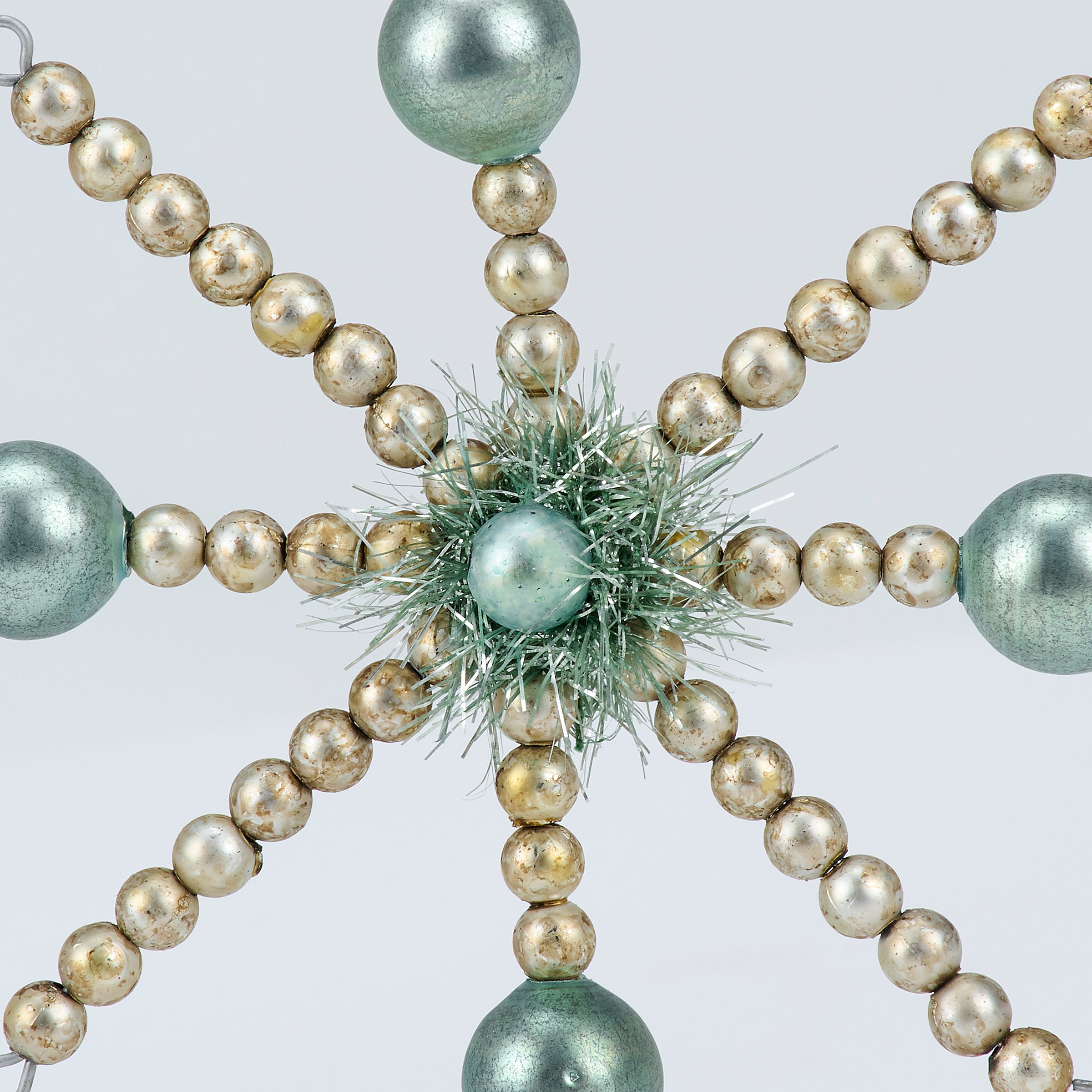 A set of 3 glass ornaments from our Christmas Collection displaying different retro pastel inspired star designs with various colored beads and tinsel. Our Retro Stars glass ornament set is ready to hang for display via the included top loops and string hangers. A set of retro home accents perfect for a Christmas tree or for gifting.