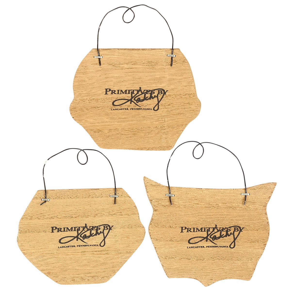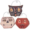 A set of 3 decorative ornaments from our Halloween Collection displaying a rustic Halloween face designs including a skeleton, jack o'lantern, and black cat that coordinate well with primitive home décor. Each Halloween design is replicated from an original art piece made from a hand carved wooden shape that is hand painted with face design. Our Halloween Faces ornament set is easy to hang for display via the attached wire hangers. Halloween ornament set comes packaged together in a polybag and tied with jute string. A set of rustic Halloween home accents perfect for seasonal display.