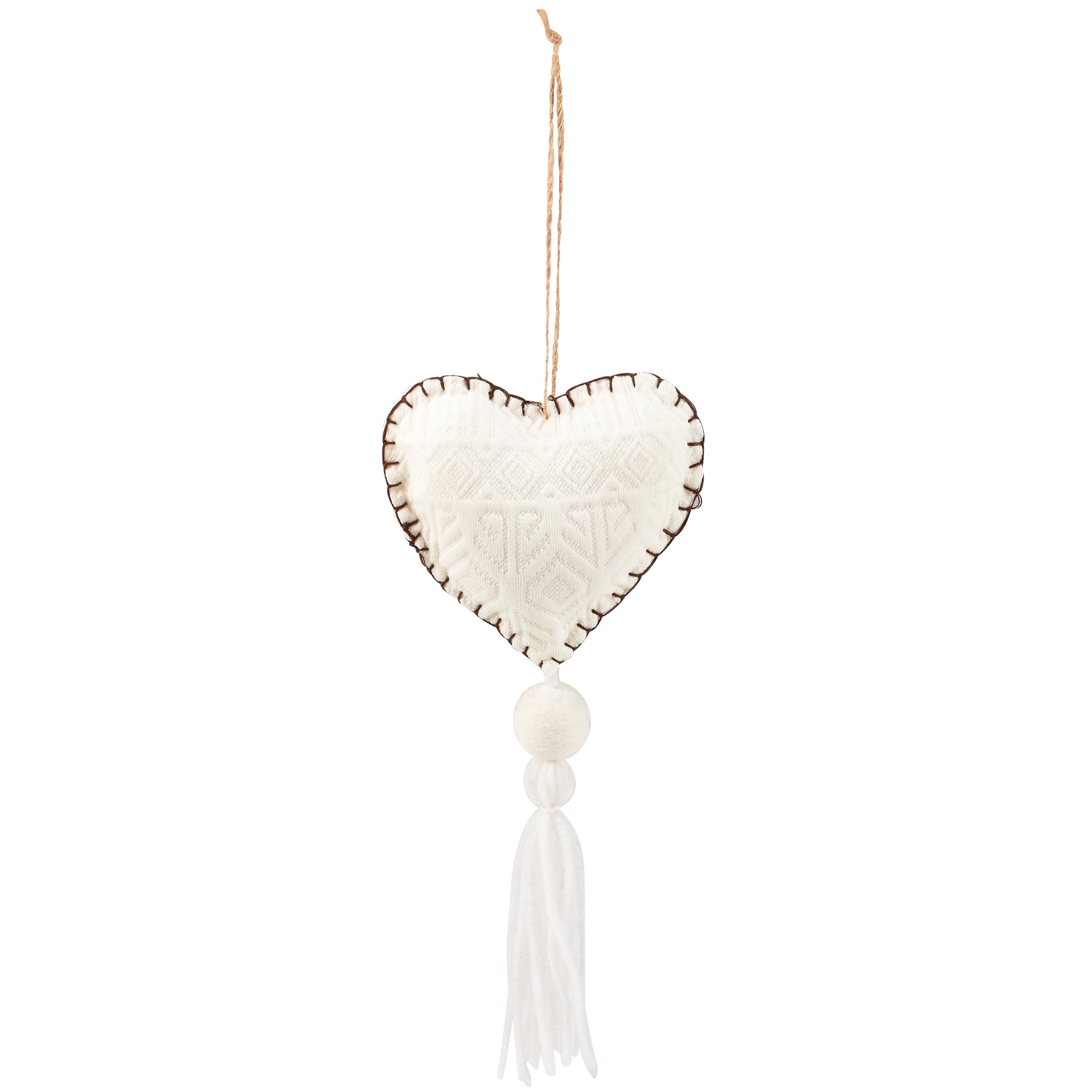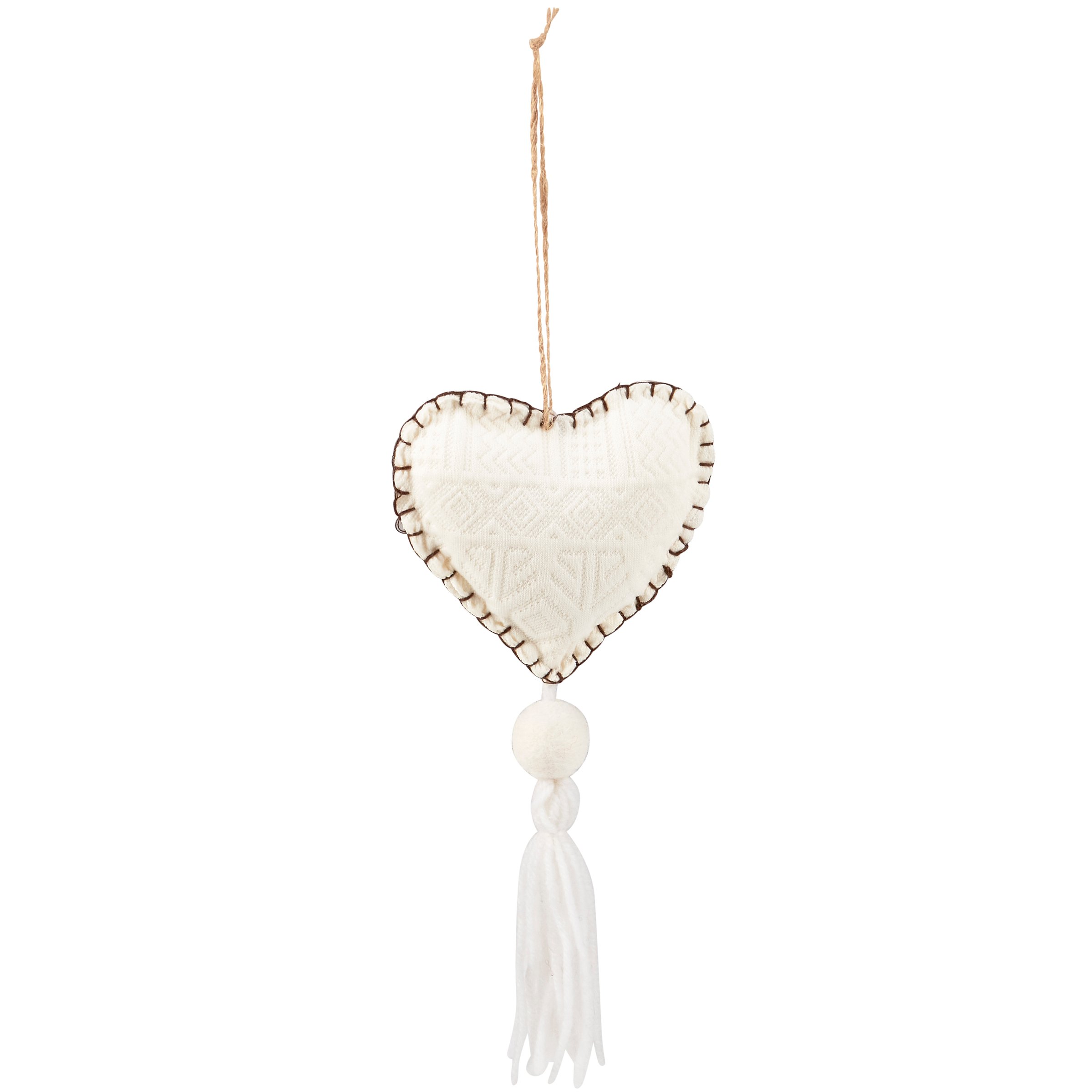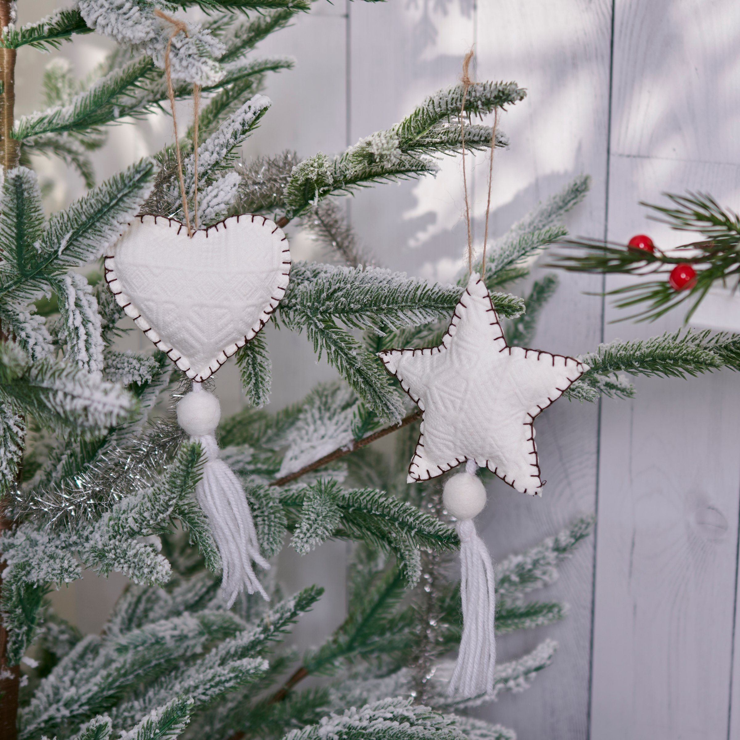 A set of felt ornaments from our Christmas Collection including a heart and a star ornament with a cozy textured pattern and stitched border. Seasonal ornaments feature a pom and tassel on the bottom for added interest. Our Heart & Star ornament set is easy to hang for display via attached string hangers. A rustic set of winter-themed ornaments perfect for seasonal display.