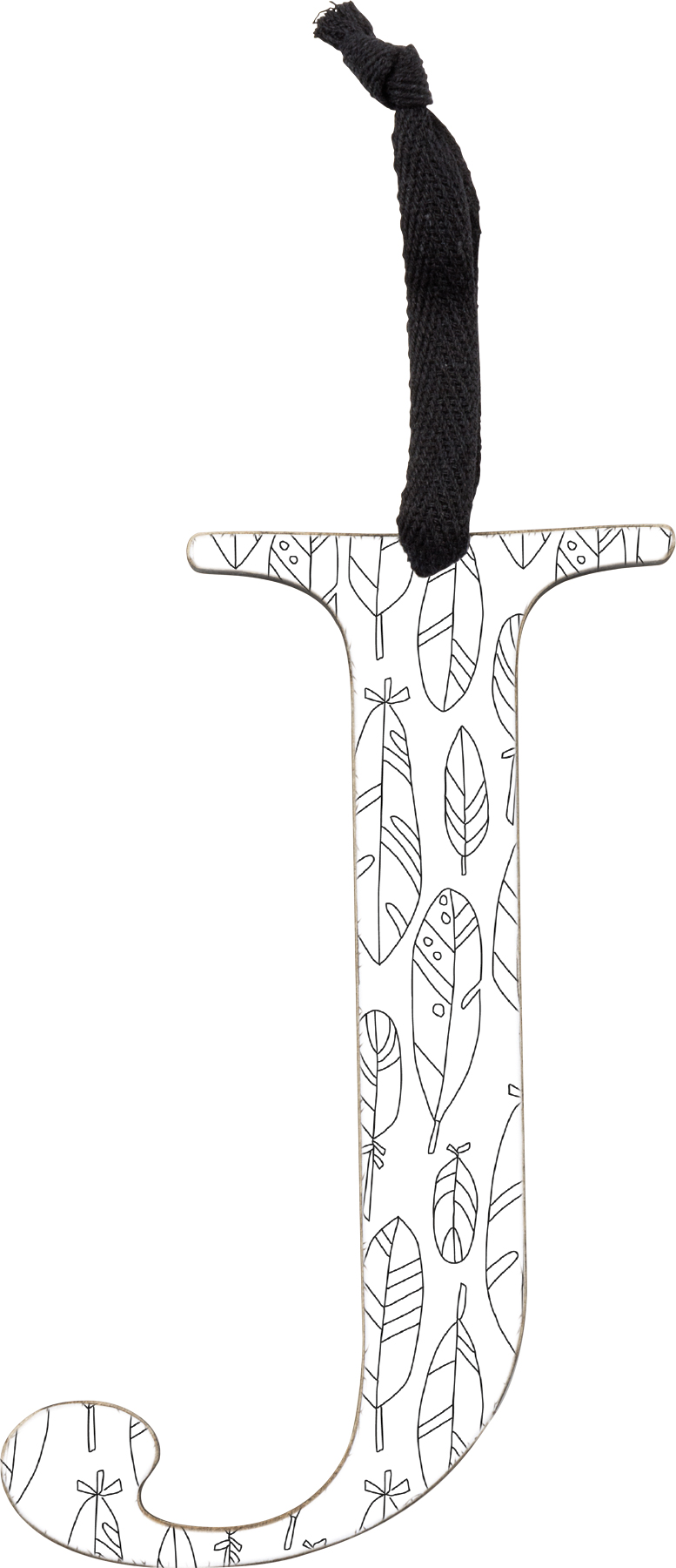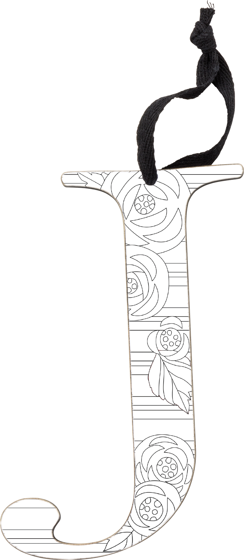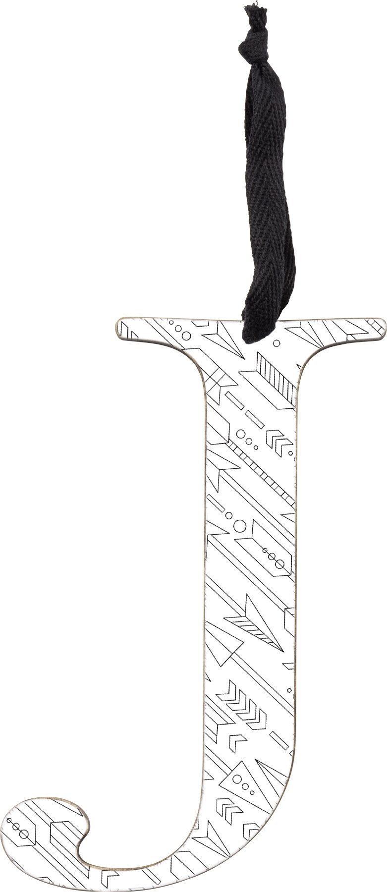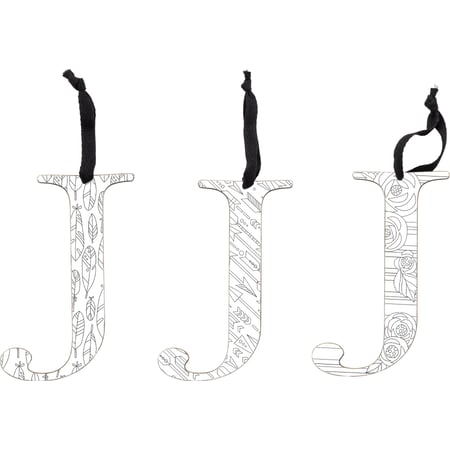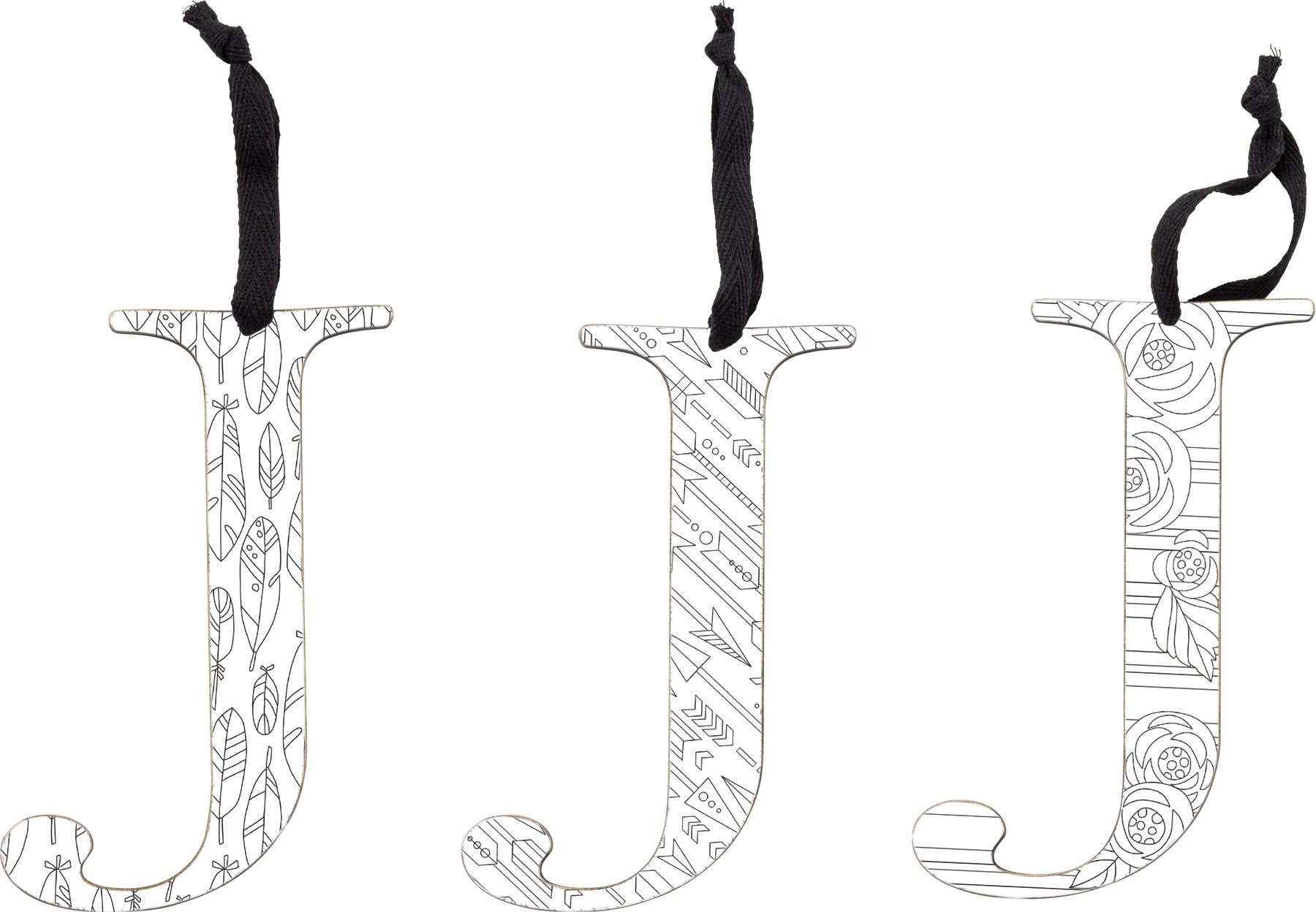 A set of wooden ornaments displaying a cutout letter "J" design with stylish black and white coloring book patterns that can be colored in with colored pencils or markers to add personal style! Letter ornament set features 3 letter "J" ornaments with one of each hand illustrated geometric pattern including feathers, arrows, and flowers with lines. Letter ornaments also feature coordinating black color on the sides and back. Each letter ornament is easy to hang via the attached black cotton tape hanger. A set of stylish home accents perfect for adding personality to everyday home decor.