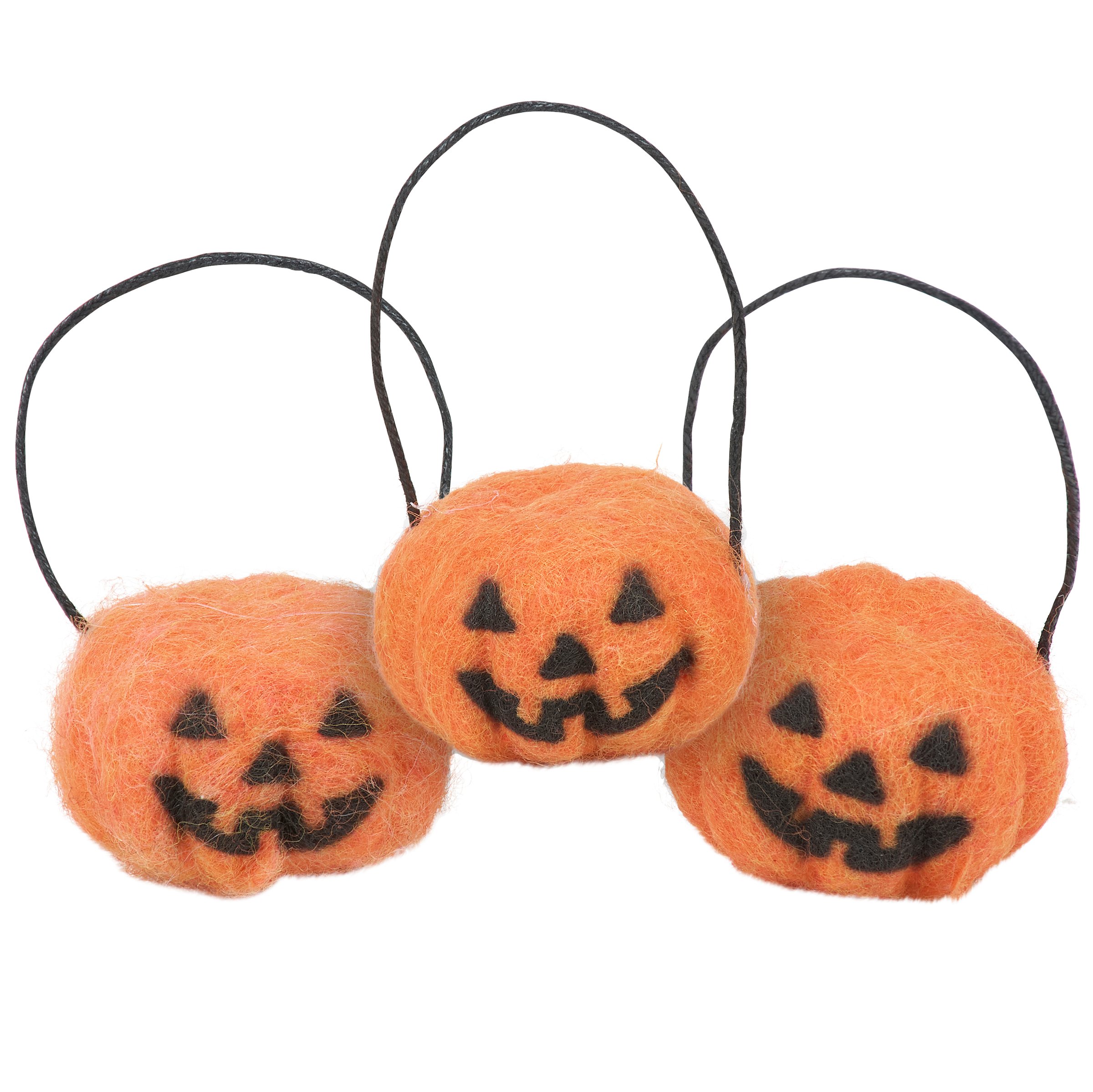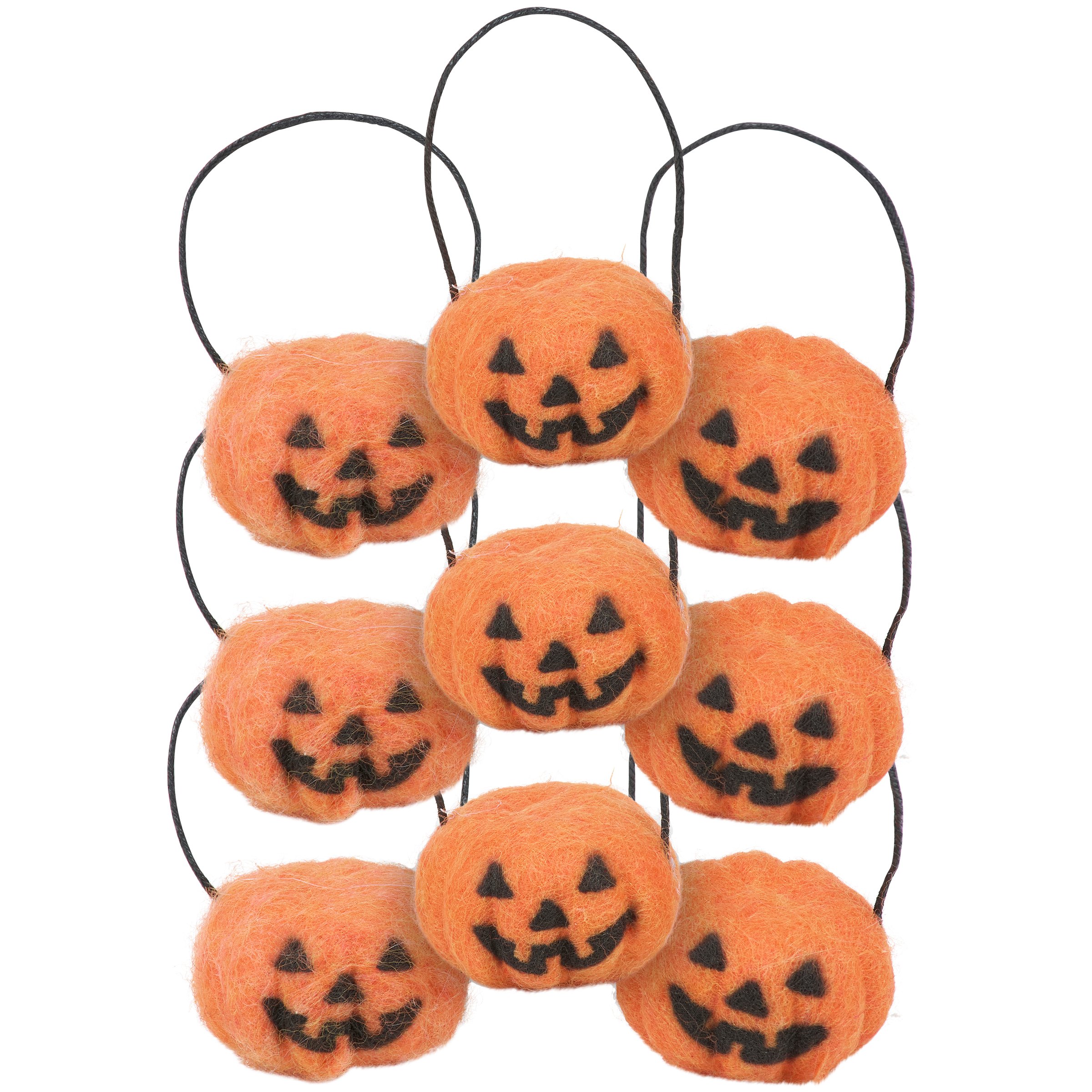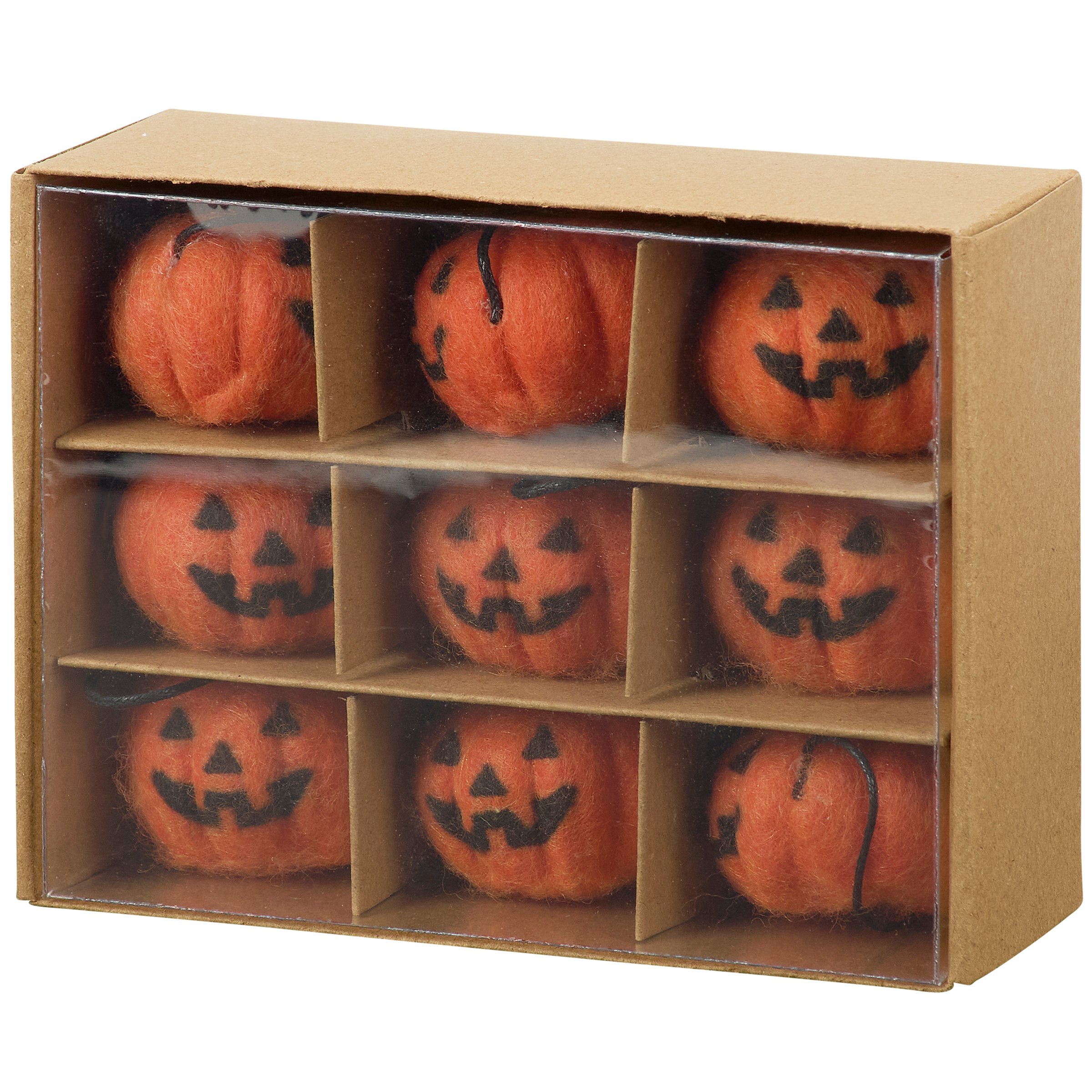 A set of 9 ornaments from our Halloween Collection featuring cute jack o'lantern designs made with felt. Our Jack O'Lanterns ornament set is ready to hang via the attached string hangers. Halloween ornament set is neatly packaged in a cardboard box with acrylic lid to easily view ornaments on store display. A set of felt Halloween home accents perfect for seasonal decorating.