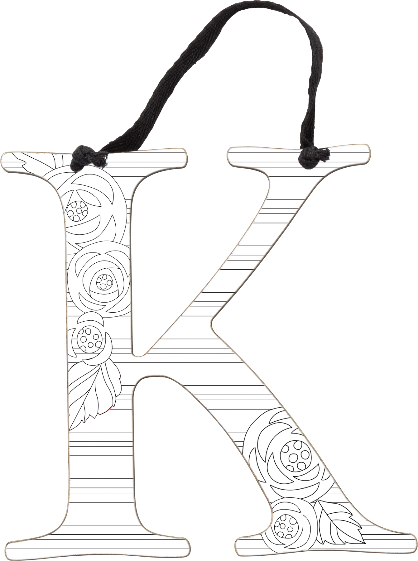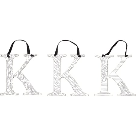 A set of wooden ornaments displaying a cutout letter "K" design with stylish black and white coloring book patterns that can be colored in with colored pencils or markers to add personal style! Letter ornament set features 3 letter "K" ornaments with one of each hand illustrated geometric pattern including feathers, arrows, and flowers with lines. Letter ornaments also feature coordinating black color on the sides and back. Each letter ornament is easy to hang via the attached black cotton tape hanger. A set of stylish home accents perfect for adding personality to everyday home decor.
