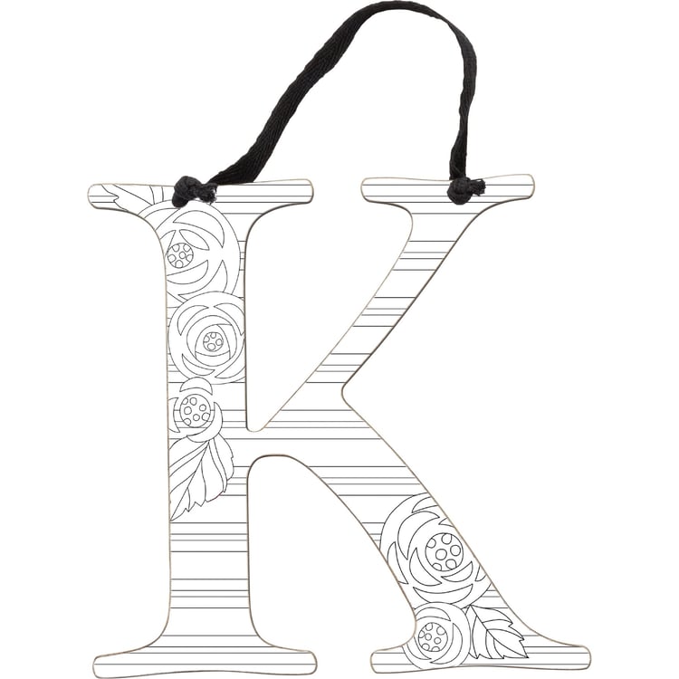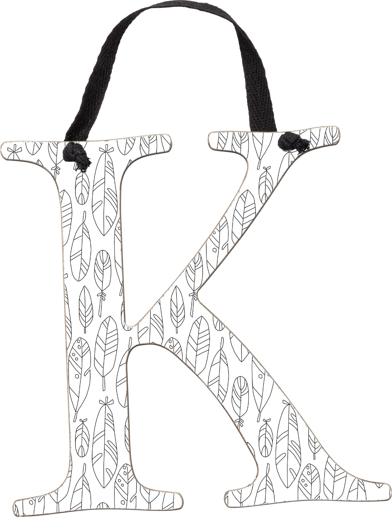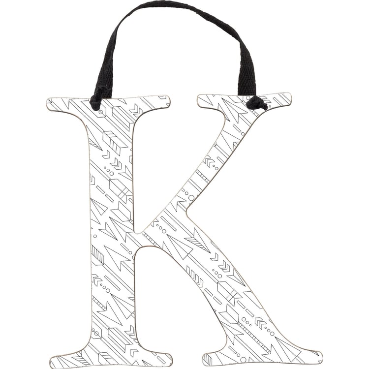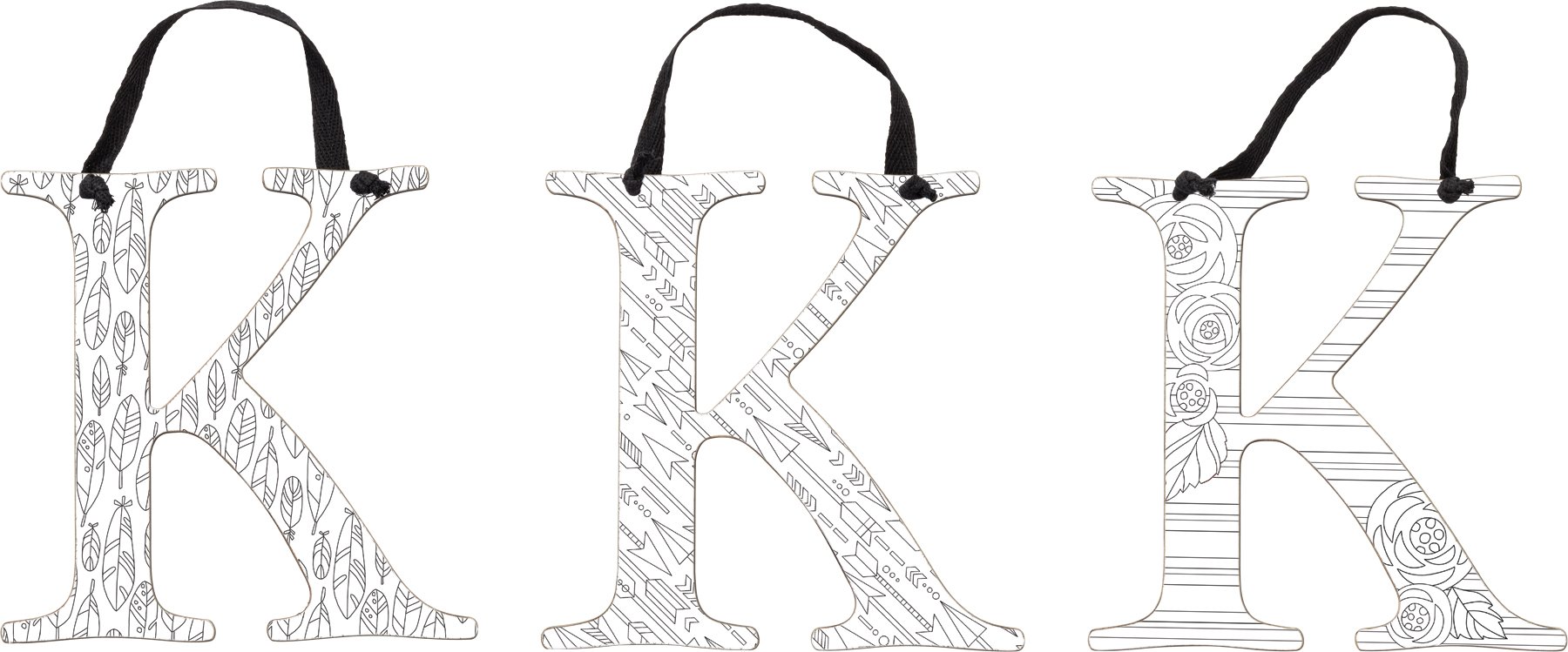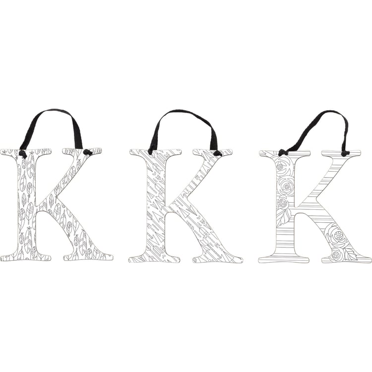 A set of wooden ornaments displaying a cutout letter "K" design with stylish black and white coloring book patterns that can be colored in with colored pencils or markers to add personal style! Letter ornament set features 3 letter "K" ornaments with one of each hand illustrated geometric pattern including feathers, arrows, and flowers with lines. Letter ornaments also feature coordinating black color on the sides and back. Each letter ornament is easy to hang via the attached black cotton tape hanger. A set of stylish home accents perfect for adding personality to everyday home decor.