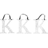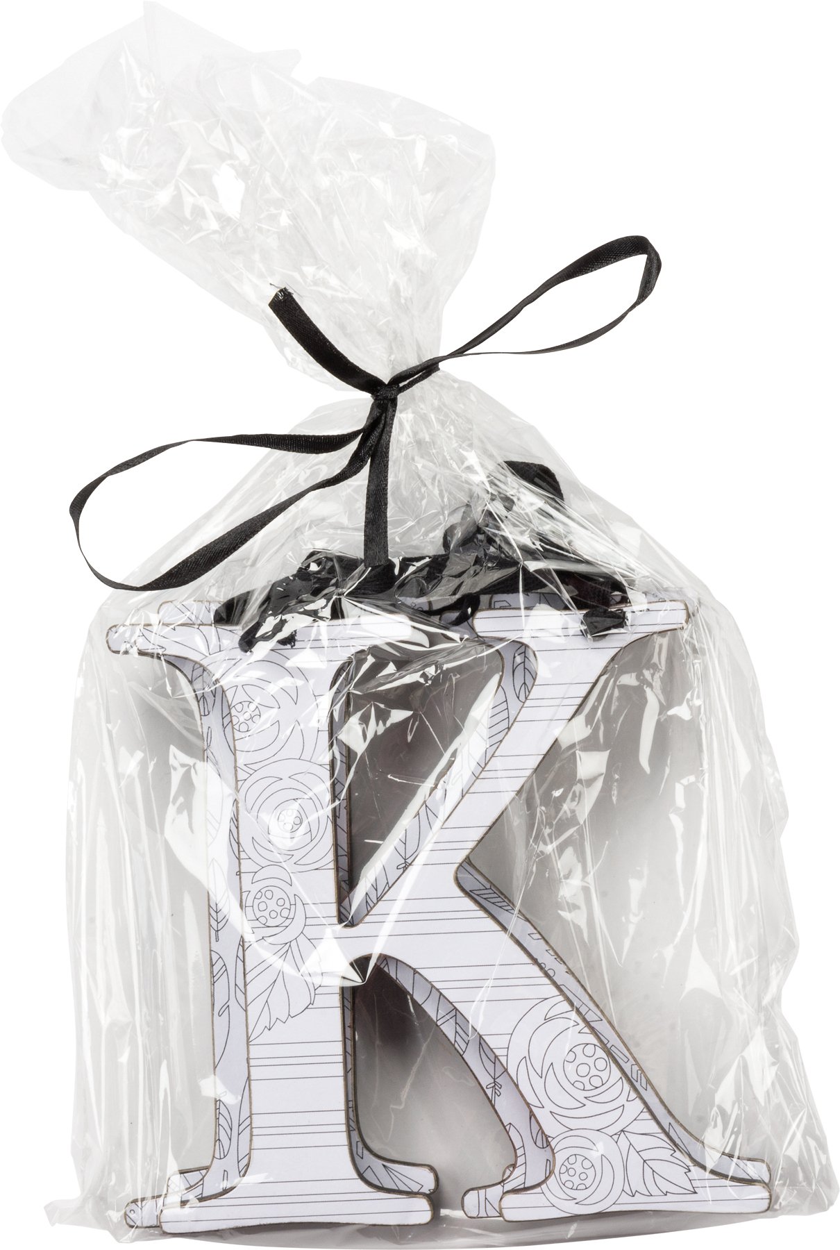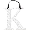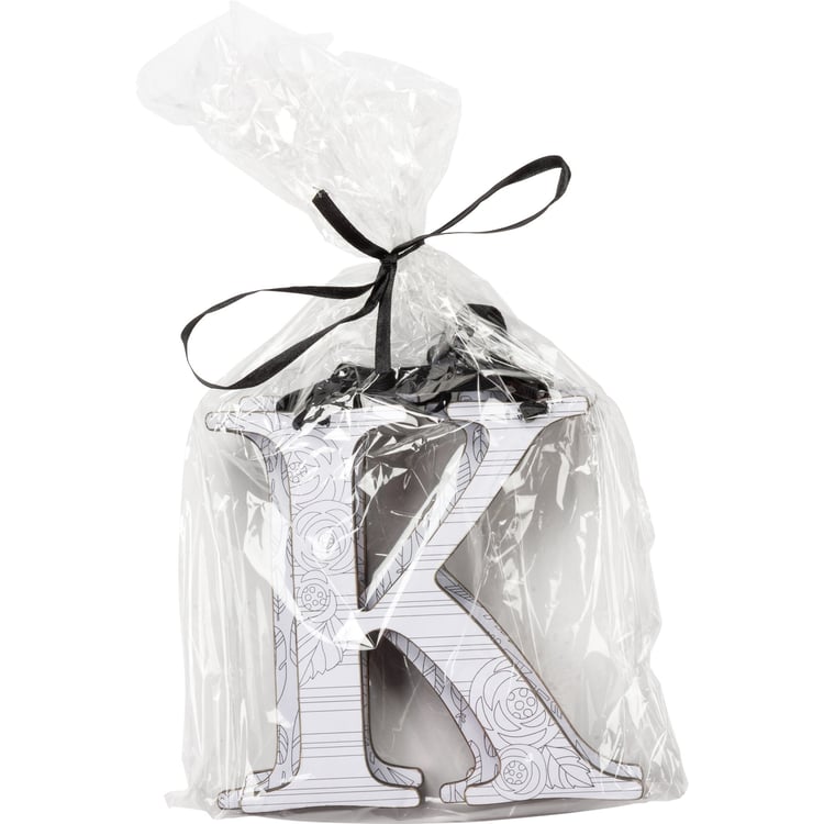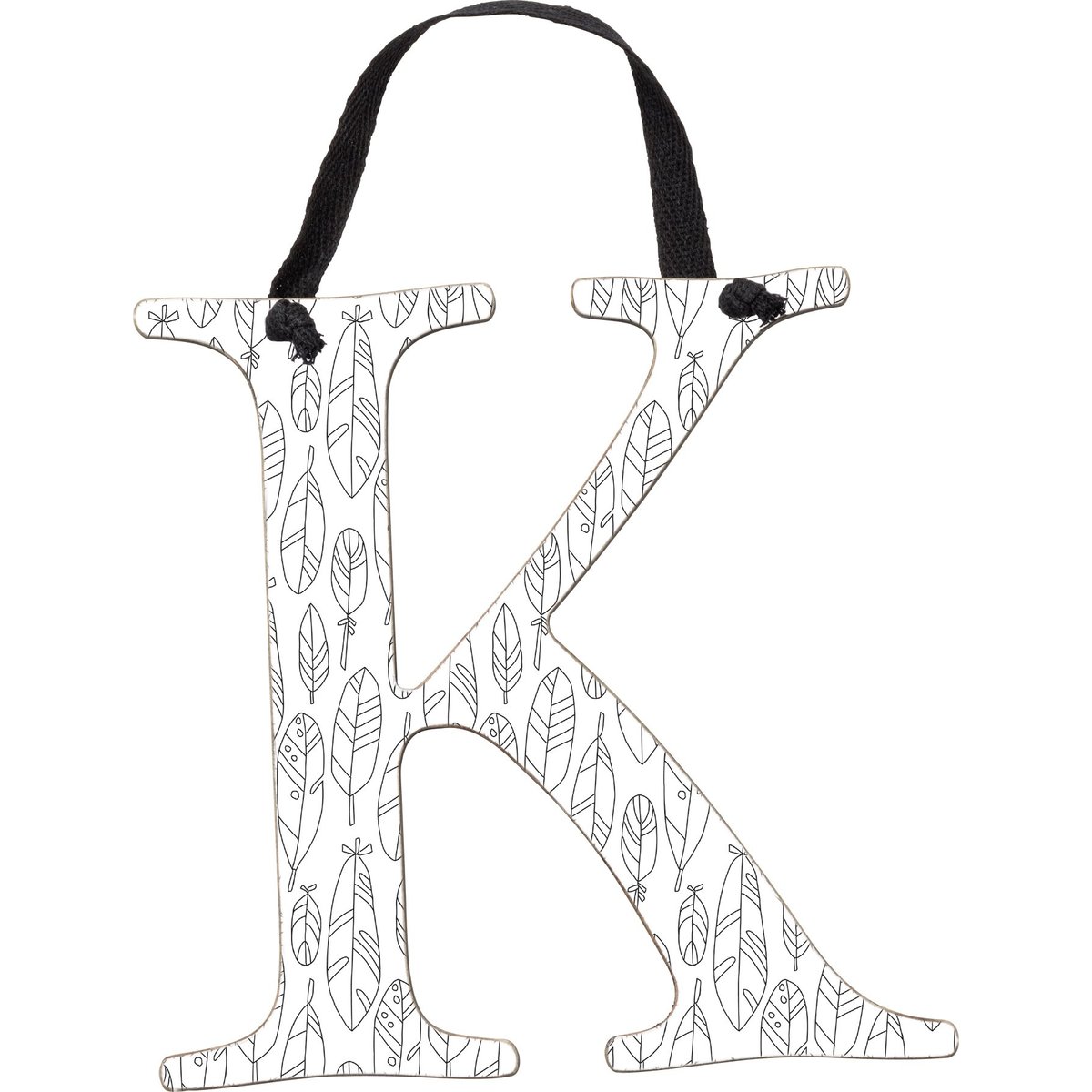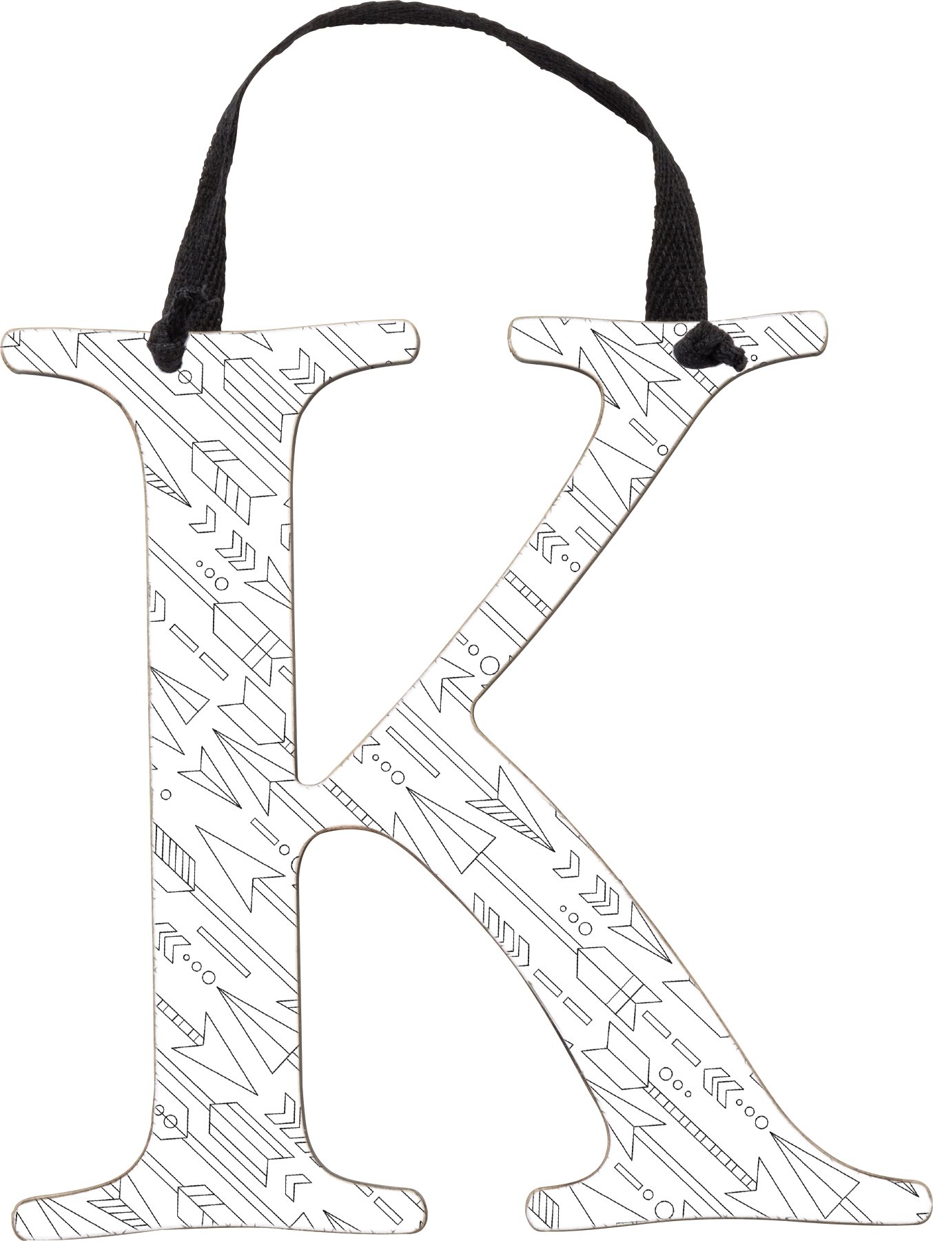 A set of wooden ornaments displaying a cutout letter "K" design with stylish black and white coloring book patterns that can be colored in with colored pencils or markers to add personal style! Letter ornament set features 3 letter "K" ornaments with one of each hand illustrated geometric pattern including feathers, arrows, and flowers with lines. Letter ornaments also feature coordinating black color on the sides and back. Each letter ornament is easy to hang via the attached black cotton tape hanger. A set of stylish home accents perfect for adding personality to everyday home decor.