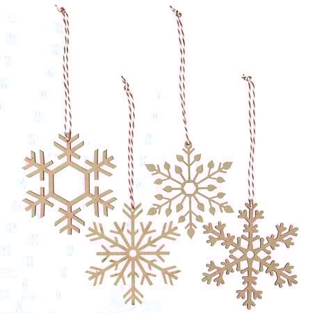 A set of wooden ornaments from our Christmas Collection including 12 laser cut snowflakes. Seasonal ornaments feature four different designs with a natural wood design. Our Laser Cut Snow ornament set is easy to hang for display via attached red and white string hangers. Set comes packaged together in a green paper box with acrylic lid to easily display each design. A set of winter-themed ornaments perfect for seasonal display.