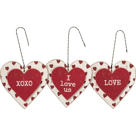 A set of three rustic wooden ornaments with debossed heart designs on base and dimensional solid heart additions with "XOXO," "I Love Us," and "LOVE" sentiments. Ornaments feature twisted wire hooks for easy hanging.