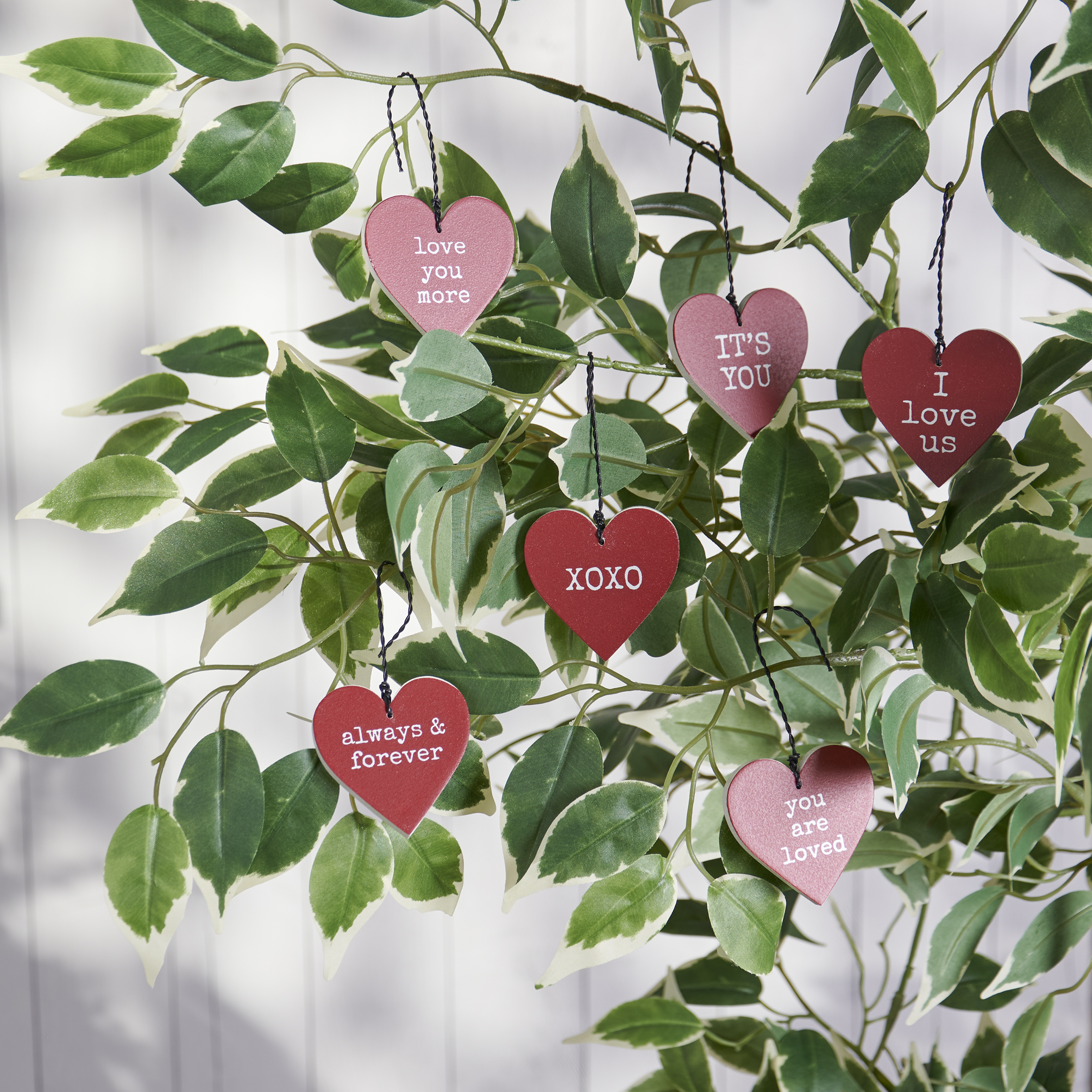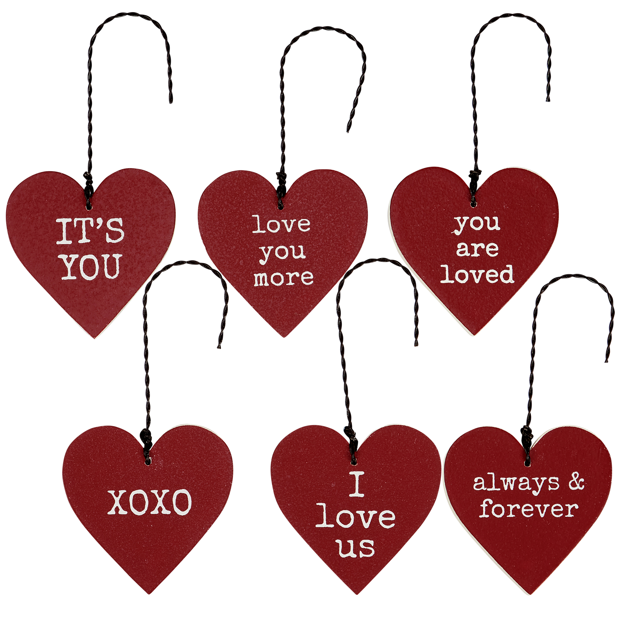 A wooden ornament set from our Valentine's Day Collection featuring six heart shaped designs and valentine inspired sentiments. Ornaments display individual love-themed sentiments that read "It's You," "Love You More," "You Are Loved," "XOXO," "I Love Us," and "Always & Forever." Easy to hang via attached twisted wire hangers. Our Love You More ornament set comes packaged in poly bag tied with ribbon and paper between each ornament. A set of love-themed ornaments perfect for seasonal display.