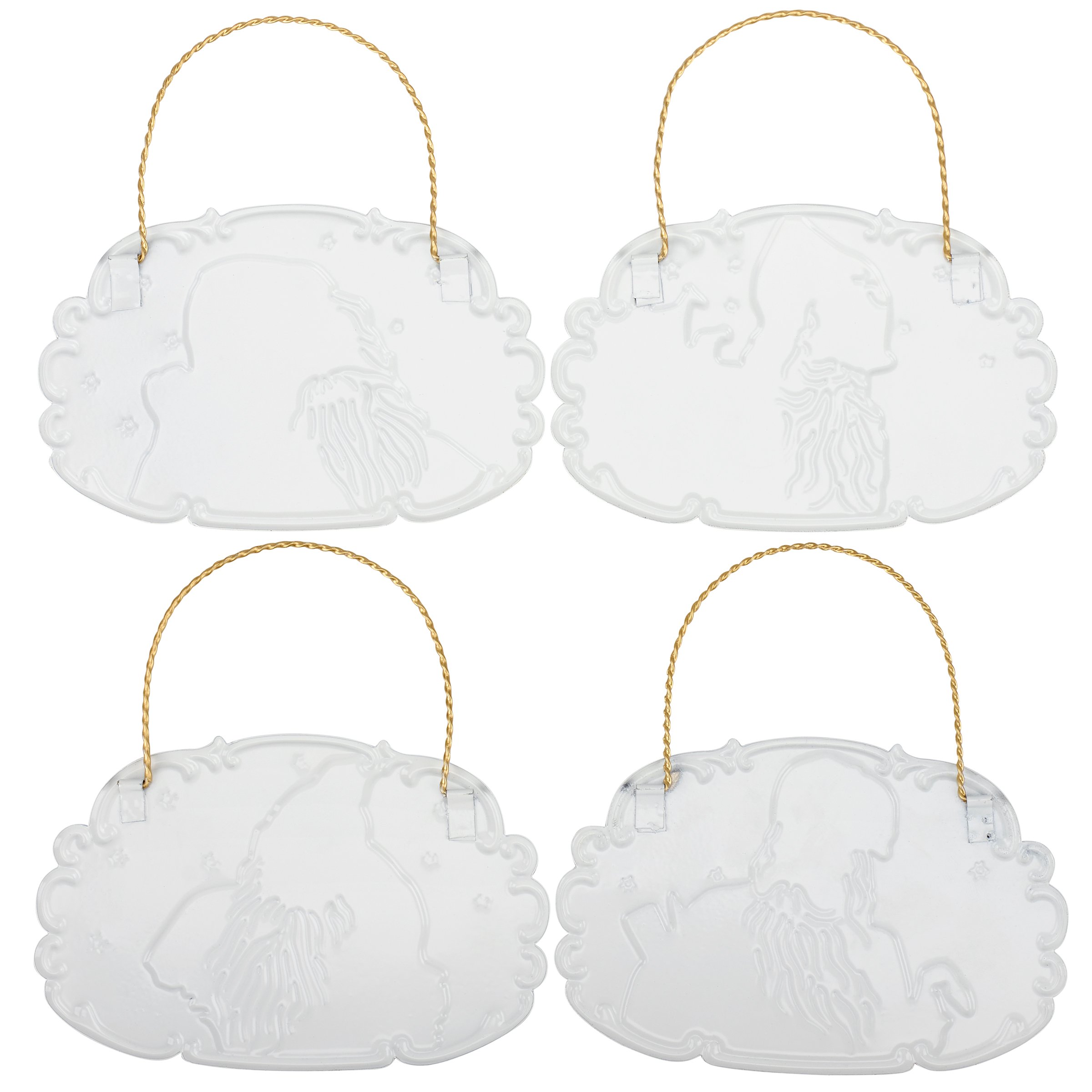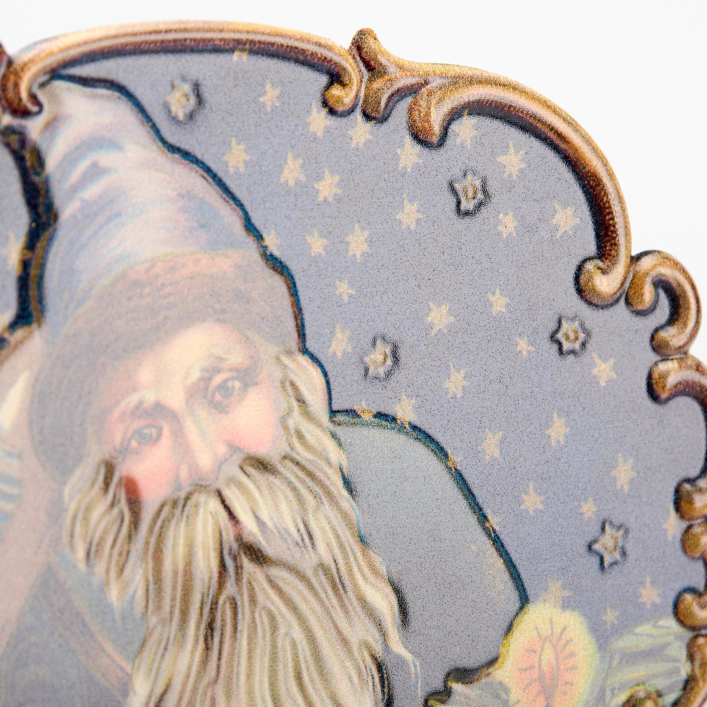 A set of metal ornaments from our Christmas Collection featuring 4 coordinating designs displaying vintage art of old world Santas delivering presents under a starry midnight sky. Each Santa ornament features embossed and debossed details with metallic gold accents. Our Midnight Santas ornament set is ready to hang for display via attached twisted wire hangers in metallic gold color. A set of vintage ornaments perfect for a Christmas tree or for seasonal decorating.