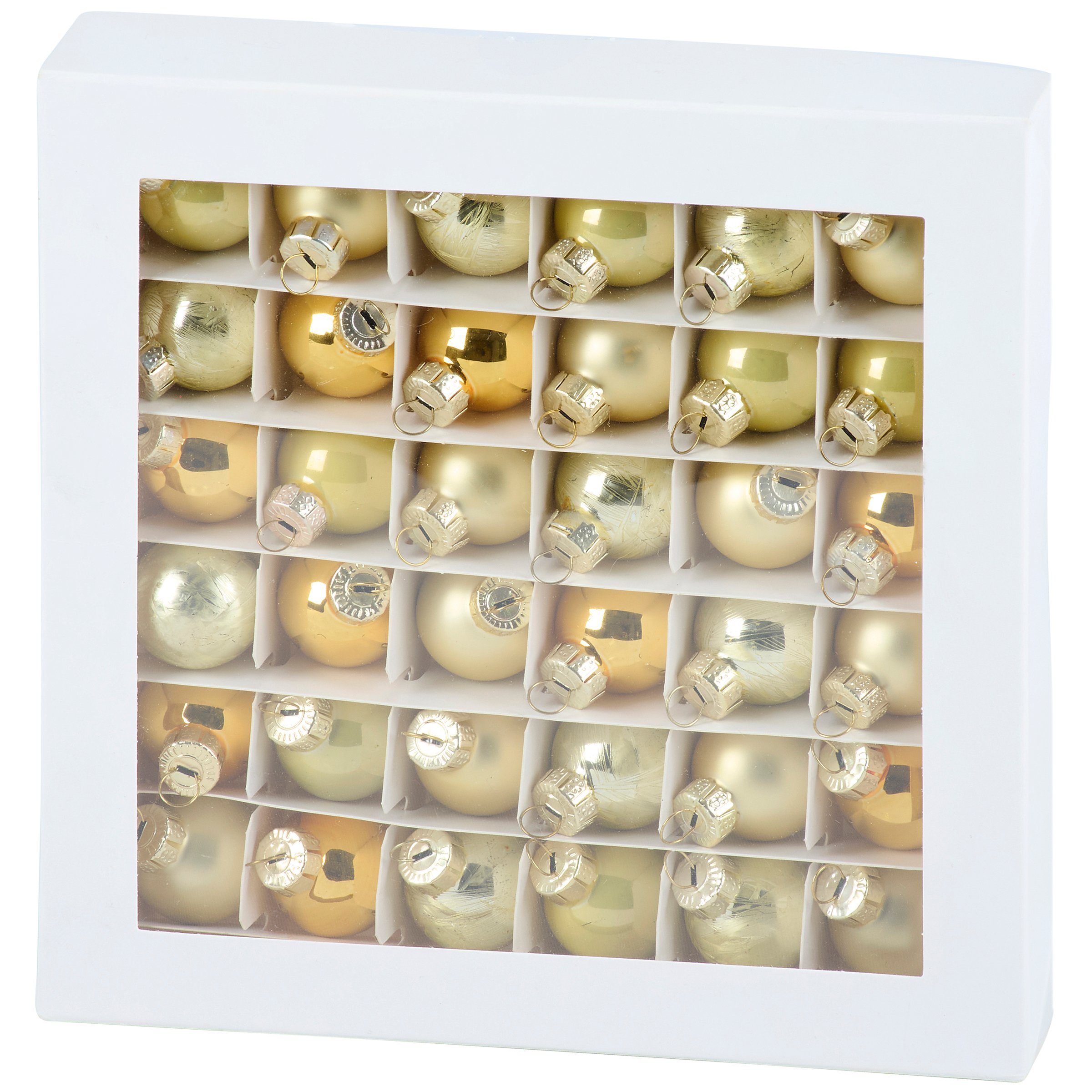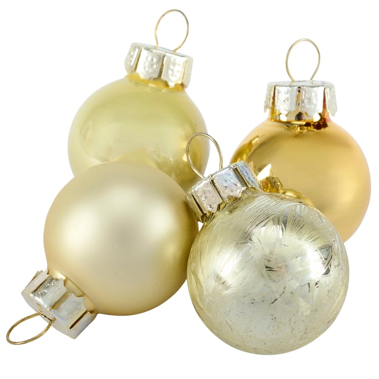 A set of mini glass ornaments from our Christmas Collection displaying a classic gold color palette. Set includes 24 ornaments with various finishes and distressed details. Our Mini Gold glass ornament set is ready to hang via the included top loops. Christmas ornament set is neatly packaged in a cardboard box and lid with acrylic window to easily view ornaments on store display. A set of vintage Christmas ornaments perfect for a Christmas tree or for gifting.