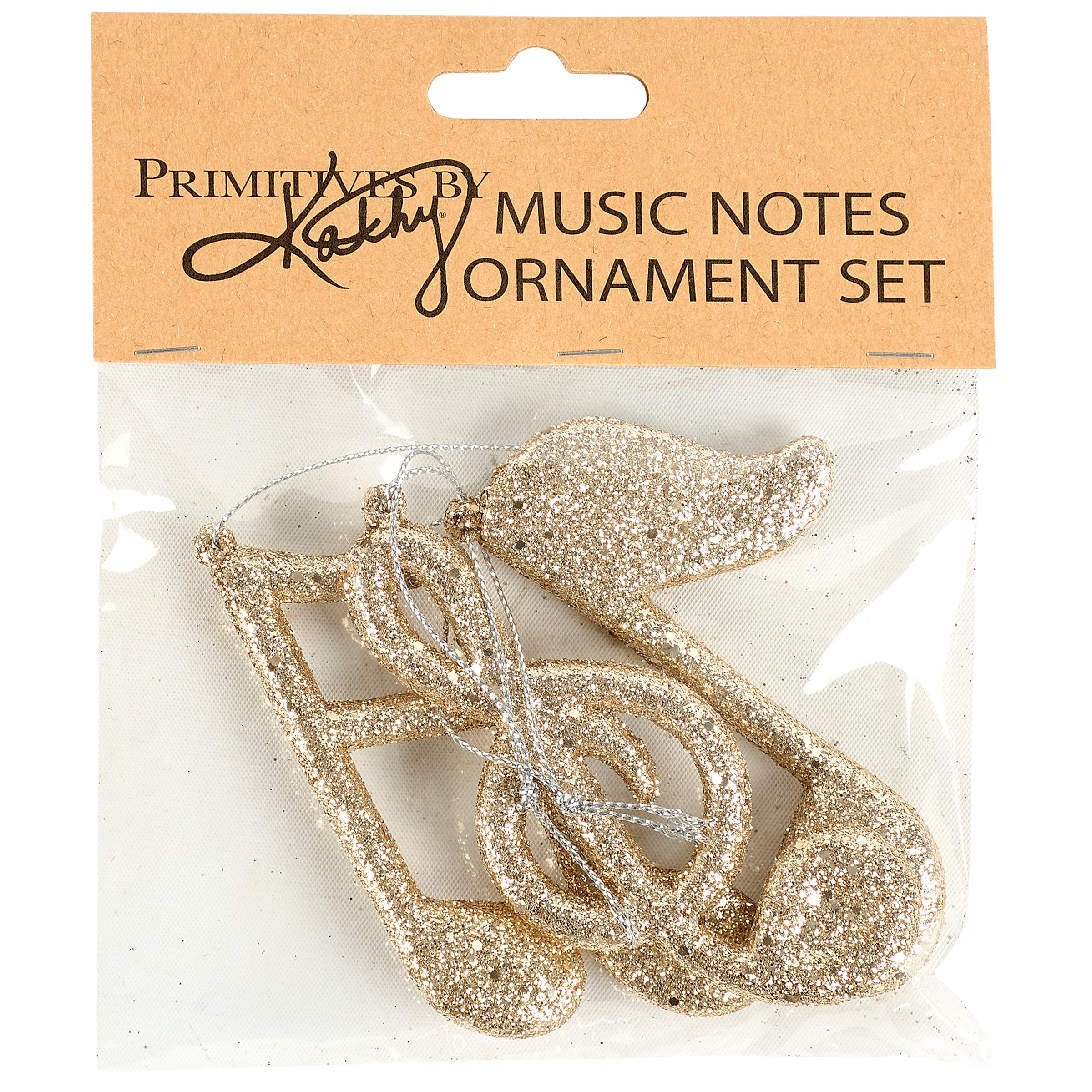 A set of 3 decorative ornaments from our Christmas Collection displaying sculpted music note designs with glitter finish for added interest. Our Music Notes ornament set is easy to hang for display via attached string hangers. Seasonal ornament set comes packaged in a polybag with header card and hole for easy store rack display. A set of stylish Christmas home accents perfect for a Christmas tree or for seasonal decorating.