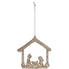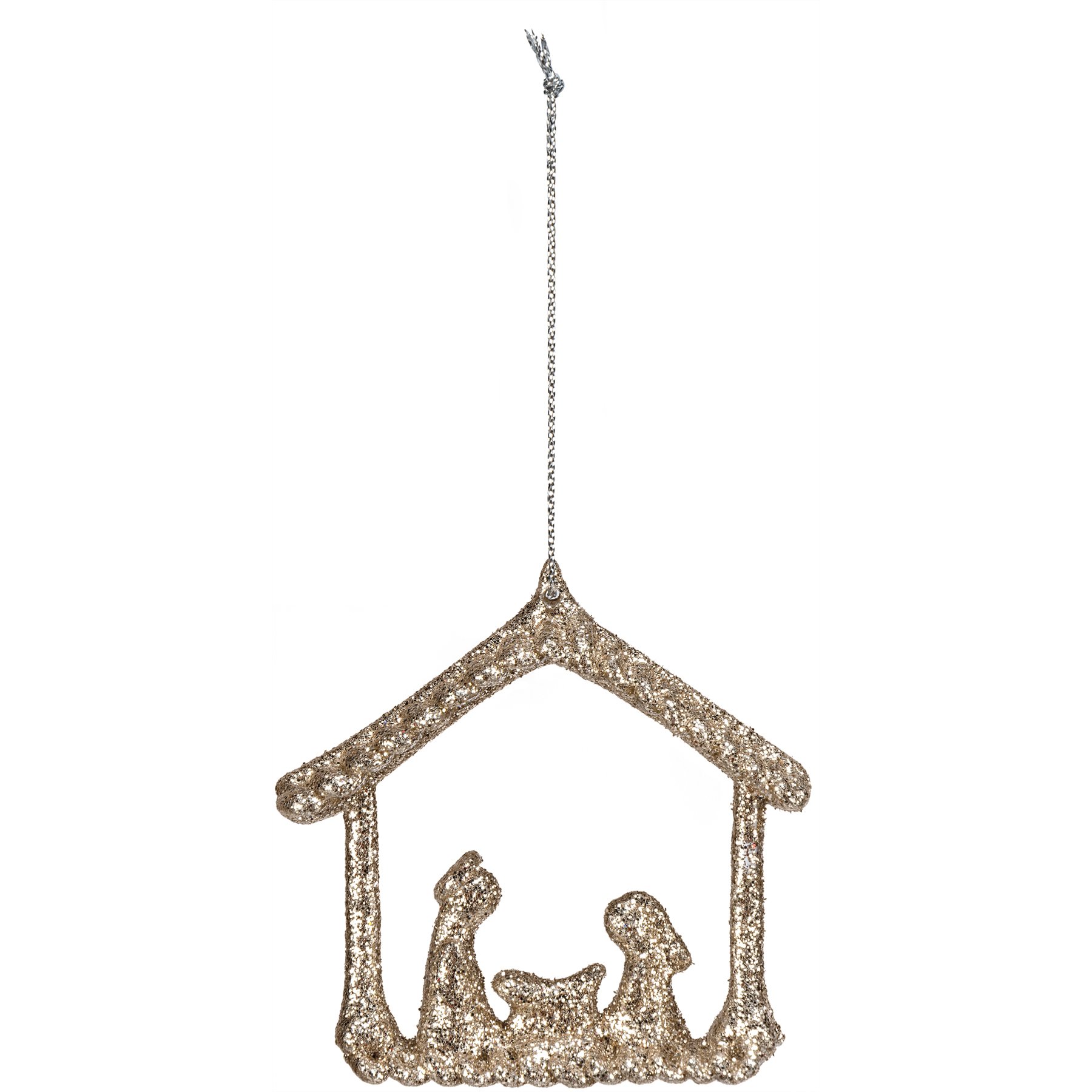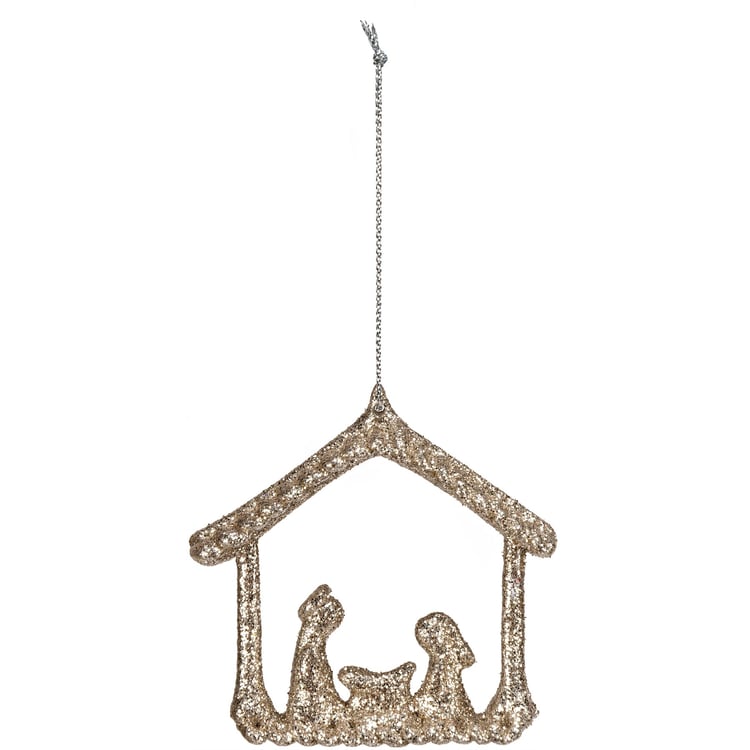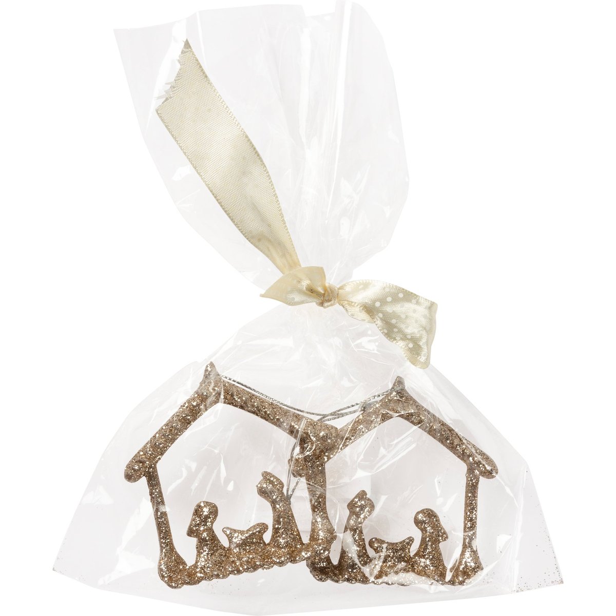 A set of two plastic Nativity ornaments featuring an all-over champagne-colored glitter coating with string loops for easy hanging. Neatly packaged in a polybag and tied with ribbon.