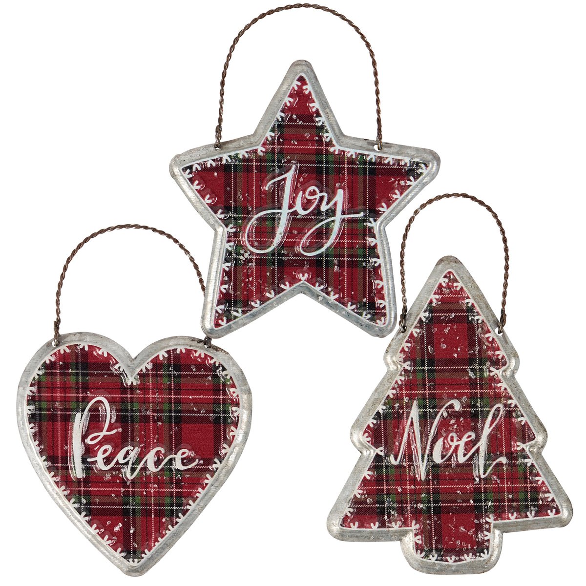 A set of 3 metal ornaments from our Christmas Collection featuring individual cutout shapes displaying Christmas plaid with seasonal sentiments and embossed details as well as a mica coating for a snowy appearance. Rustic ornaments display seasonal sentiments in a hand illustrated style including "Peace," "Noel," and "Joy." Our Peace ornament set is easy to hang for display via attached twisted wire hangers. A set of rustic Christmas home accents perfect for a Christmas tree or for seasonal decorating.