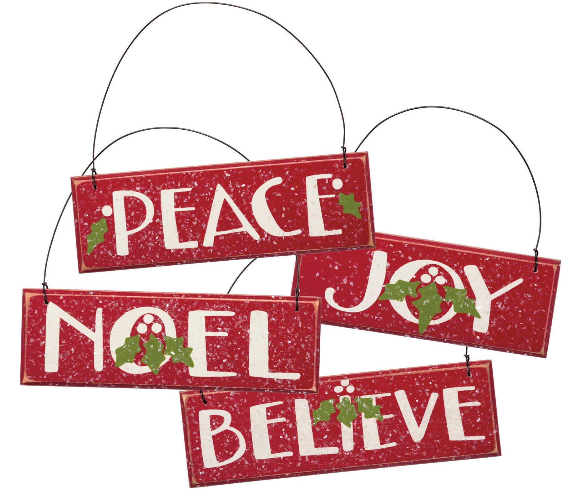 A set of four rustic rectangular wooden ornaments lending white hand lettered "Peace," "Joy," "Noel," and "Believe" sentiments on a red background with added mica coating for snowy effect. Each ornament features holly details. Set complements well with other pieces in collection.