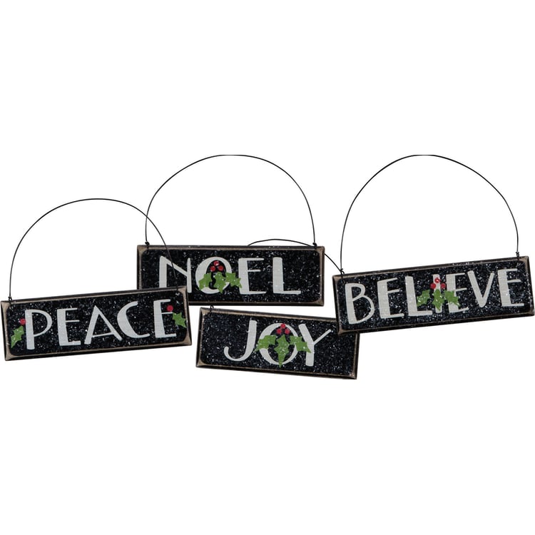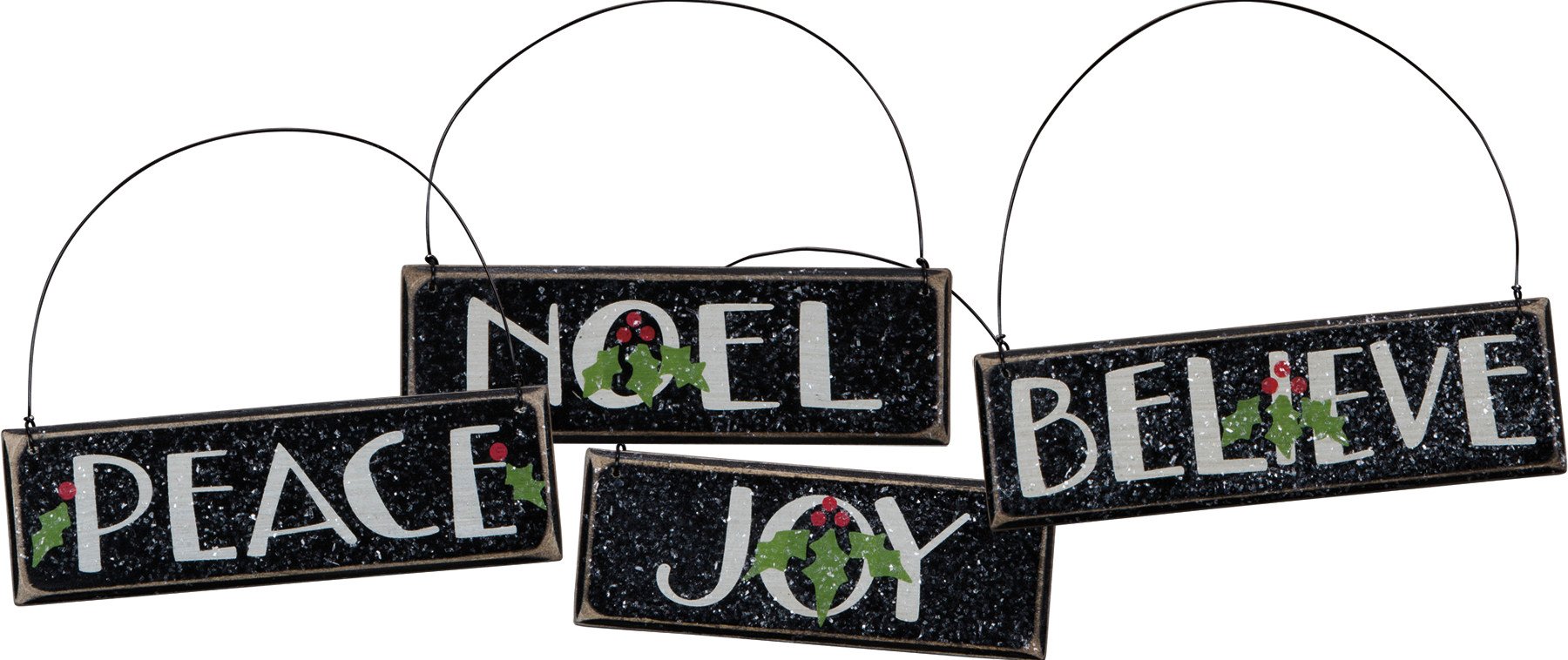 A set of four rustic wooden Christmas ornaments lending hand lettered "Peace," "Noel," "Joy," and "Believe" sentiments. Each piece in set features painted holly details and mica coating for snowy effect. Ornaments include wire loops for easy hanging. Set complements well with other pieces in collection.