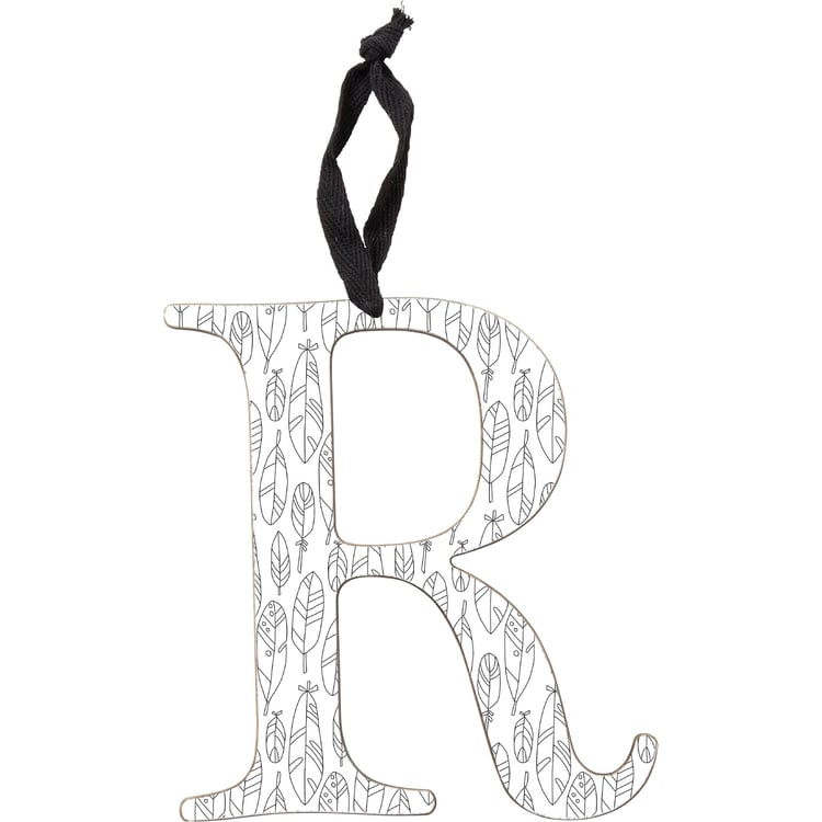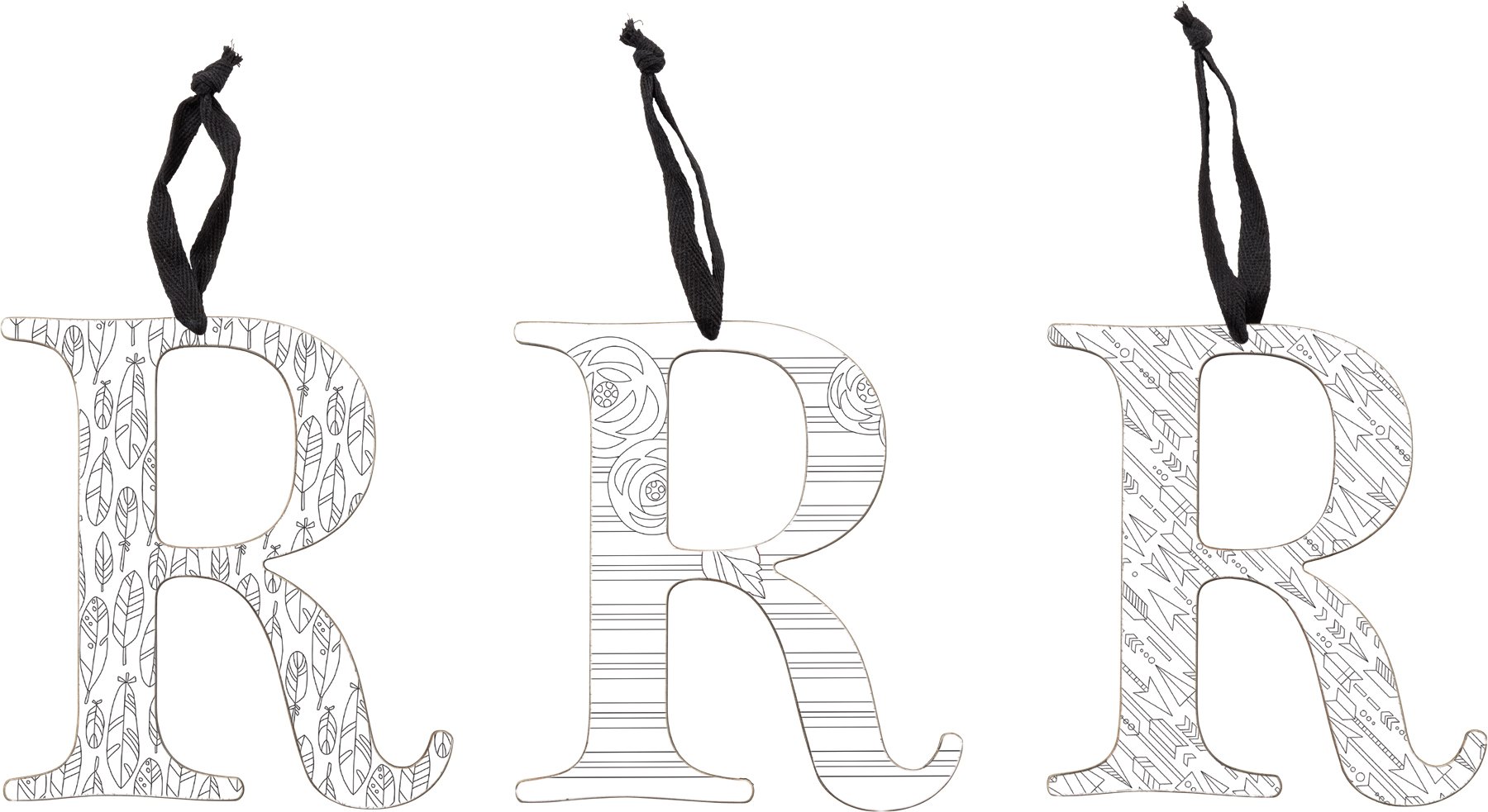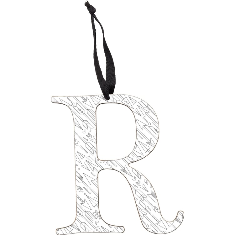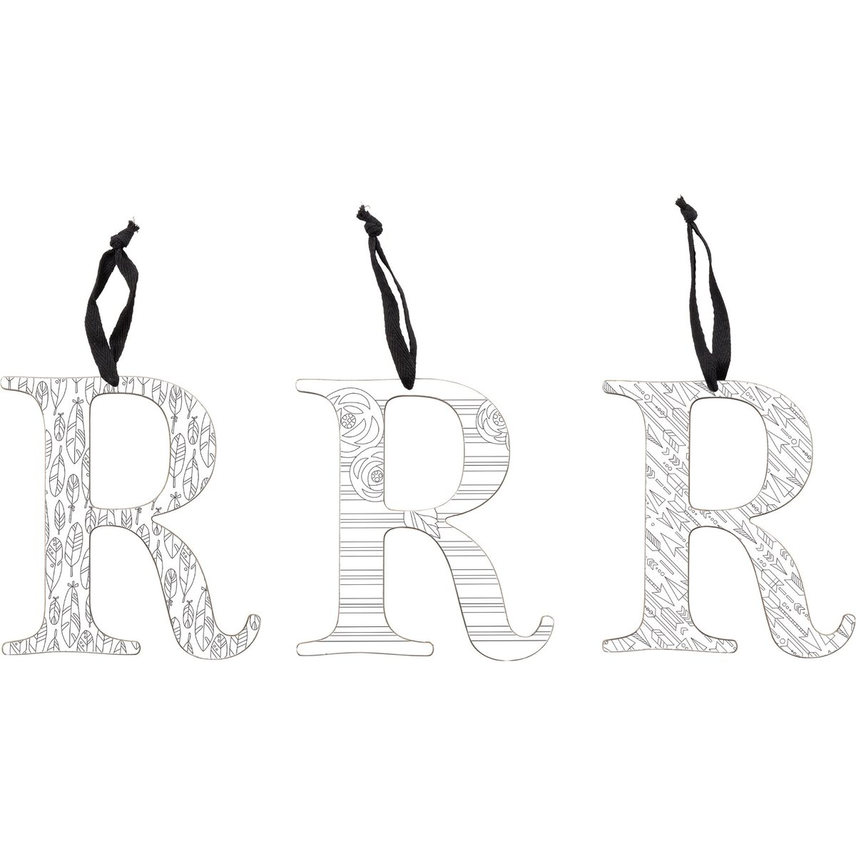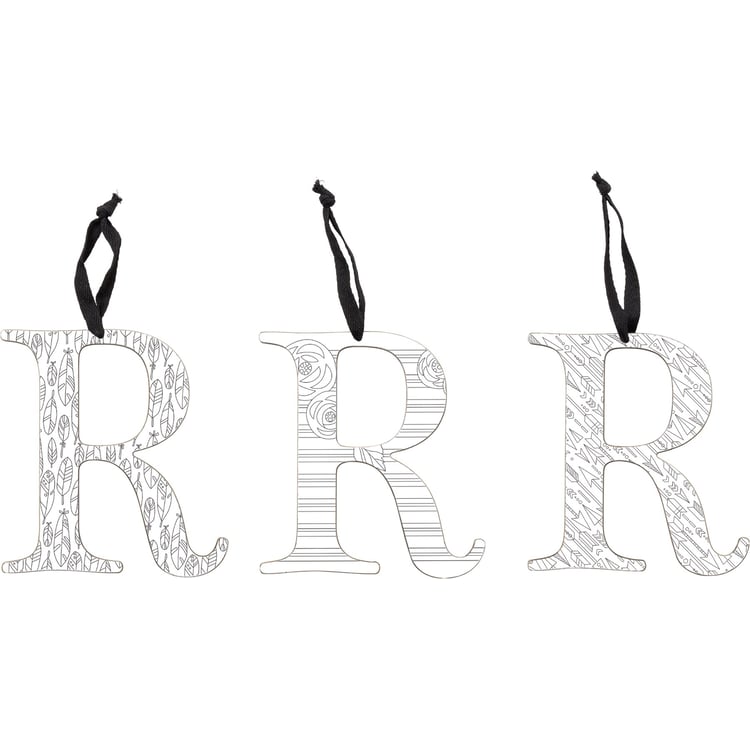 A set of wooden ornaments displaying a cutout letter "R" design with stylish black and white coloring book patterns that can be colored in with colored pencils or markers to add personal style! Letter ornament set features 3 letter "R" ornaments with one of each hand illustrated geometric pattern including feathers, arrows, and flowers with lines. Letter ornaments also feature coordinating black color on the sides and back. Each letter ornament is easy to hang via the attached black cotton tape hanger. A set of stylish home accents perfect for adding personality to everyday home decor.