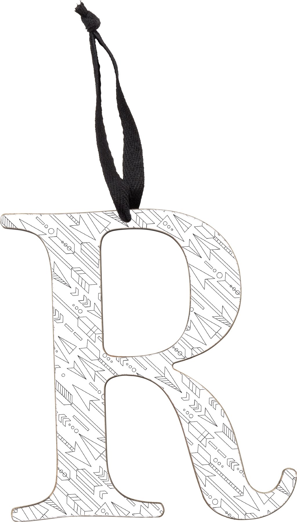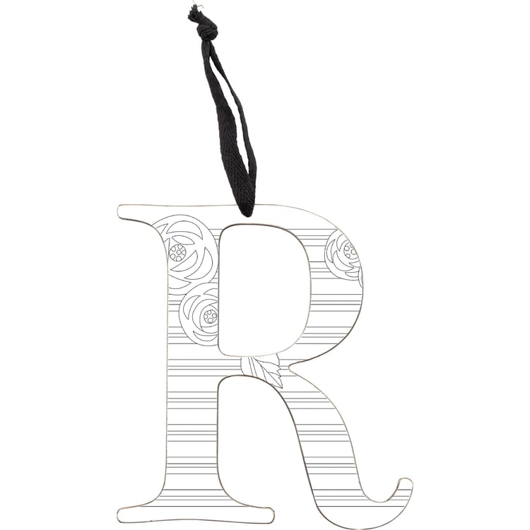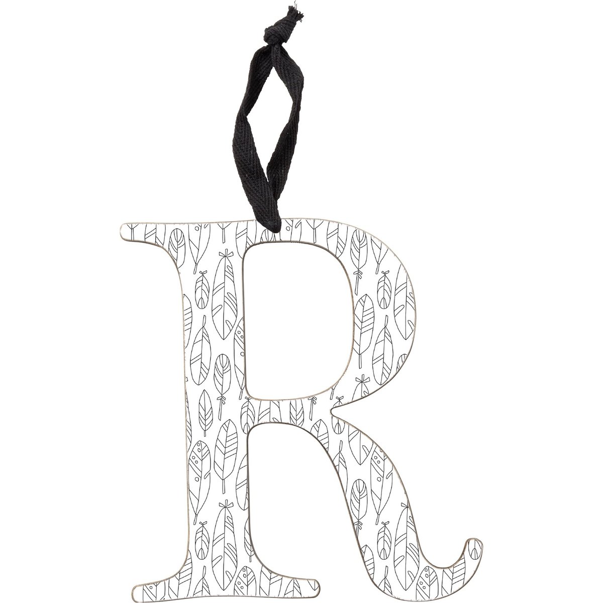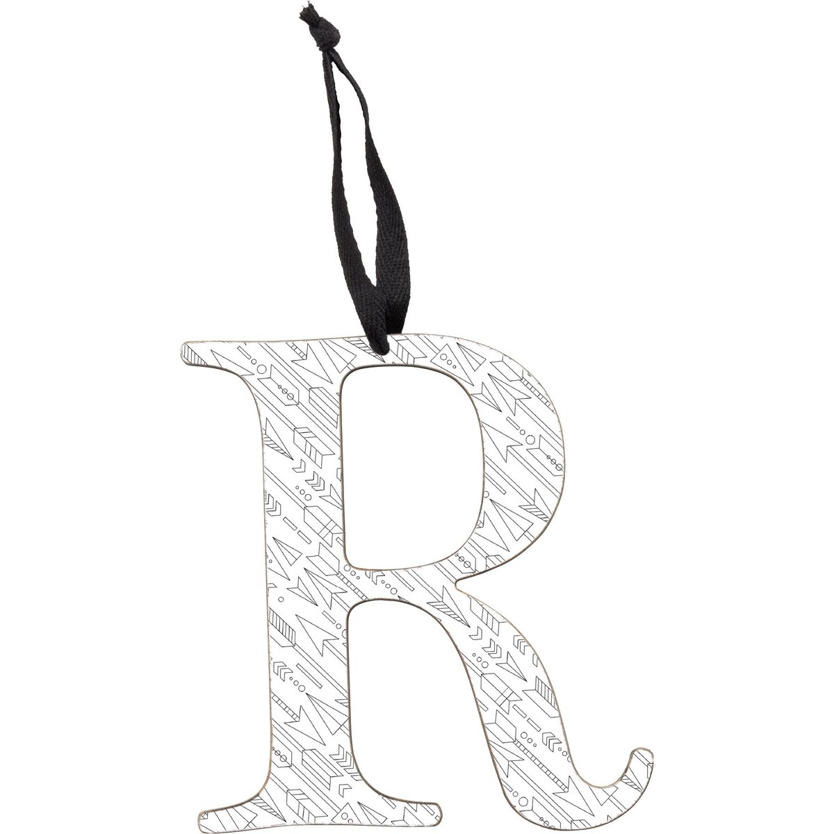 A set of wooden ornaments displaying a cutout letter "R" design with stylish black and white coloring book patterns that can be colored in with colored pencils or markers to add personal style! Letter ornament set features 3 letter "R" ornaments with one of each hand illustrated geometric pattern including feathers, arrows, and flowers with lines. Letter ornaments also feature coordinating black color on the sides and back. Each letter ornament is easy to hang via the attached black cotton tape hanger. A set of stylish home accents perfect for adding personality to everyday home decor.