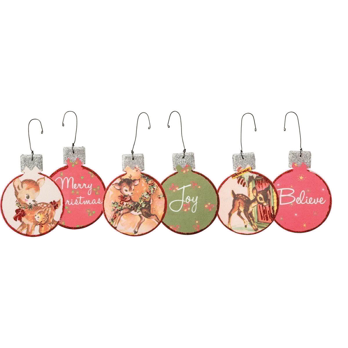 A set of three double-sided retro-inspired wooden ornaments. Set lends three unique fawn designs on one side of each respective ornament and "Merry Christmas," "Joy," and "Believe" sentiments on the reverse with holly designs. Glitter accents and soft palette add a whimsical touch to traditional Christmas decor styles. Set complements well with other items in collection.