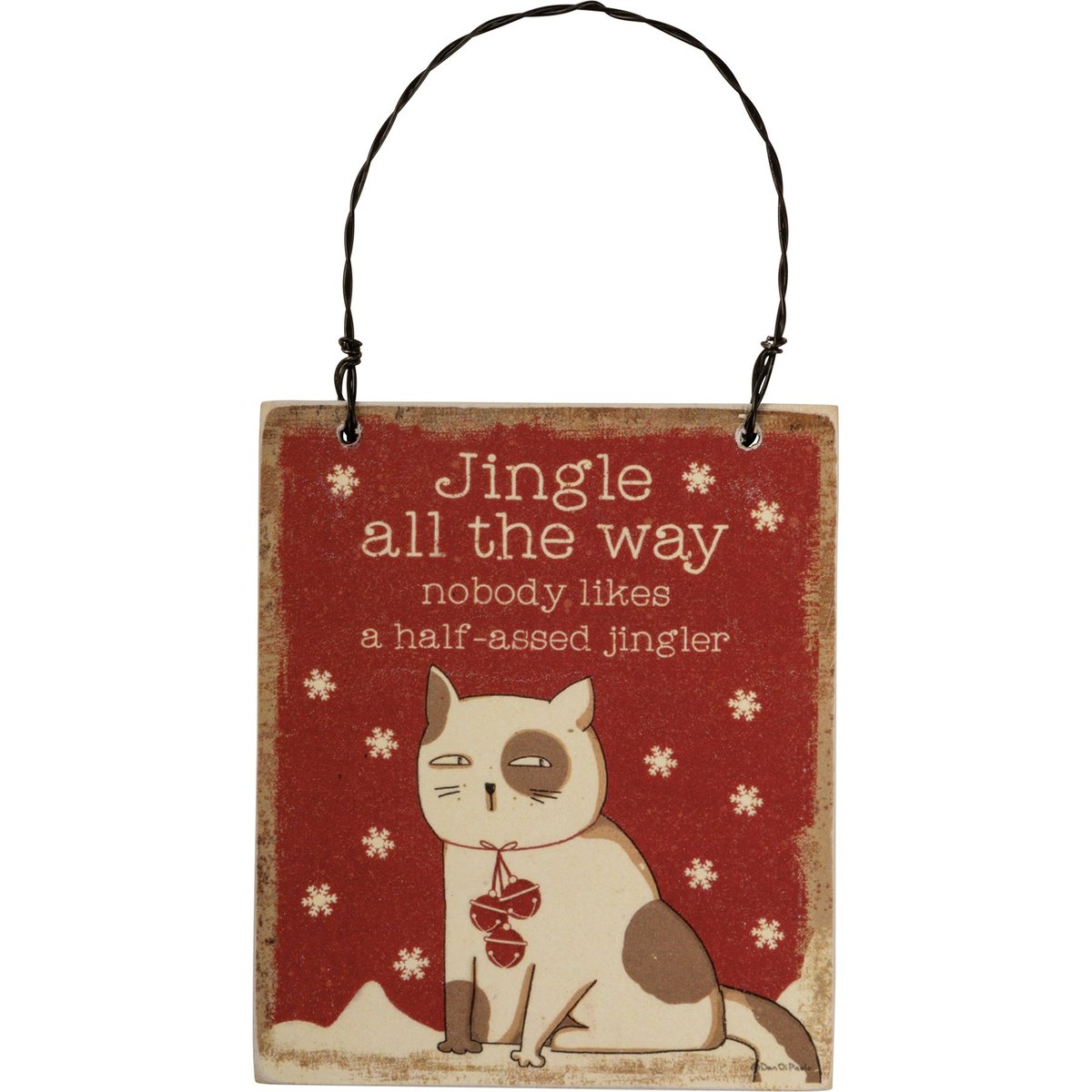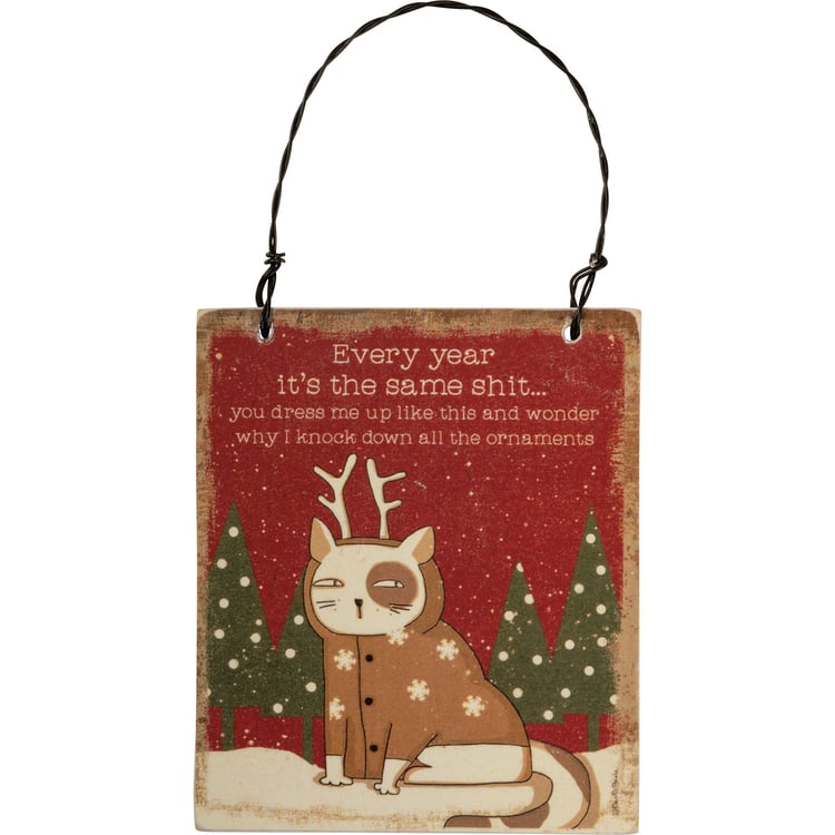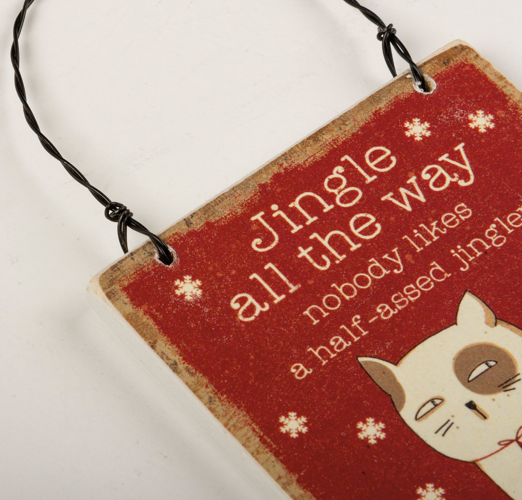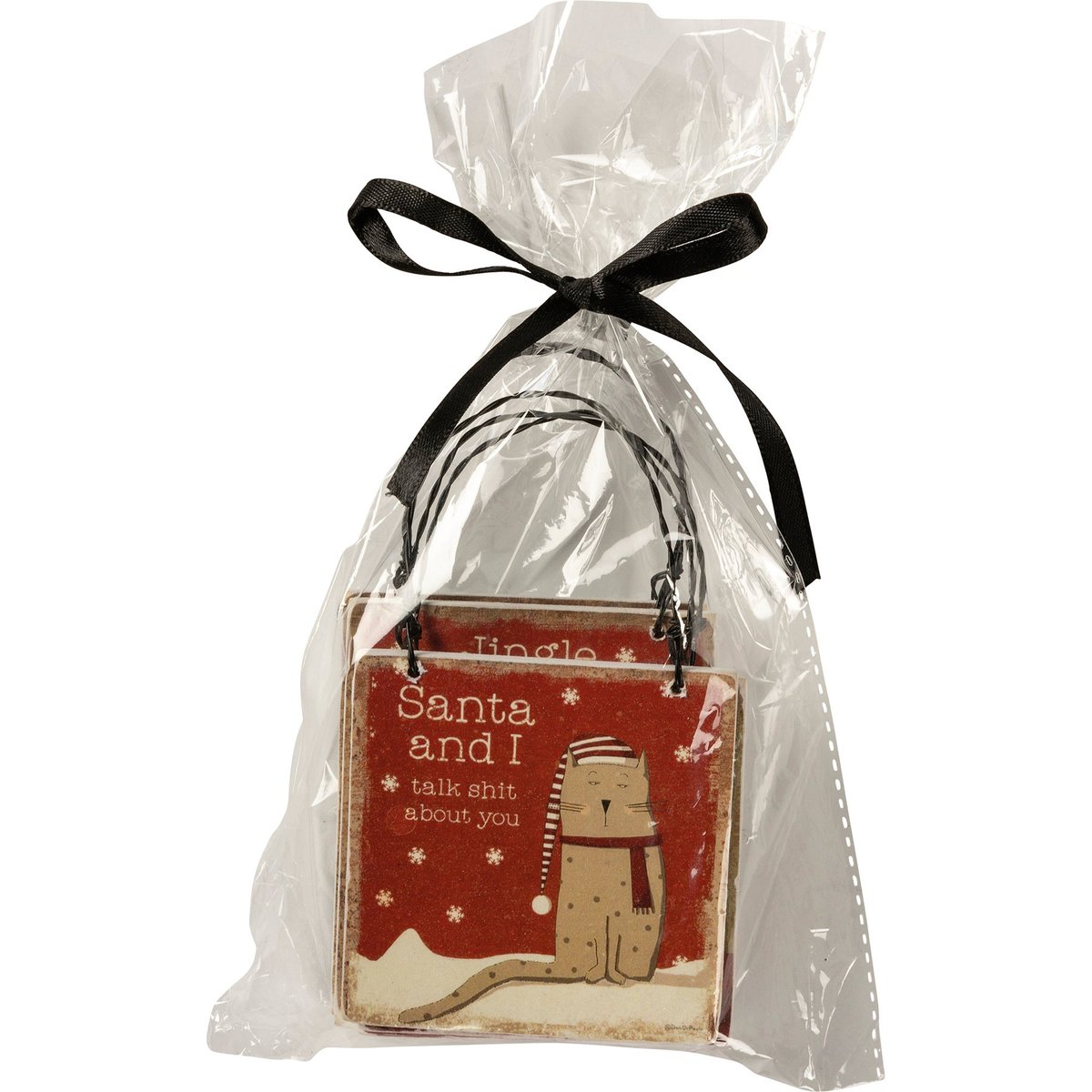 A set of five sassy cat ornaments for Christmas. Ornaments feature rustic designs and "Jingle All The Way Nobody Likes A Half-Assed Jingler," "Whatever Jingles Your Bells," "Every Year It's The Same Shit... You Dress Me Up Like This And Wonder Why I Knock Down All The Ornaments," "I Was Good... The Dog, Not So Much," and "Santa And I Talk Shit About You" sentiments. Ornaments easily hang by attached wire loops.