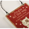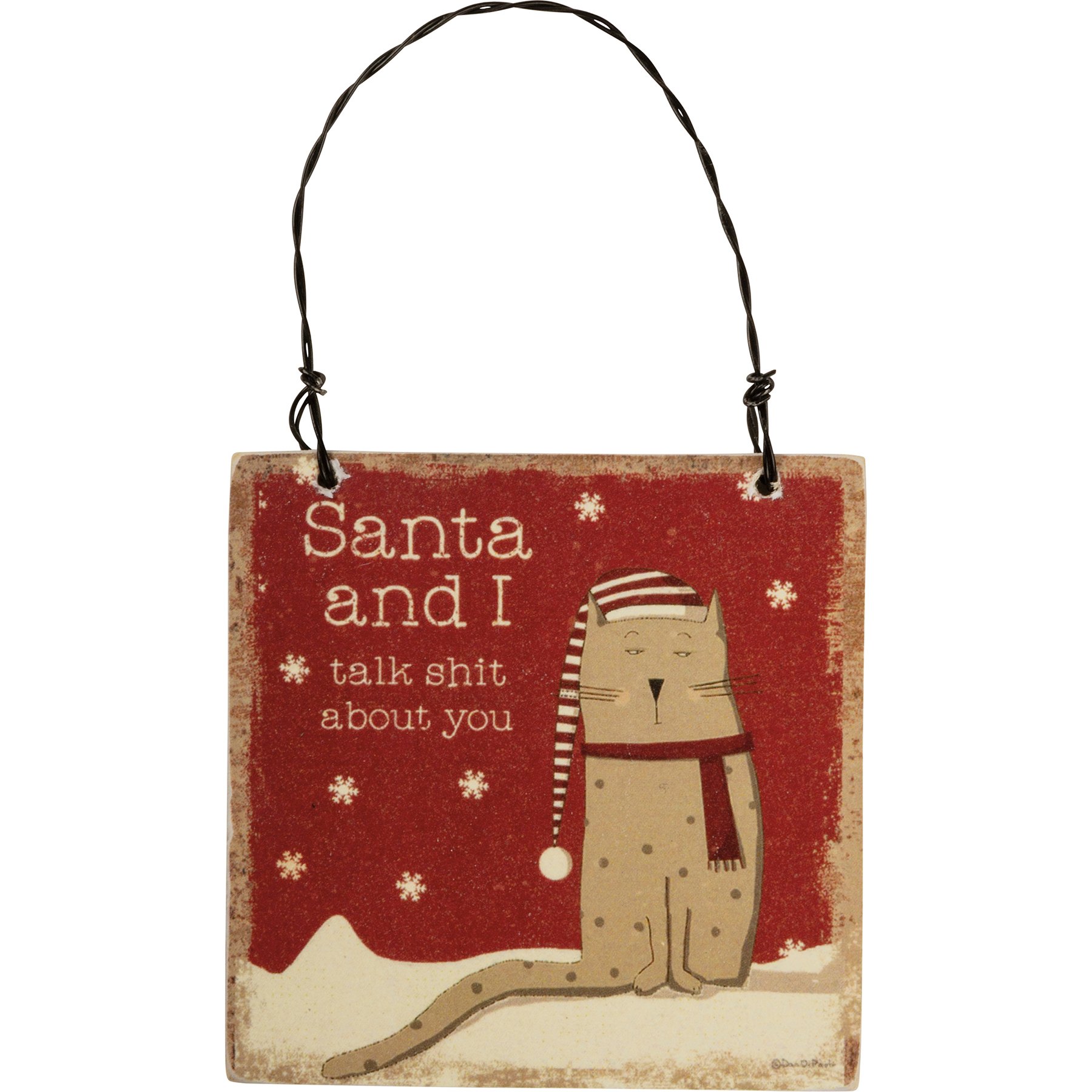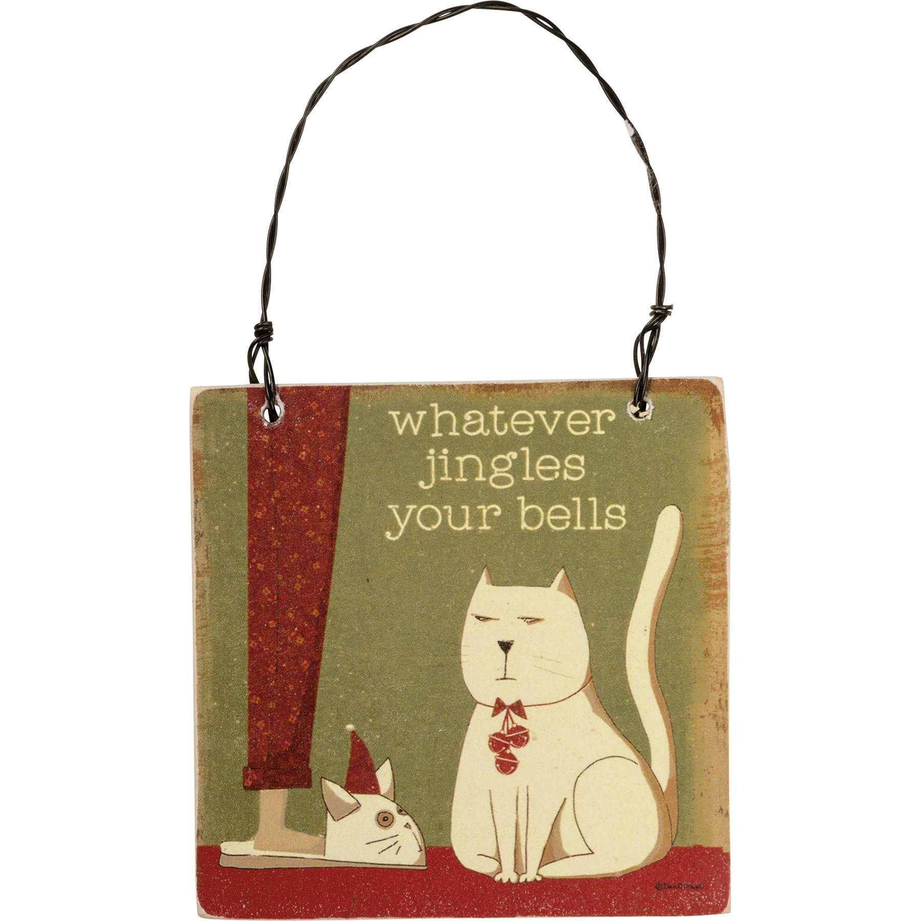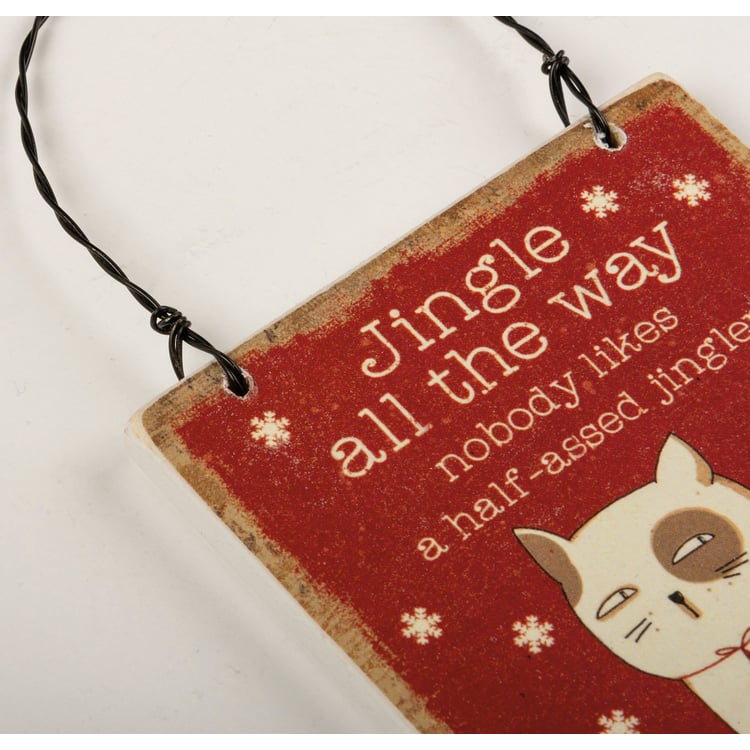 A set of five sassy cat ornaments for Christmas. Ornaments feature rustic designs and "Jingle All The Way Nobody Likes A Half-Assed Jingler," "Whatever Jingles Your Bells," "Every Year It's The Same Shit... You Dress Me Up Like This And Wonder Why I Knock Down All The Ornaments," "I Was Good... The Dog, Not So Much," and "Santa And I Talk Shit About You" sentiments. Ornaments easily hang by attached wire loops.