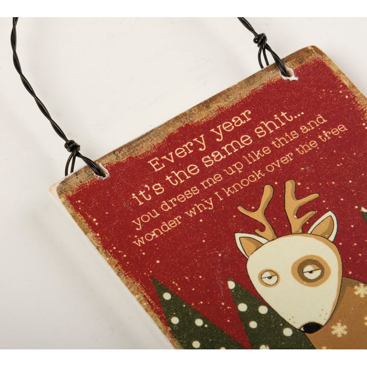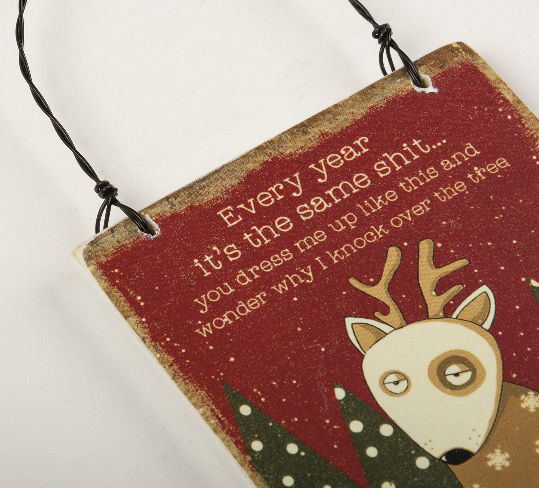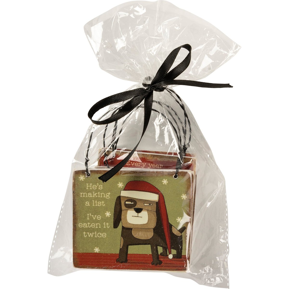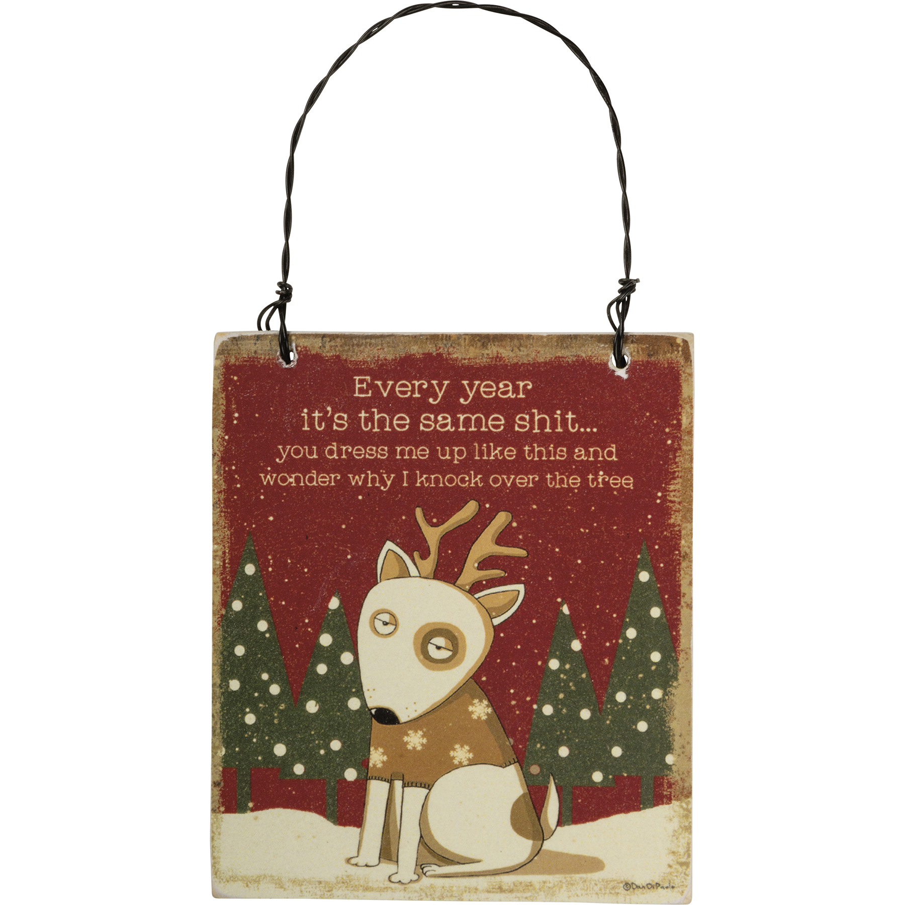 A set of five sassy dog ornaments for Christmas. Ornaments feature rustic designs and "Jingle All The Way Nobody Likes A Half-Assed Jingler," "He Sees You When You're Eating He Knows When You've Got Cookies," "Every Year It's The Same Shit... You Dress Me Up Like This And Wonder Why I Knock Over The Tree," "He's Making A List I've Eaten It Twice," and "Santa And I Talk Shit About You" sentiments. Ornaments easily hang by attached wire loops.