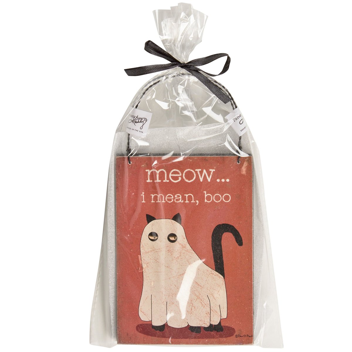 A set of wooden ornaments from our Holiday Pet Collection featuring two fun pet inspired Halloween designs and sentiments in a rustic style. Seasonal ornaments display individual designs including a sassy cat and a sassy dog in ghost costumes with matching sentiments that read "Meow... I Mean Boo," and "Woof... I Mean Boo." Our Sassy Pet ornament set is easy to hang for display via attached twisted wire hangers. Set comes packaged together in a polybag and tied with black ribbon. A fun set of pet-themed ornaments perfect for seasonal display.