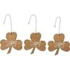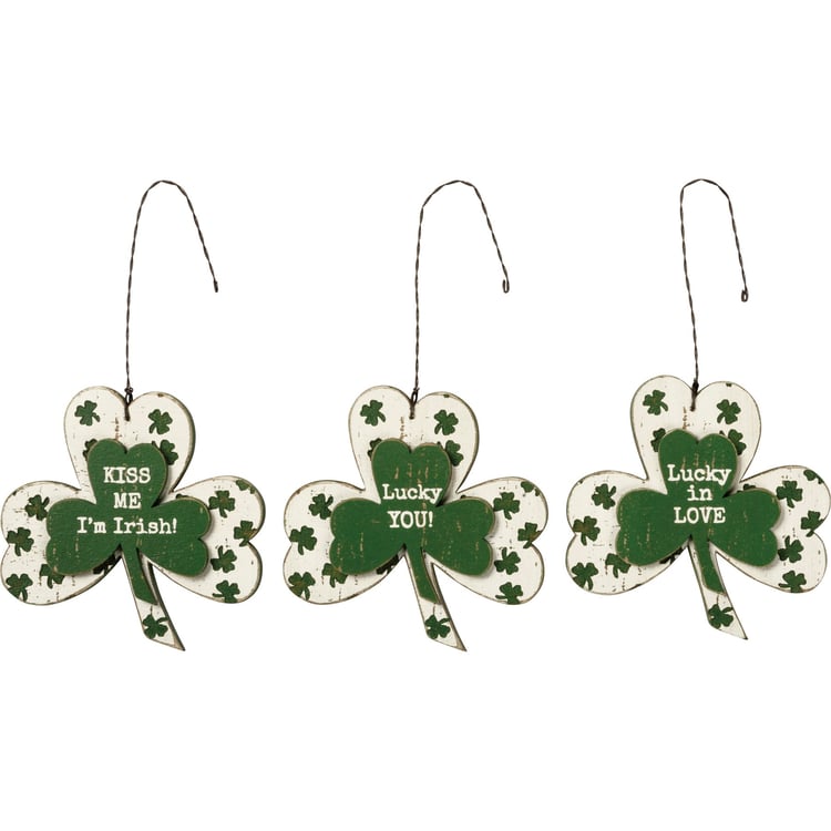 A set of three rustic wooden ornaments from our St. Patrick's Day Collection featuring debossed shamrock designs on base and dimensional solid shamrock additions with "KISS ME I'm Irish!", "Lucky YOU!", and "Lucky In LOVE" sentiments. Our Shamrock ornaments feature twisted wire hooks for easy hanging.
