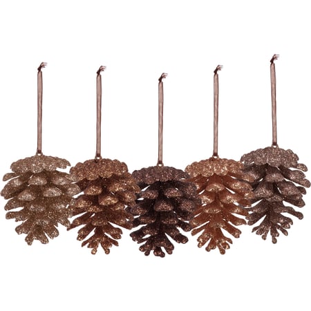 A set of five decorative ornaments from our Christmas Collection displaying a pinecone design with glitter detail and various shades of color. Our small pinecone Christmas ornaments are ready to hang via the attached ribbon loop. Set is packaged together in a poly bag tied with ribbon. A rustic seasonal home accent perfect for a Christmas tree or for gifting.