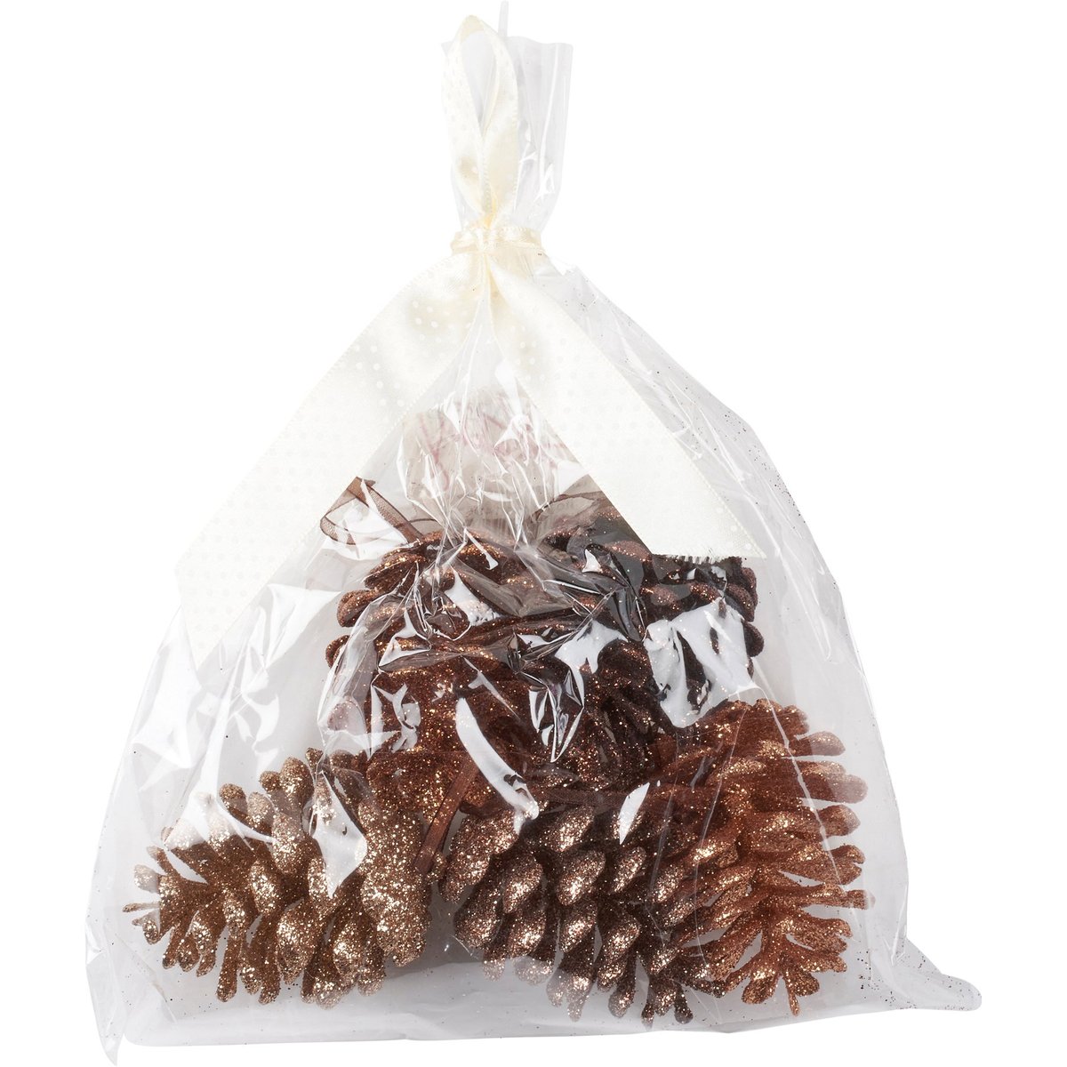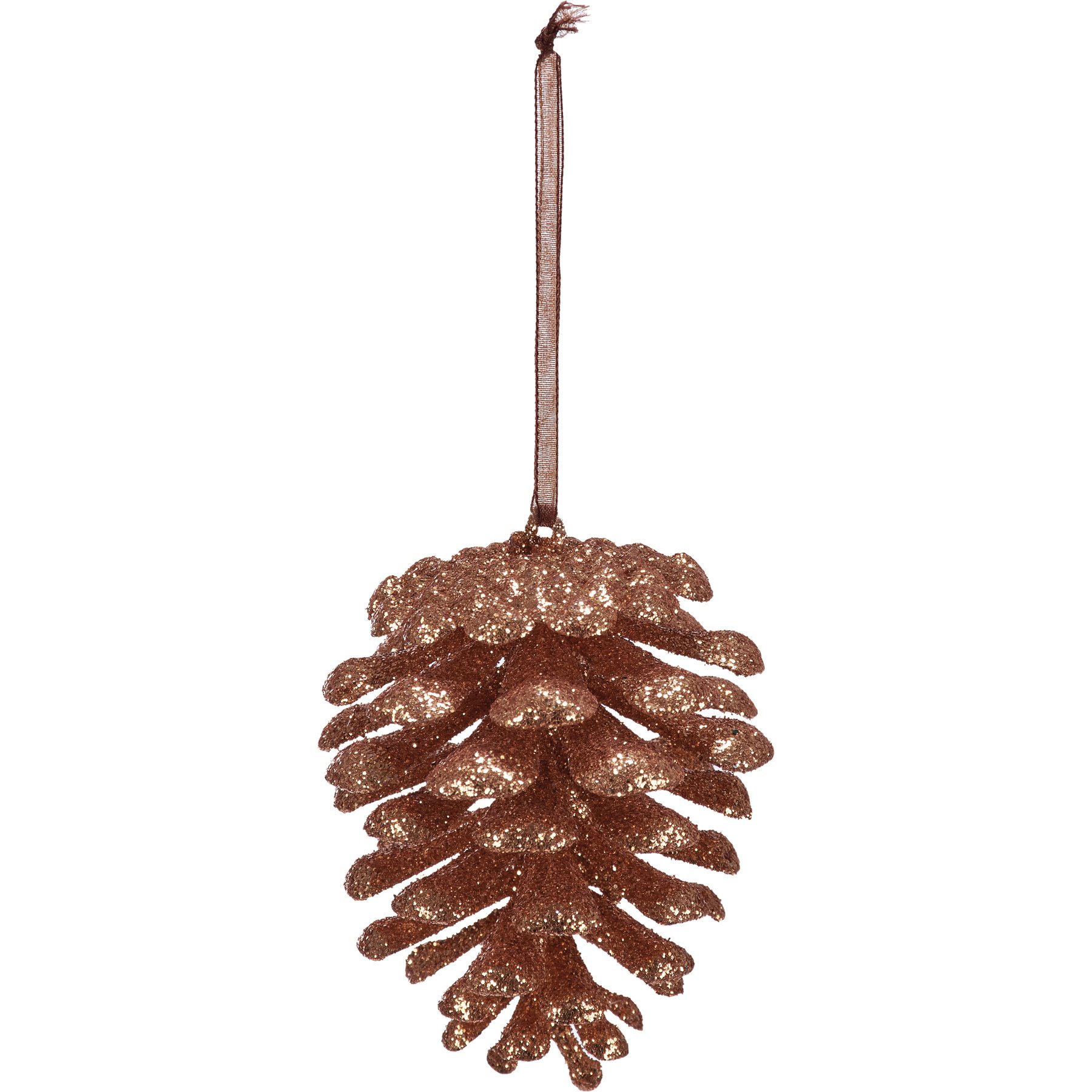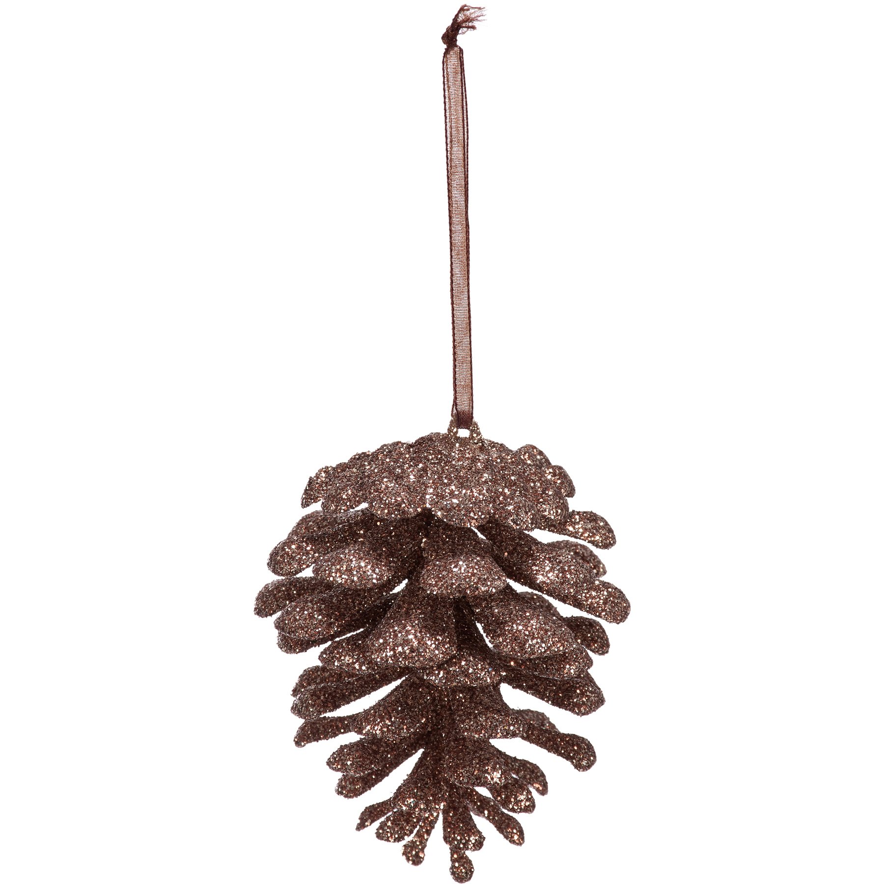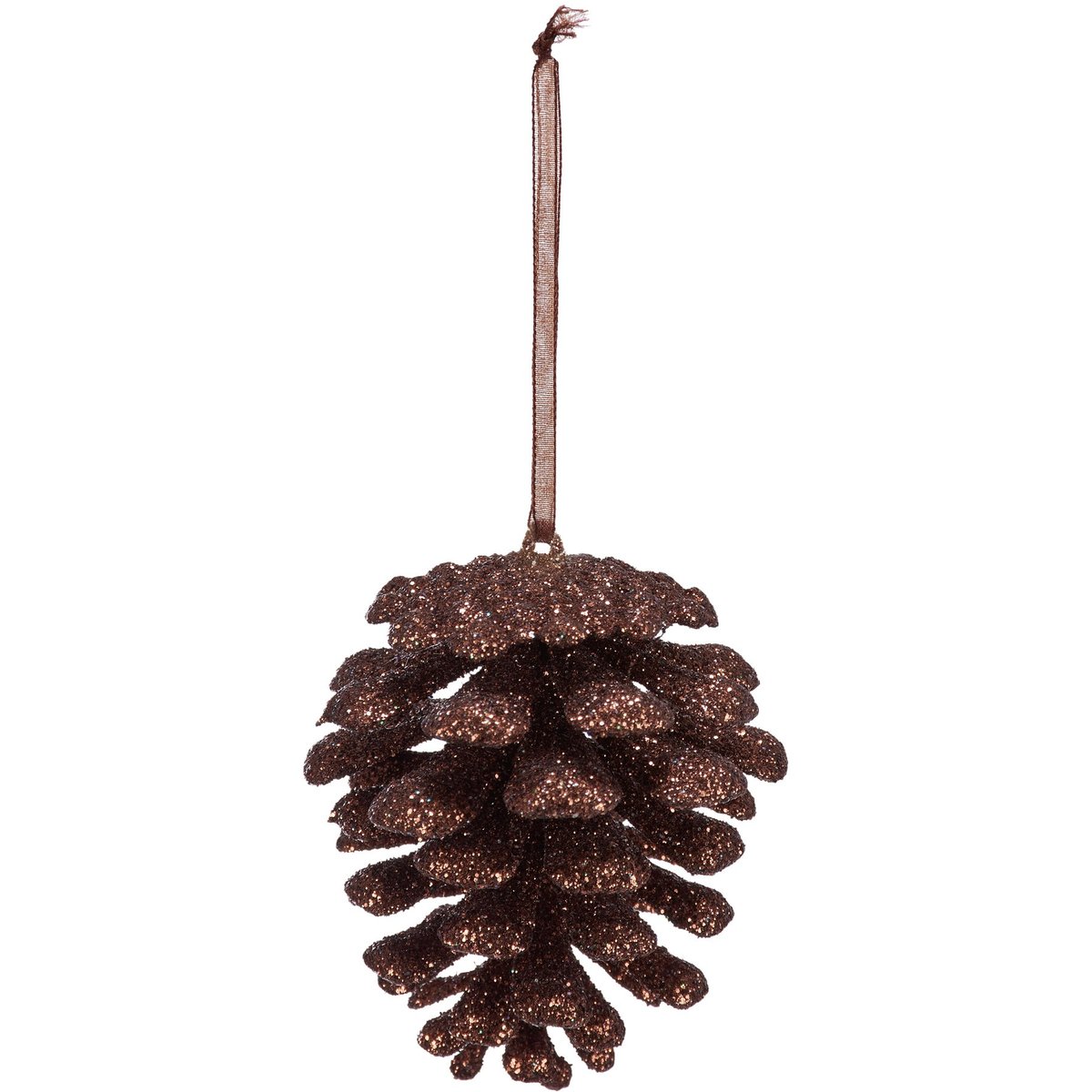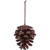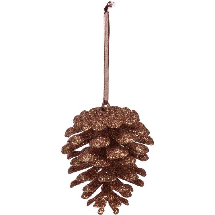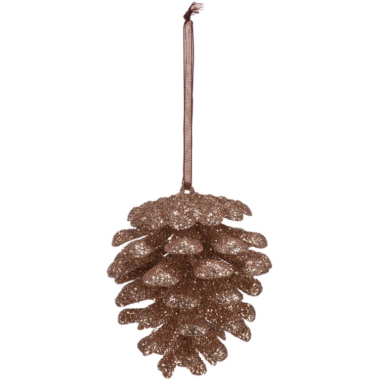 A set of five decorative ornaments from our Christmas Collection displaying a pinecone design with glitter detail and various shades of color. Our small pinecone Christmas ornaments are ready to hang via the attached ribbon loop. Set is packaged together in a poly bag tied with ribbon. A rustic seasonal home accent perfect for a Christmas tree or for gifting.