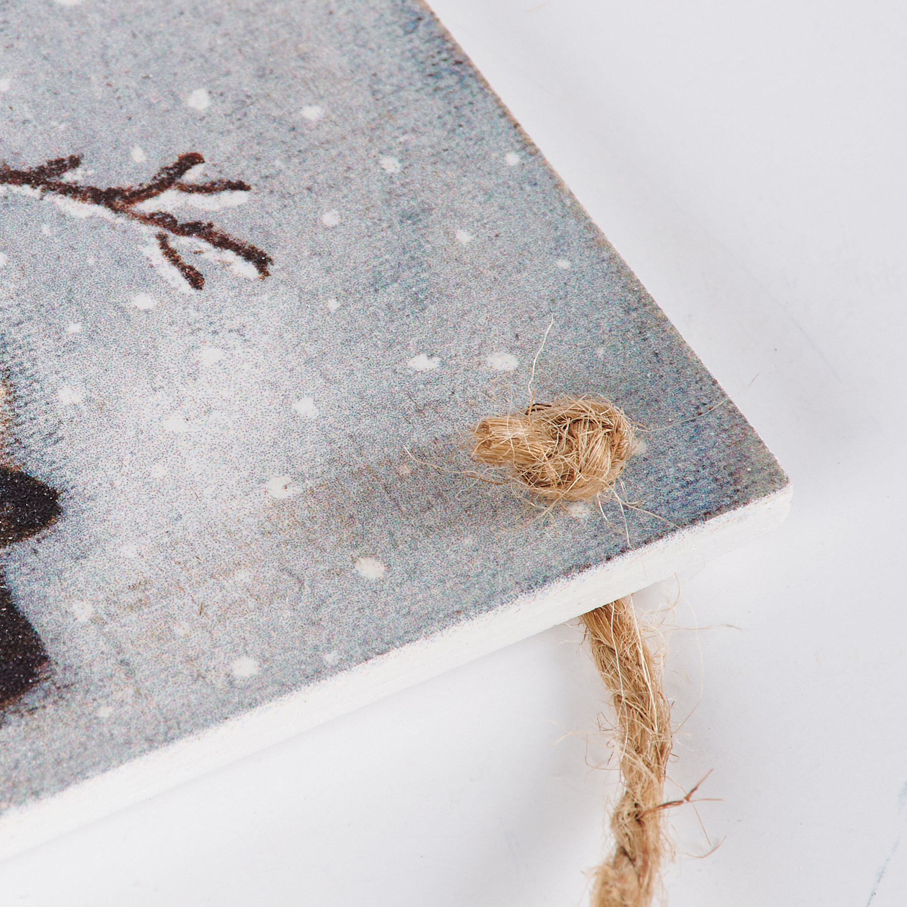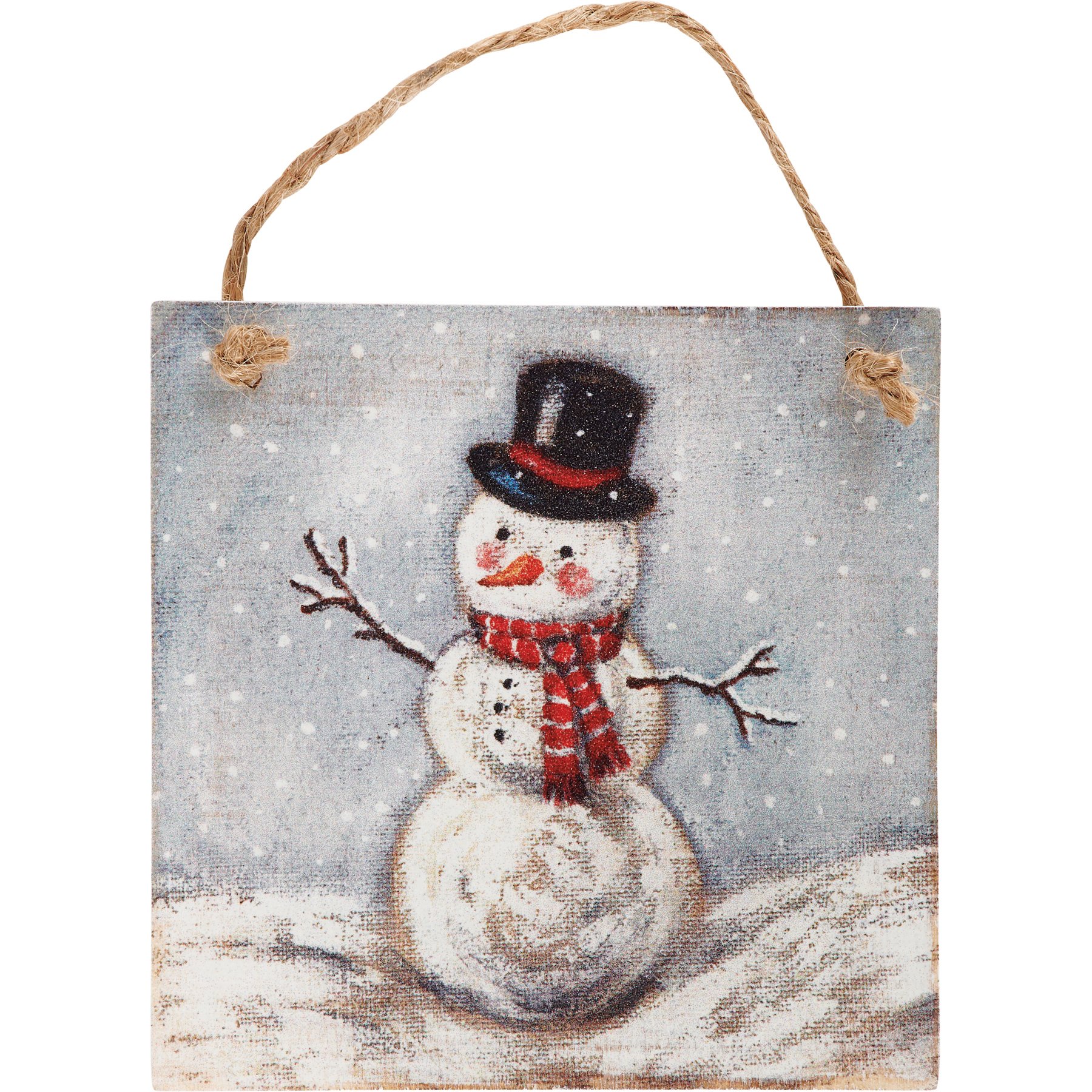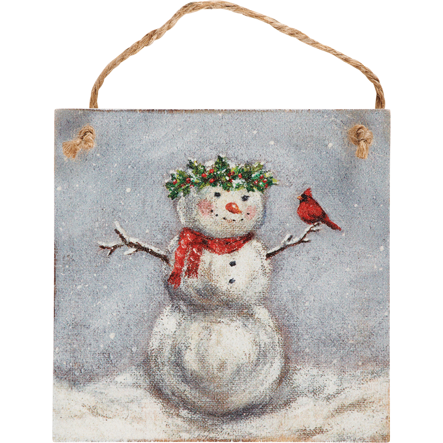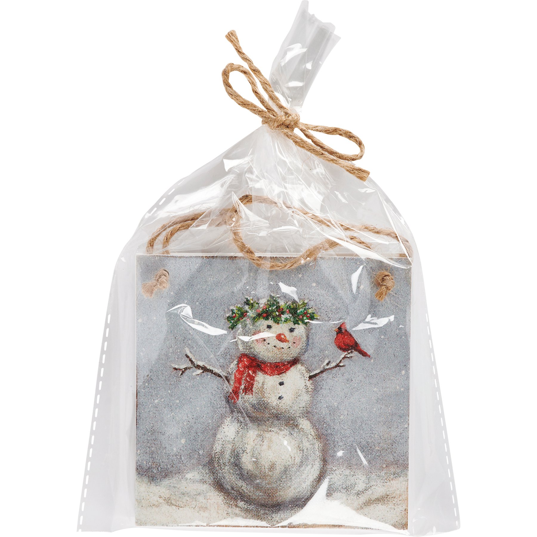 A set of two decorative ornaments from our Christmas Collection featuring hand painted designs of a snow family. Each ornament includes individual designs and coordinating white color on the sides and backs. Easily display using attached jute hangers. Our Snow Family ornament set comes packaged together in a poly bag tied with jute ribbon. A rustic set of seasonal home accents with a variety of display options.