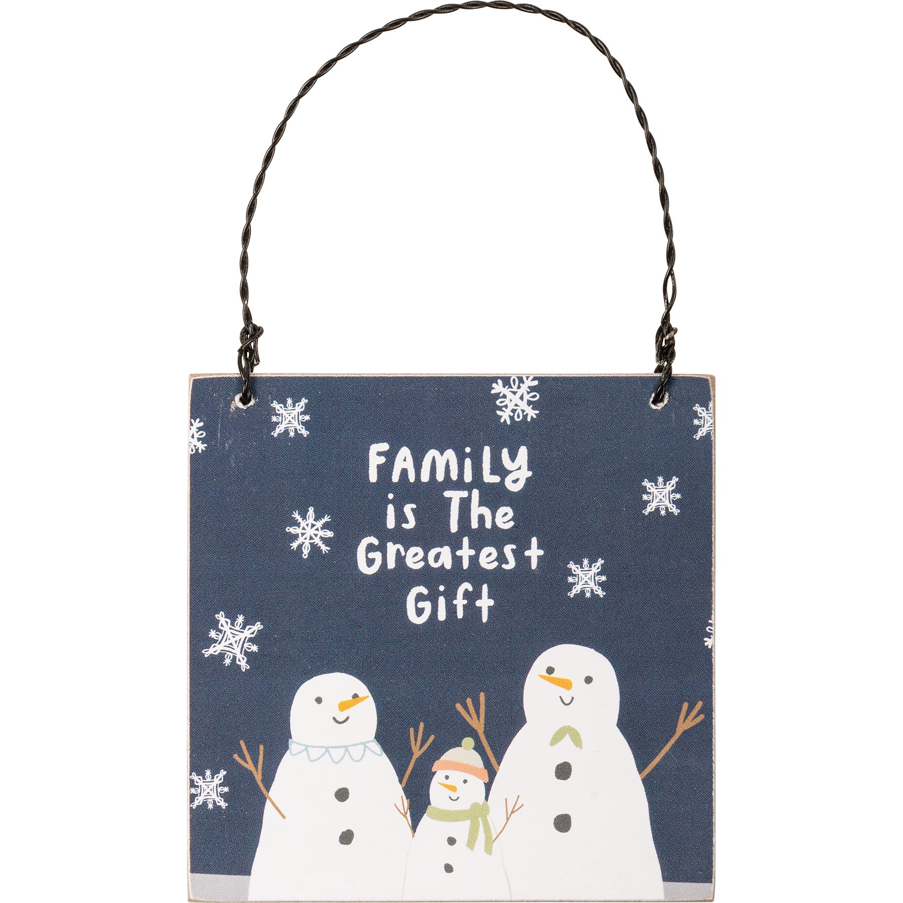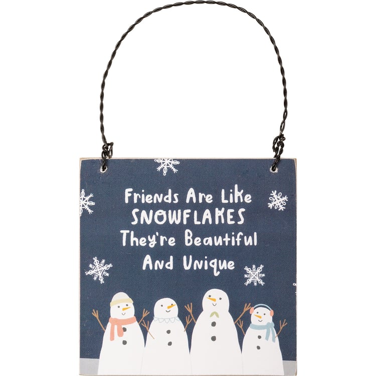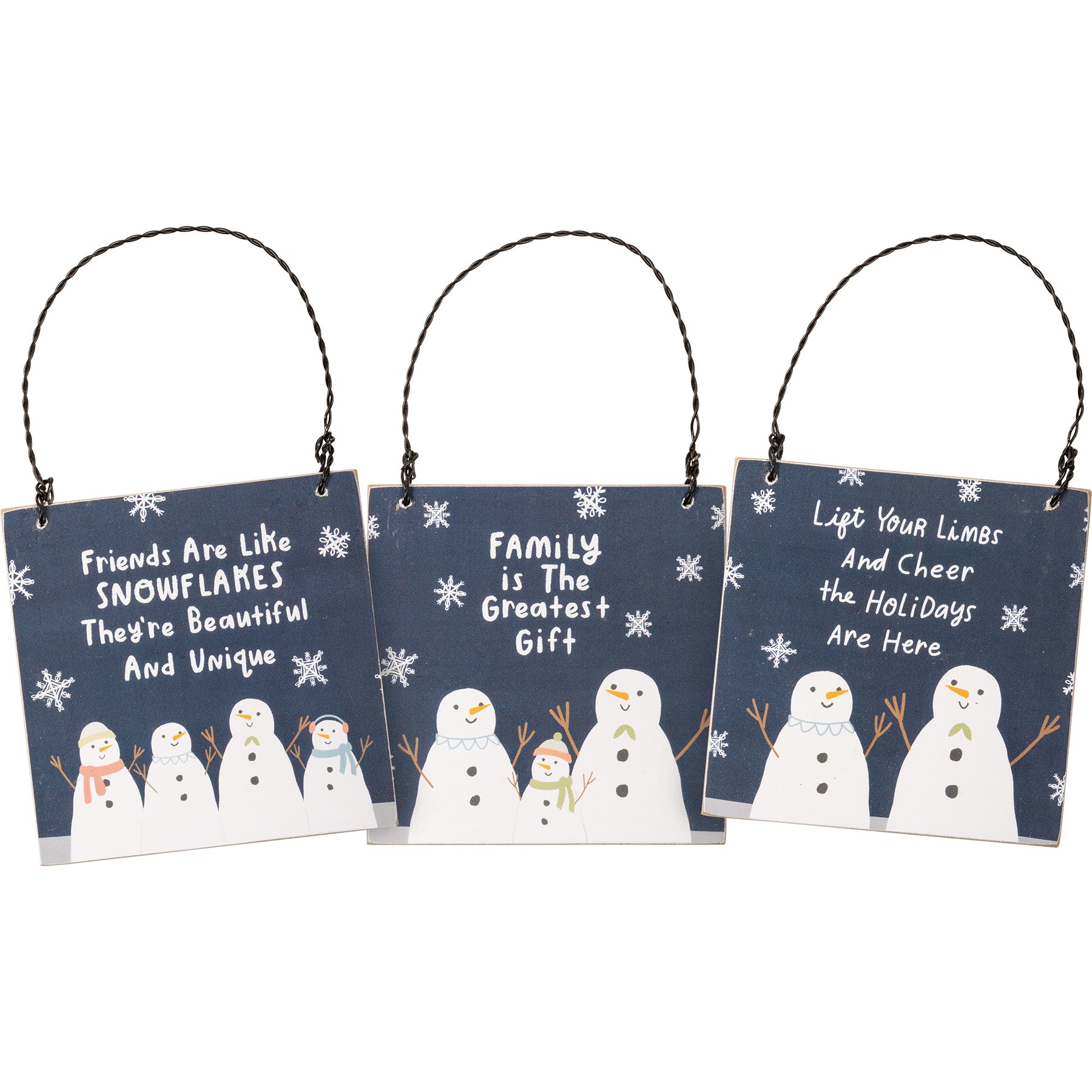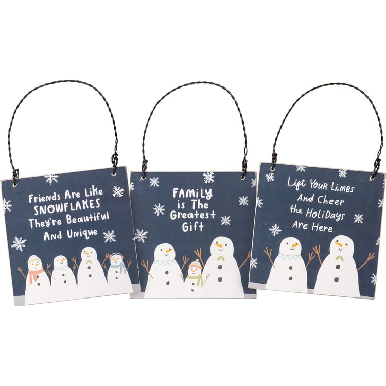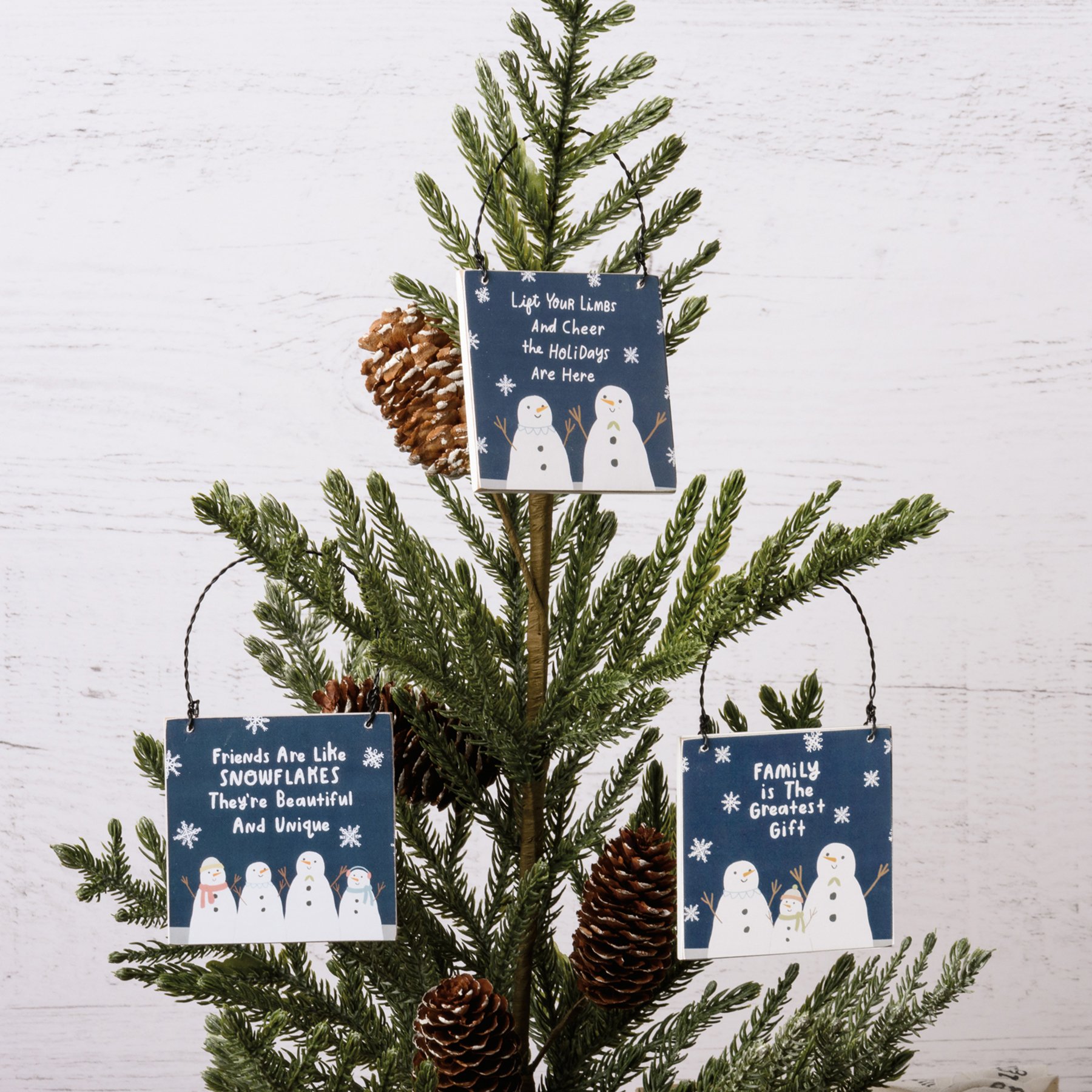 A set of three wooden Christmas ornaments featuring a blue palette with snowmen and snowflakes designs, and "Lift Your Limbs And Cheer The Holidays Are Here," "Family Is The Greatest Gift," and "Friends Are Like Snowflakes They're Beautiful And Unique" sentiments. Our Snowmen Christmas ornaments easily hang via twisted wire hangers.