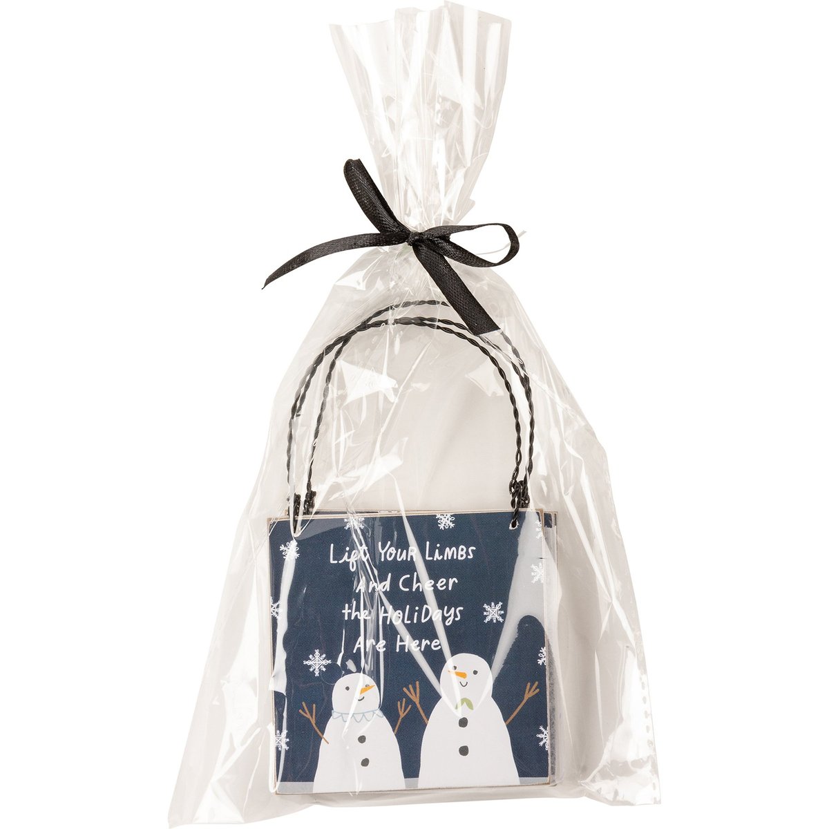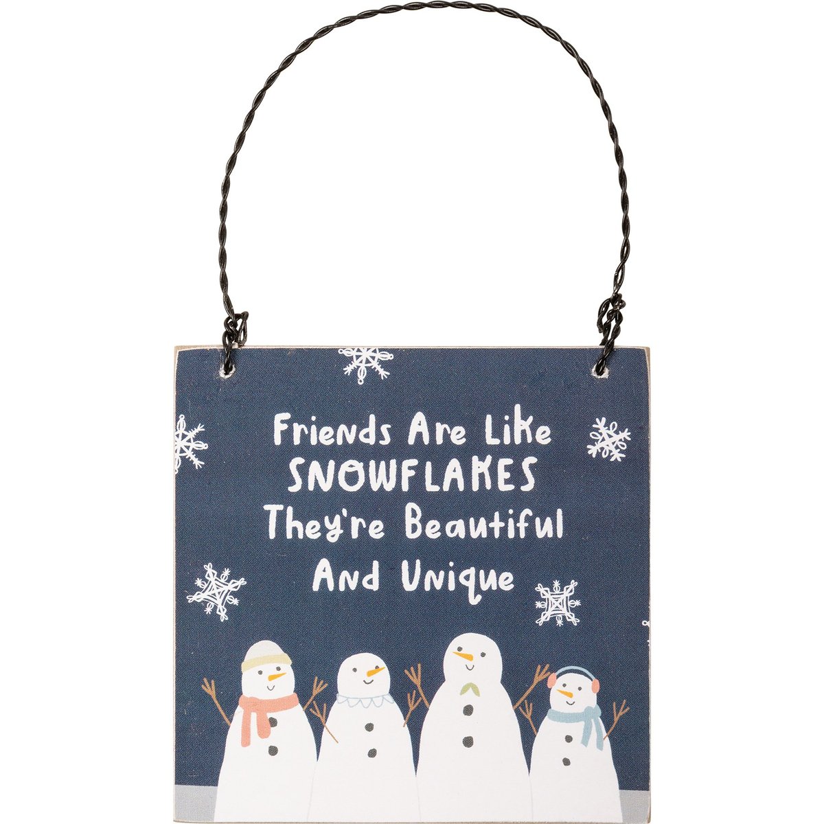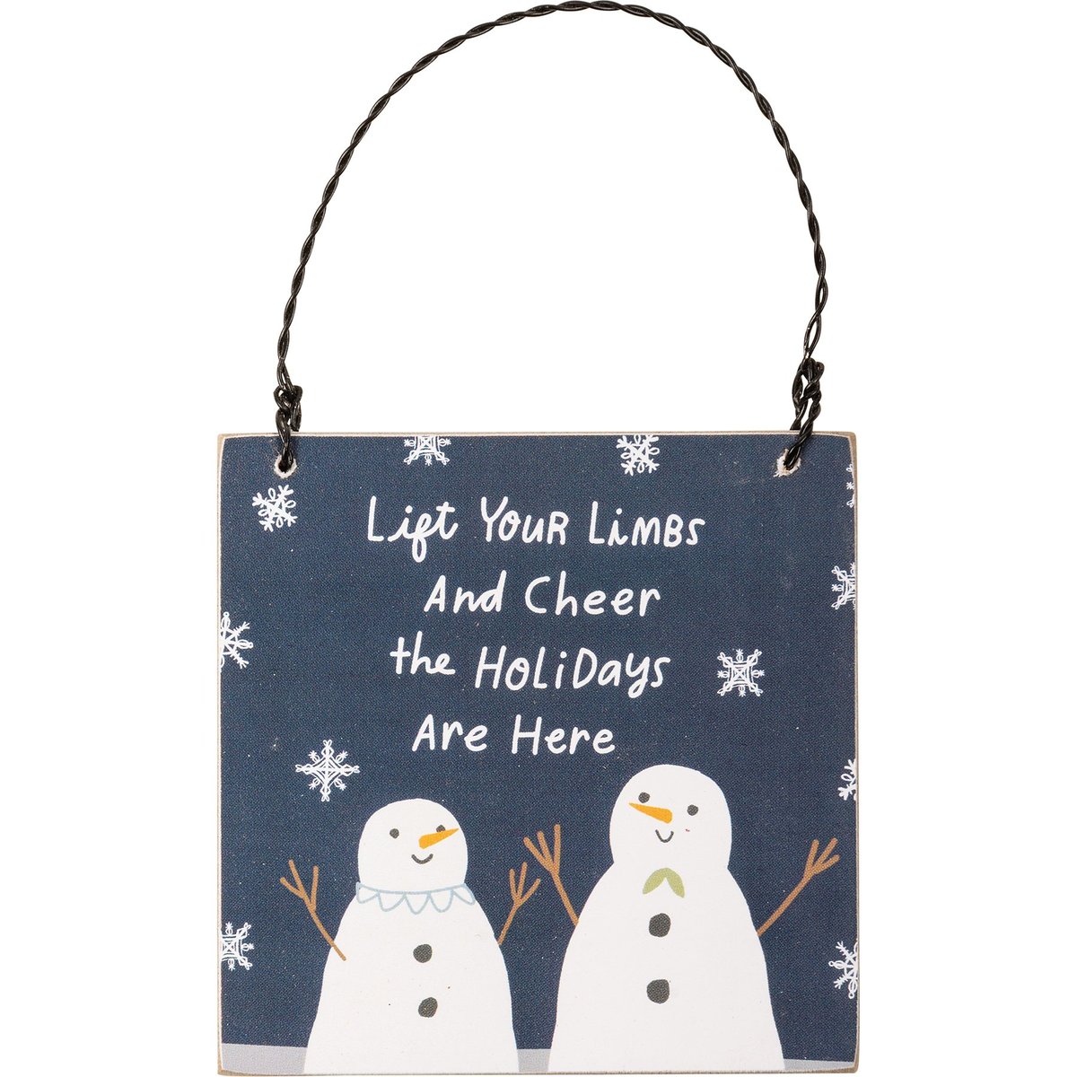 A set of three wooden Christmas ornaments featuring a blue palette with snowmen and snowflakes designs, and "Lift Your Limbs And Cheer The Holidays Are Here," "Family Is The Greatest Gift," and "Friends Are Like Snowflakes They're Beautiful And Unique" sentiments. Our Snowmen Christmas ornaments easily hang via twisted wire hangers.