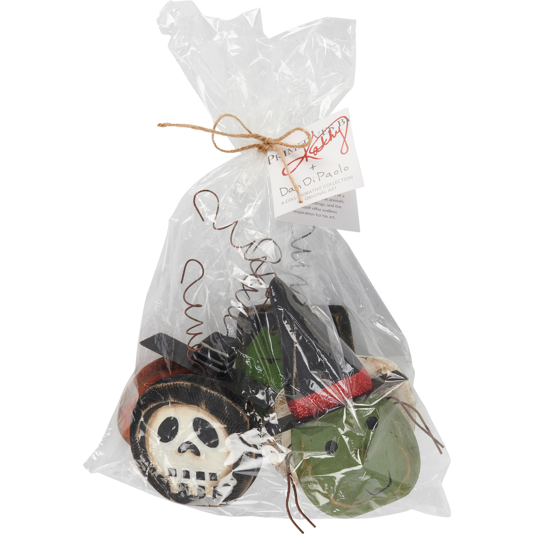 A set of six decorative ornaments from our Halloween Collection displaying hand carved and painted heads of a jack o'lantern, mummy, skeleton, witch, and monster. Ornaments feature distressed details with metal, linen, and glitter accents. Each ornament can be placed alongside décor or can hang via attached curly wire on back. Our Spooky ornament set comes packaged together in a poly bag tied with jute and hangtag. A rustic set of seasonal home accents with a variety of display options.