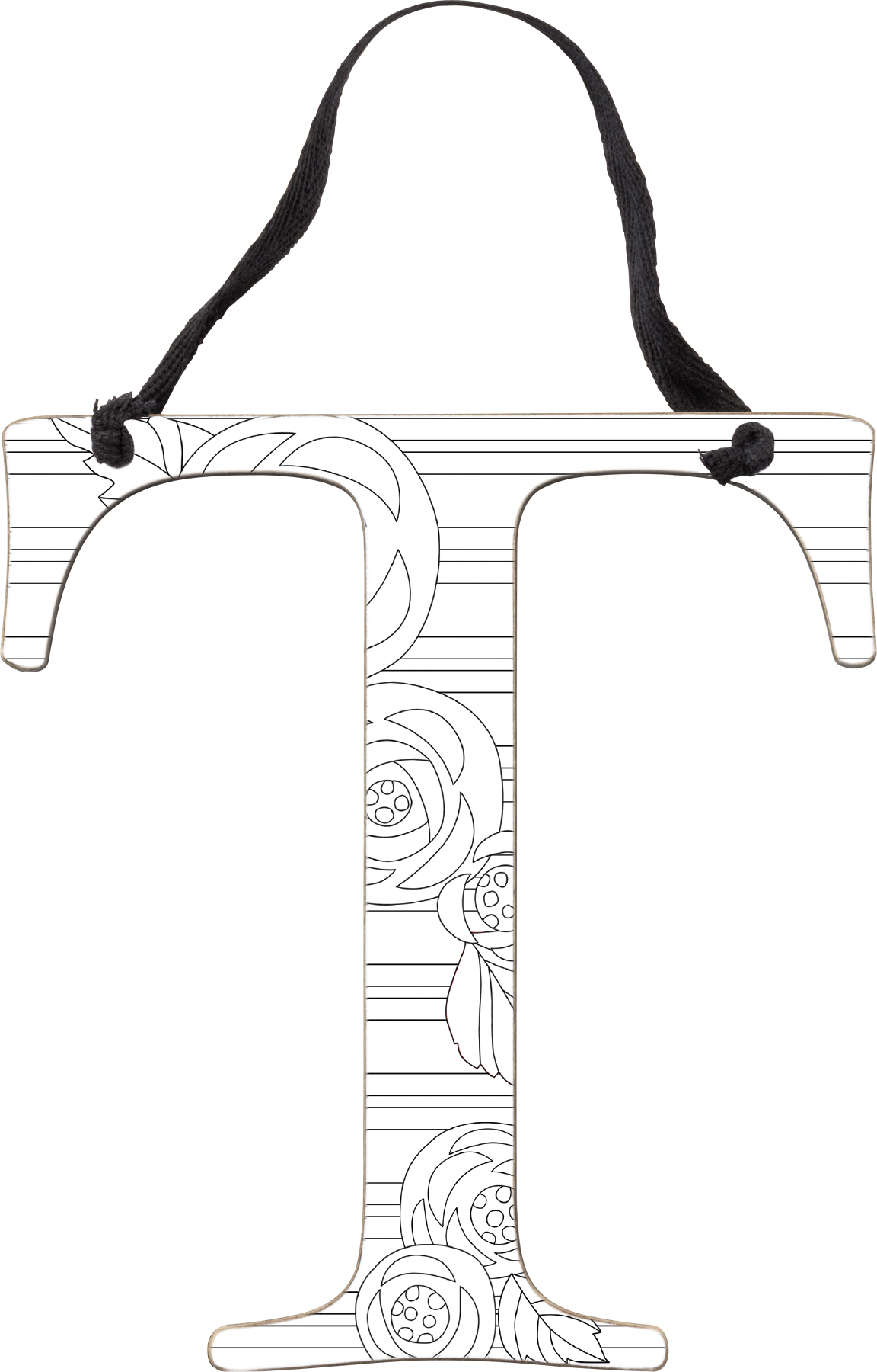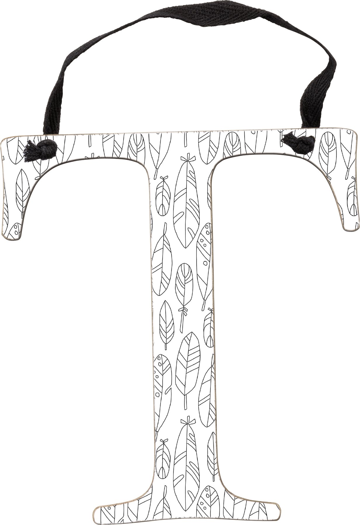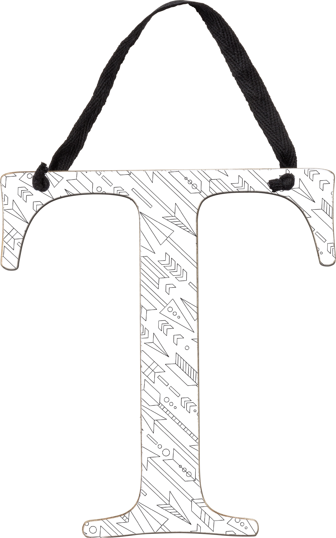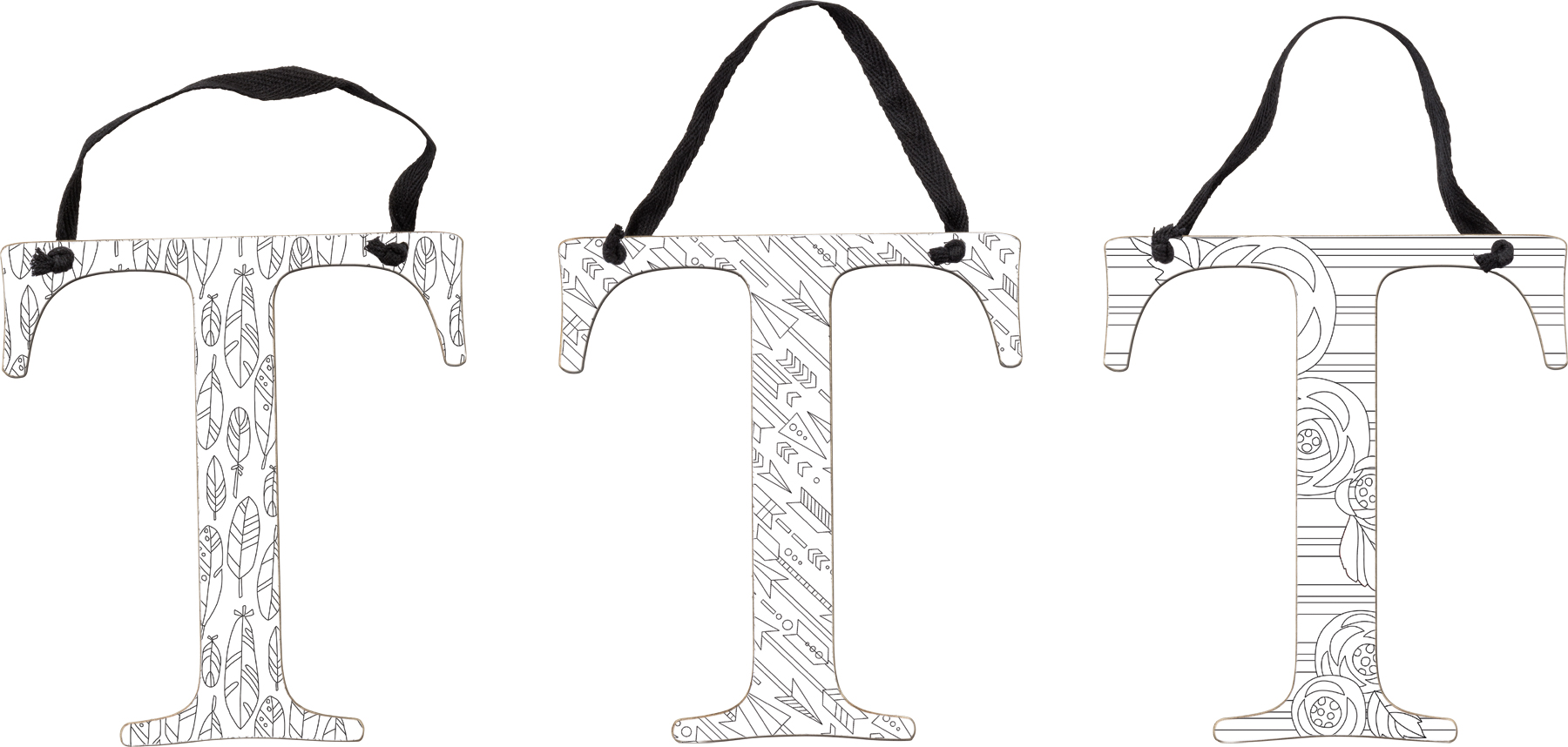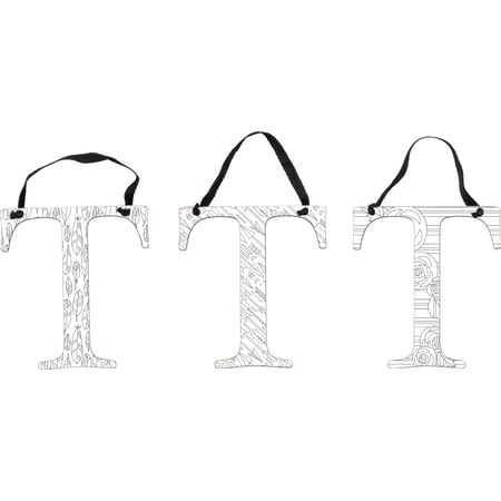 A set of wooden ornaments displaying a cutout letter "T" design with stylish black and white coloring book patterns that can be colored in with colored pencils or markers to add personal style! Letter ornament set features 3 letter "T" ornaments with one of each hand illustrated geometric pattern including feathers, arrows, and flowers with lines. Letter ornaments also feature coordinating black color on the sides and back. Each letter ornament is easy to hang via the attached black cotton tape hanger. A set of stylish home accents perfect for adding personality to everyday home decor.