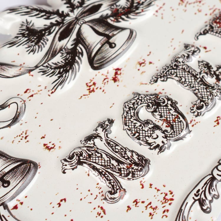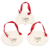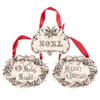 A set of 3 metal ornaments from our Christmas Collection featuring individual cutout shapes displaying vintage Christmas designs with seasonal sentiments and embossed details as well as a rust finish for an aged appearance. Vintage ornaments display seasonal sentiments including "O Holy Night," "Merry Christmas," and "Noel." Our Vintage Christmas ornament set is easy to hang for display via attached red ribbon hangers. Seasonal ornament set comes packaged together in a polybag and tied with string. A set of vintage Christmas home accents perfect for a Christmas tree or for seasonal decorating.