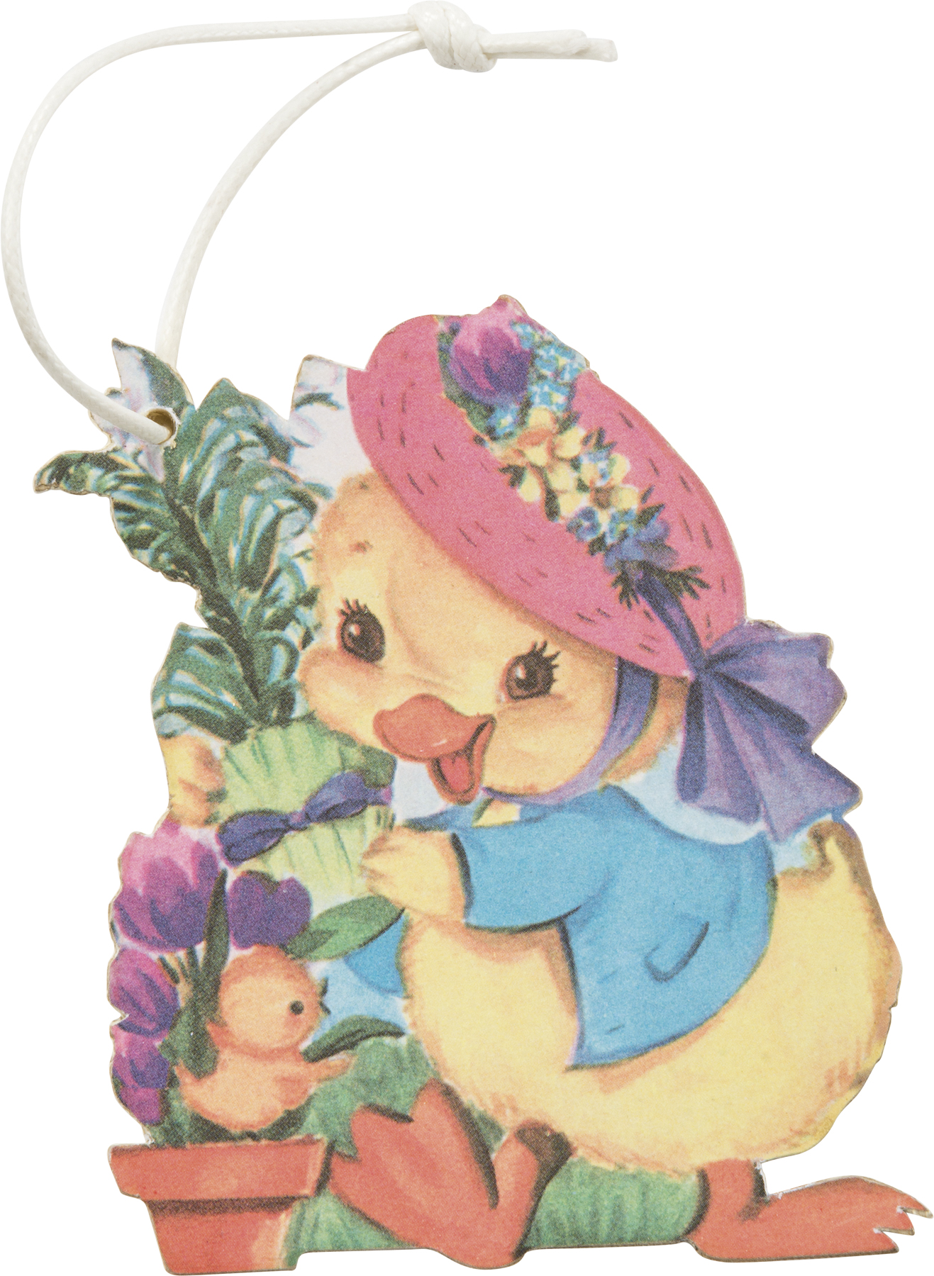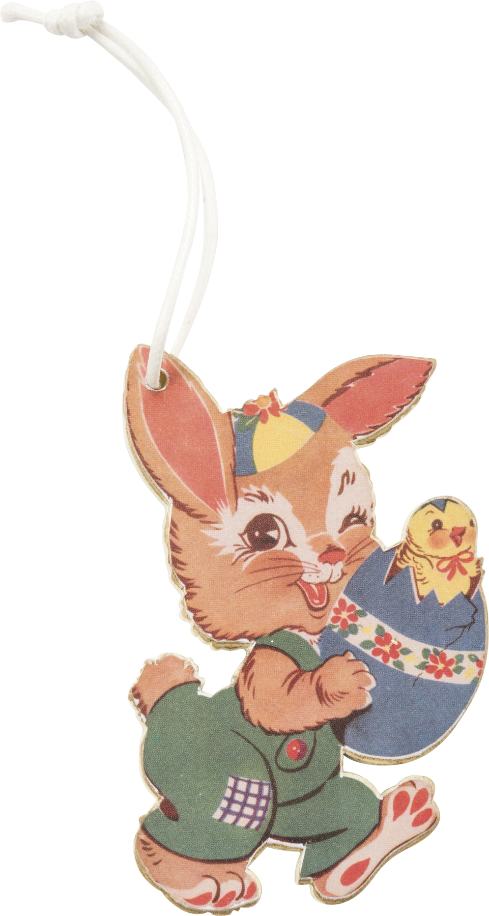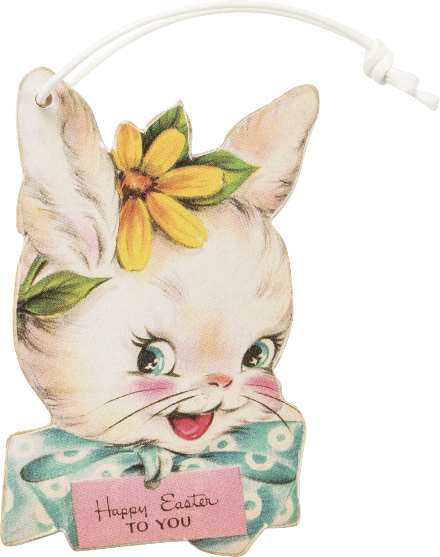 A set of four vintage-inspired wooden ornaments for Easter lending varying retro bunny, lamb, and duckling illustrations. Contains top loop fabric, back magnet, and reverse "To: & From:" spaces to use as gift tags, ornaments, or magnets.