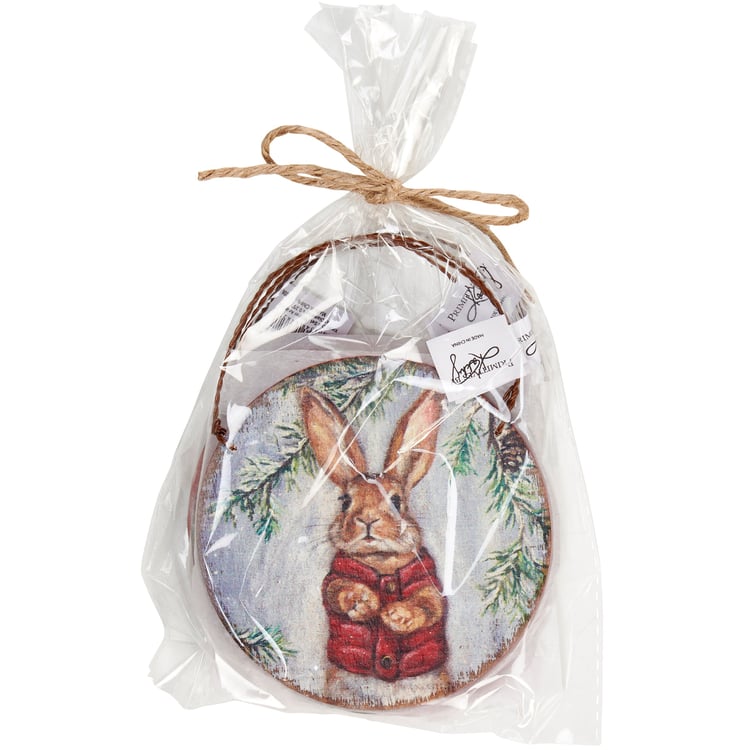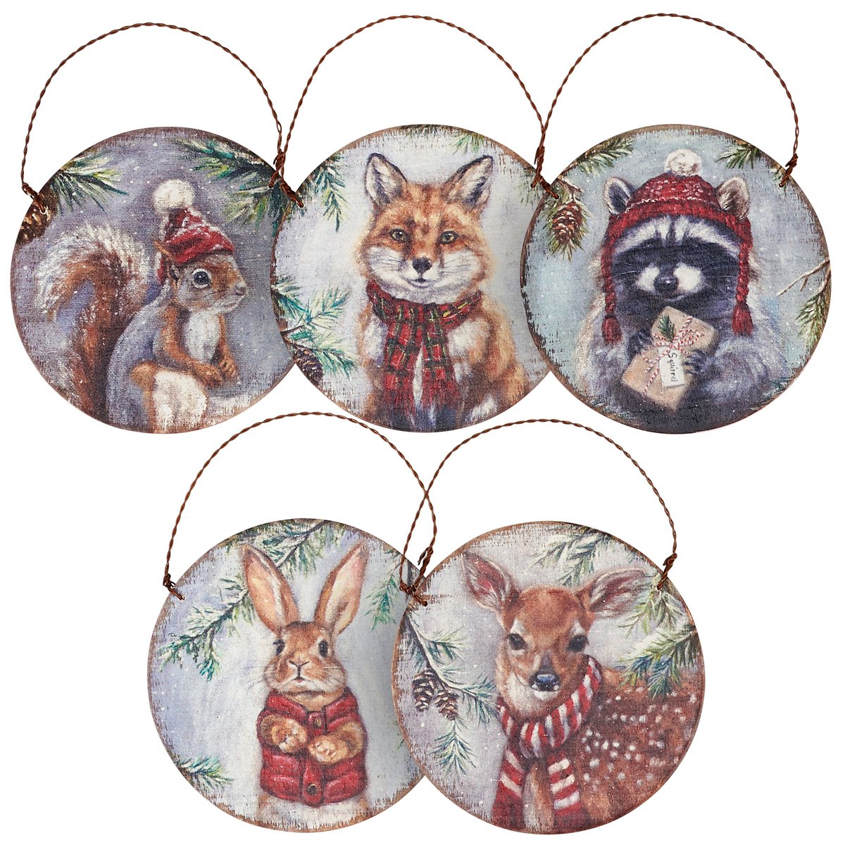 A set of wooden ornaments from our Christmas Collection displaying five charming winter scenes of various woodland animals wearing winter accessories. Designs are replicated from original artwork painted onto burlap canvas, giving the art a unique depth and texture. Seasonal ornaments feature distressed details with coordinating red color on the back. Our Winter Animals ornament set is easy to hang for display via attached twisted wire hangers. Set comes packaged together in a polybag and tied with jute. A rustic set of winter-themed ornaments perfect for seasonal display.
