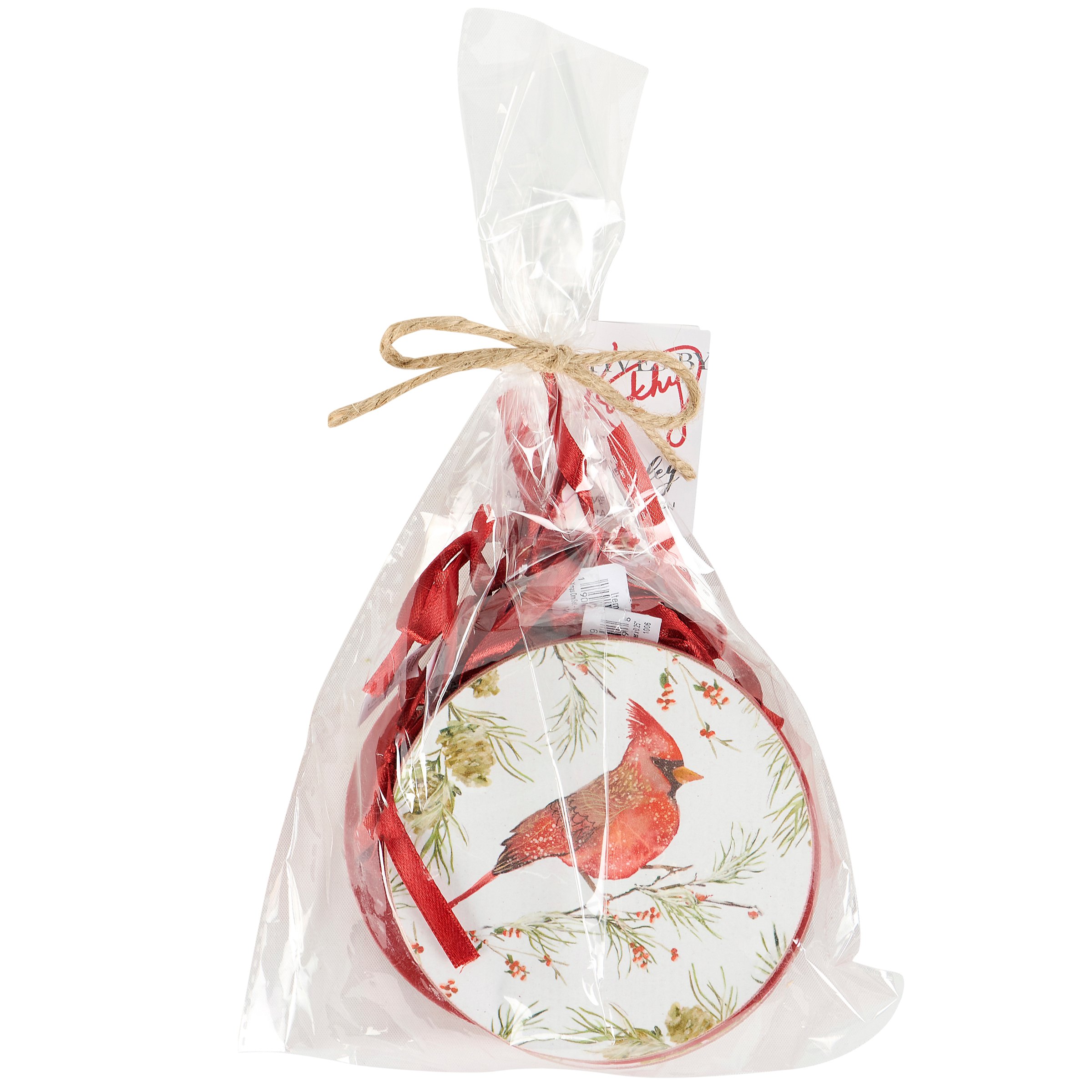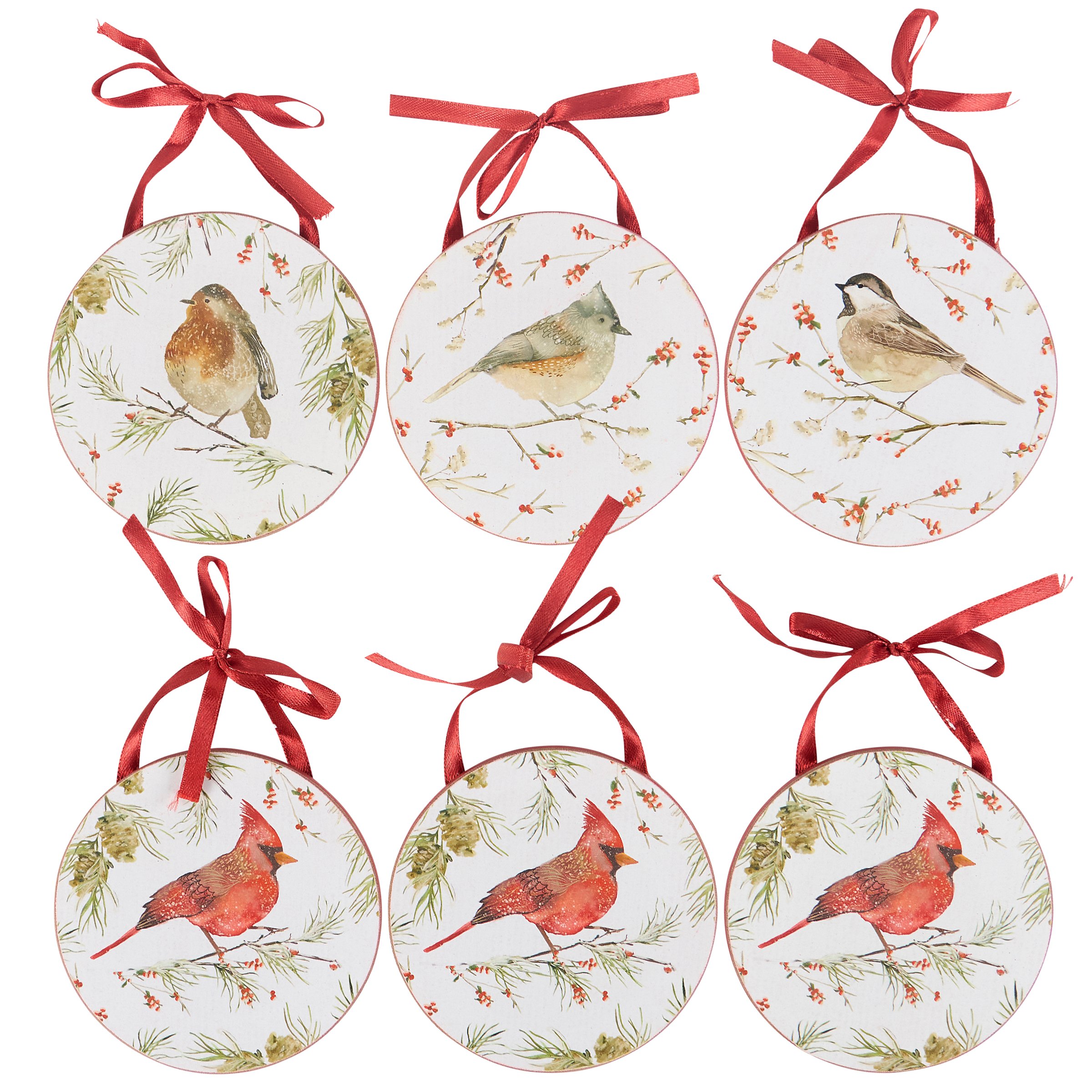 A set of 6 wooden ornaments from our Christmas Collection displaying charming scenes of winter birds on snowy branches including red cardinals and chickadees. Winter bird designs are replicated from original art hand painted in a unique watercolor style. Seasonal ornaments feature coordinating red color on the sides and backs. Our Winter Birds ornament set is easy to hang for display via attached red ribbon hangers. Rustic ornament set comes packaged together in a polybag and tied with jute string. A set of rustic Christmas home accents perfect for a Christmas tree or for seasonal decorating.
