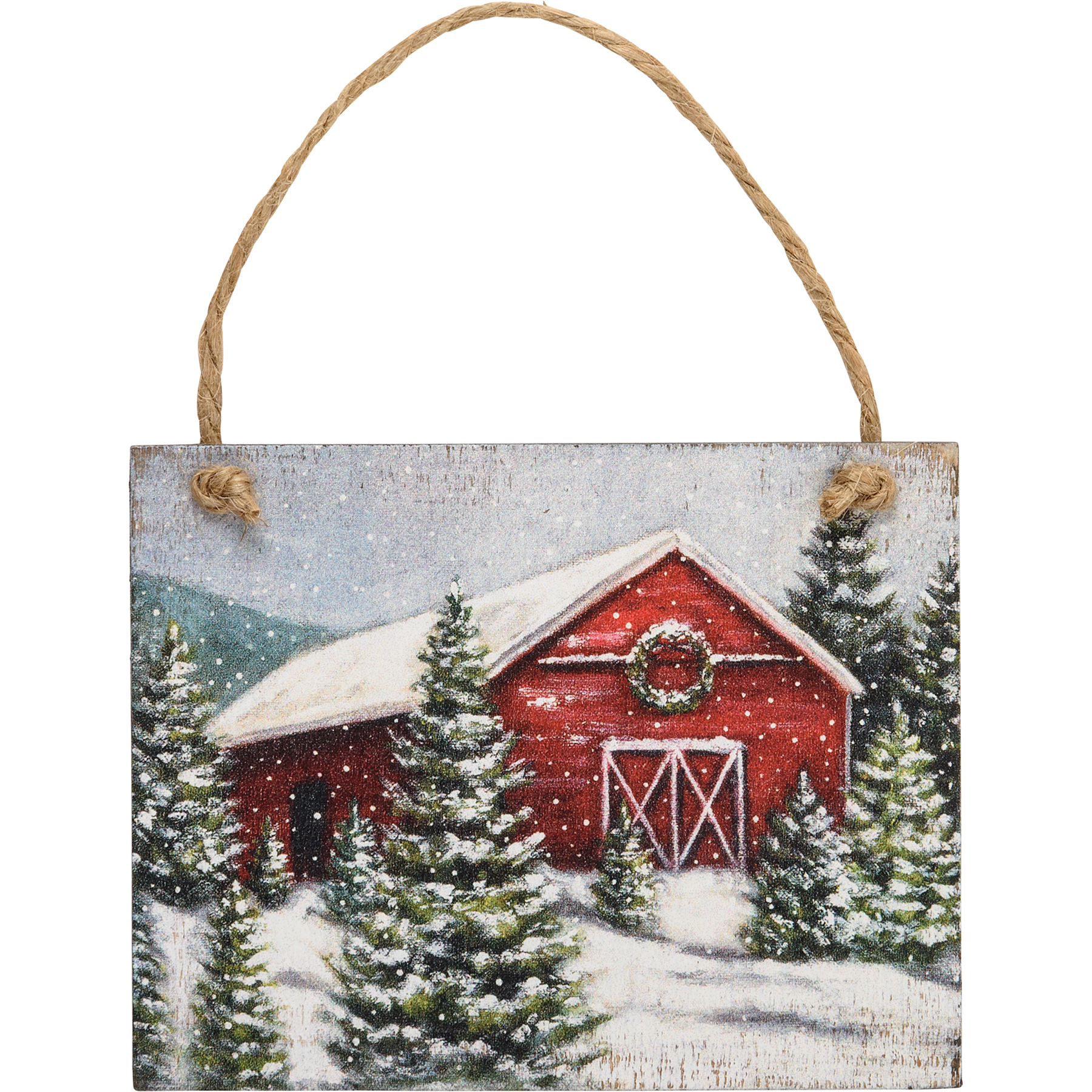 A set of three wooden ornaments from our Christmas Collection featuring wintry farm scene designs. Designs are replicated from original artwork painted onto burlap canvas, giving the art a unique depth and texture. These Wintry Farm Christmas Ornaments hang via attached jute ribbon.