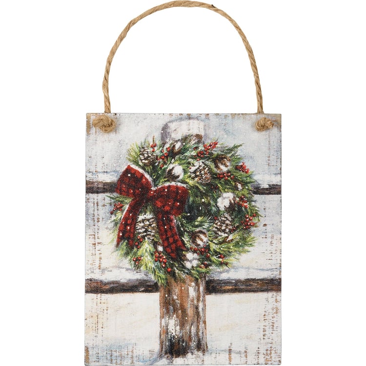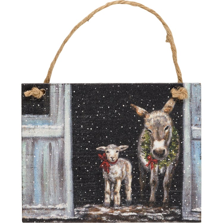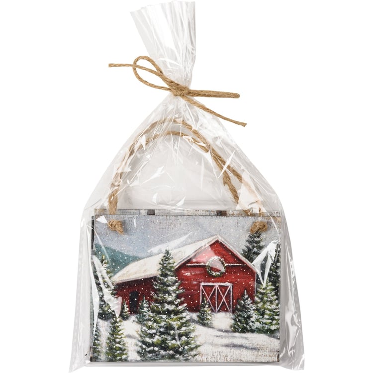 A set of three wooden ornaments from our Christmas Collection featuring wintry farm scene designs. Designs are replicated from original artwork painted onto burlap canvas, giving the art a unique depth and texture. These Wintry Farm Christmas Ornaments hang via attached jute ribbon.