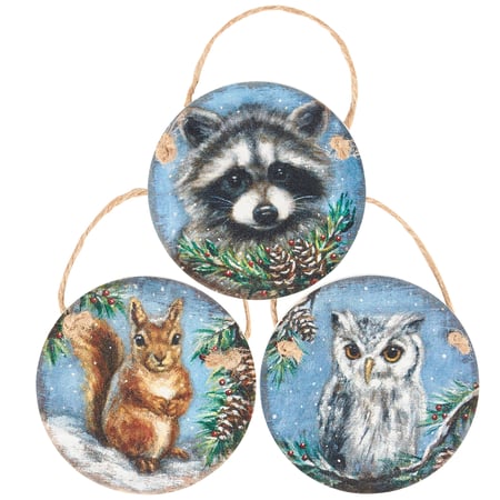 A set of 3 wooden ornaments from our Christmas Collection displaying charming snowy scenes of woodland animals including a raccoon, a squirrel, and an owl. Winter animal designs are replicated from original artwork painted onto burlap canvas, giving the art a unique depth and texture. Seasonal ornaments feature distressed details with coordinating cream color on the sides and backs. Our Winter Friends ornament set is easy to hang for display via attached jute hangers. Rustic ornament set comes packaged together in a polybag and tied with jute string. A set of rustic Christmas home accents perfect for a Christmas tree or for seasonal decorating.