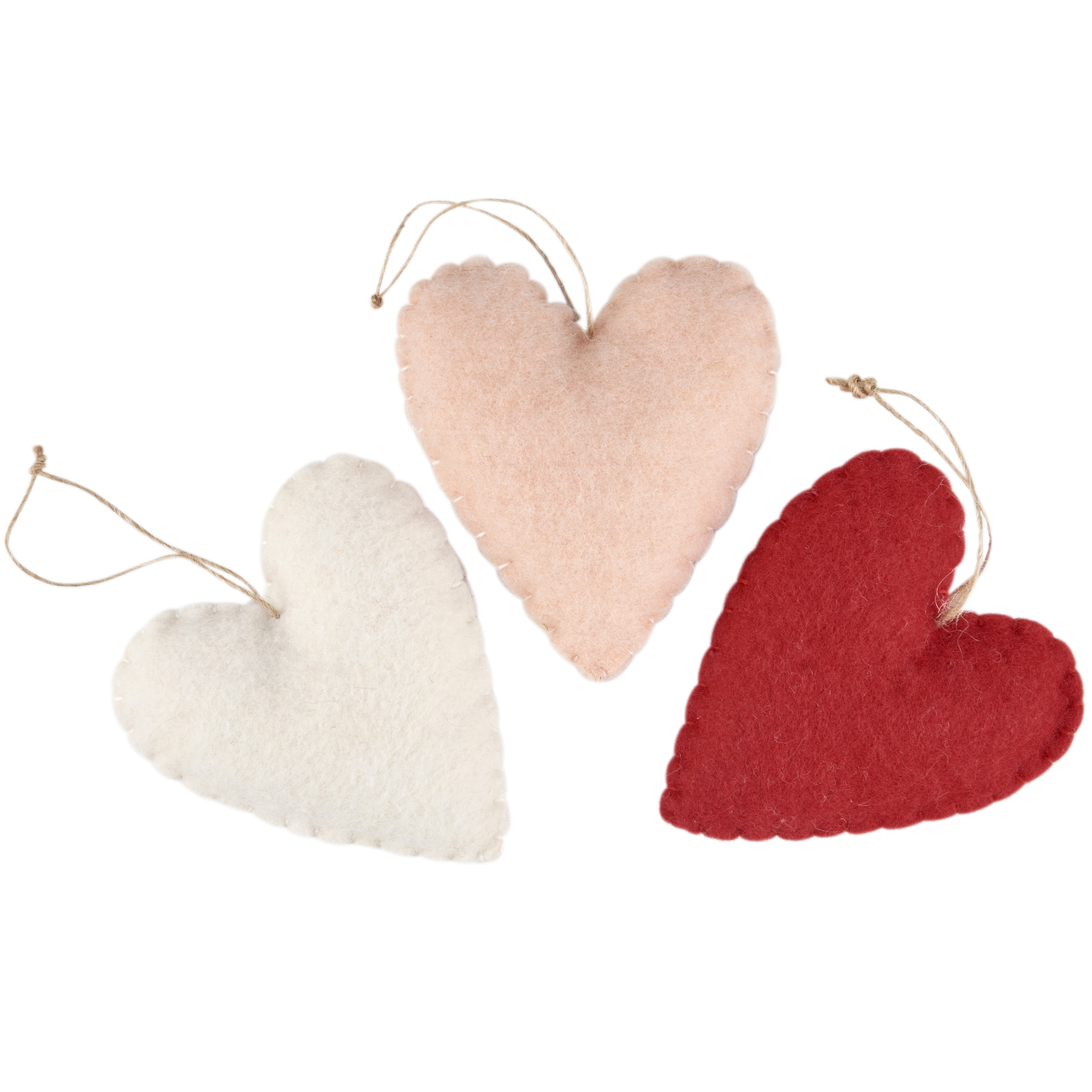 A set of three decorative ornaments from our Valentine's Day Collection featuring different color hearts made with felt and stitched details for a handmade appearance. Ornaments display individual love-themed sentiments that read "Hugs," "XOXO," and "Love." Our XOXO ornament set is easy to hang via attached string hangers. A fun set of Valentine's Day ornaments perfect for seasonal display.