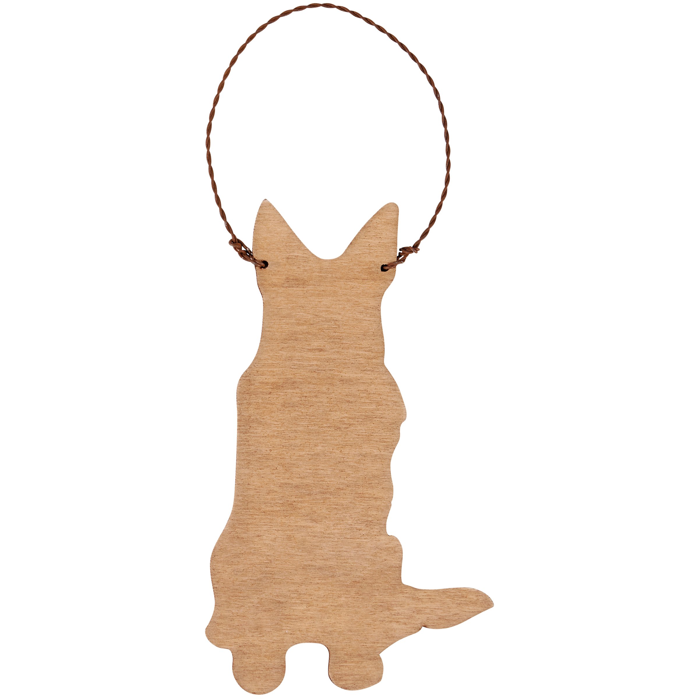 A wooden ornament from ourĀ Christmas Collection cut in the shape of the displayed holiday dog design featuring a charming German shepherd wearing a Christmas wreath with a candy cane in its mouth. Design is replicated from original artwork painted onto burlap canvas, giving the art a unique depth and texture. Seasonal ornament features distressed details with coordinating natural wood on the sides and back where it can be personalized with owner's pet name and details. Our German Shepherd Candy Cane ornament is easy to hang for display via attached twisted wire hanger. A fun holiday gift combining a love of Christmas and pets.