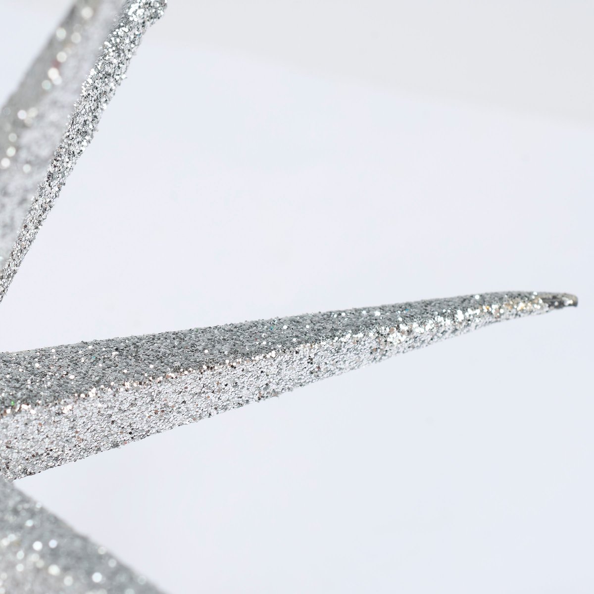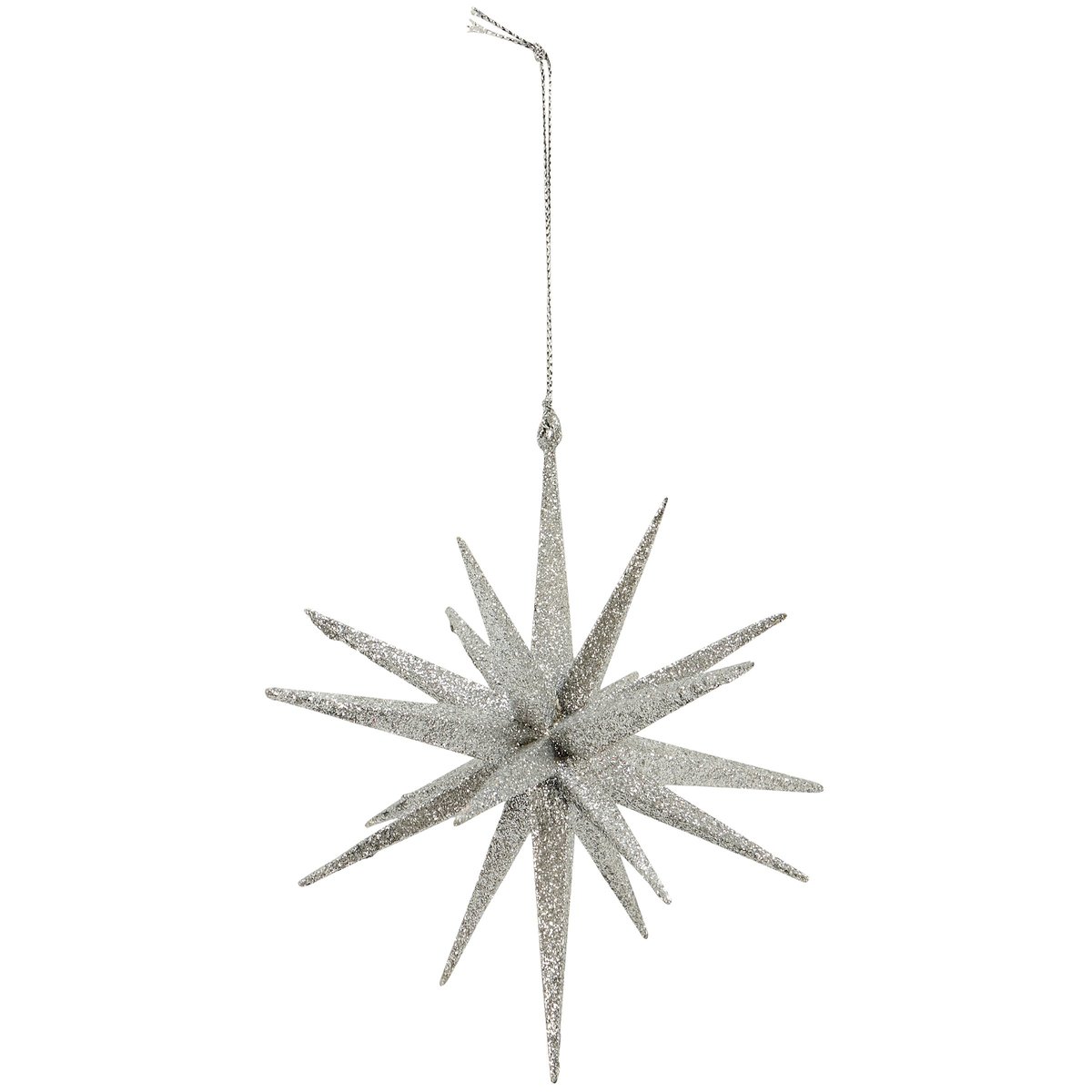 A decorative ornament from our Christmas Collection displaying a sculpted starburst design with silver glitter finish for added interest. Our Silver Starburst ornament is easy to hang for display via attached string hanger. A stylish Christmas home accent perfect for a Christmas tree or for seasonal decorating.