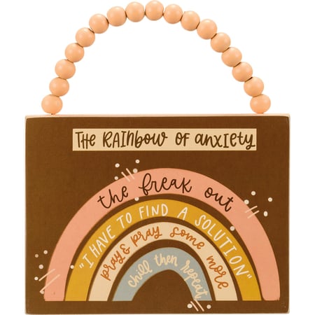 A wooden ornament from our Bohemian Collection features a terracotta tone palette and rainbow design with "The Rainbow Of Anxiety," "The Freak Out," "'I Have To Find A Solution,'" "Pray & Pray Some More," and "Chill Then Repeat" sentiments. The Anxiety ornament is easy to hang via decorative wood bead hanger.